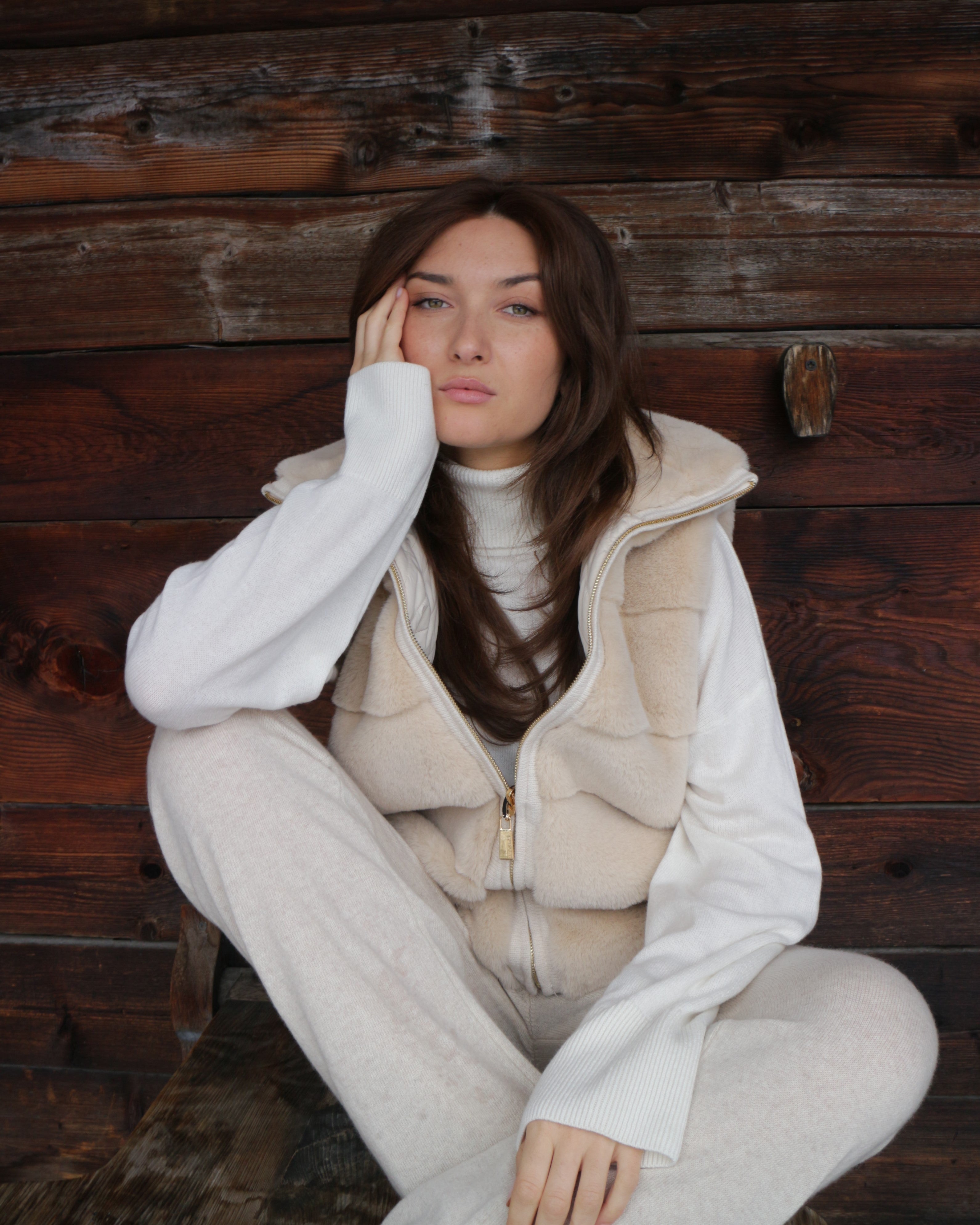 A l'abri du froid lovée dans la fausse fourrure douce et soyeuse de sa veste sans manches DAMARIS en Furever, Eva s’offre une balade en altitude ponctuée d'une pause gourmande.