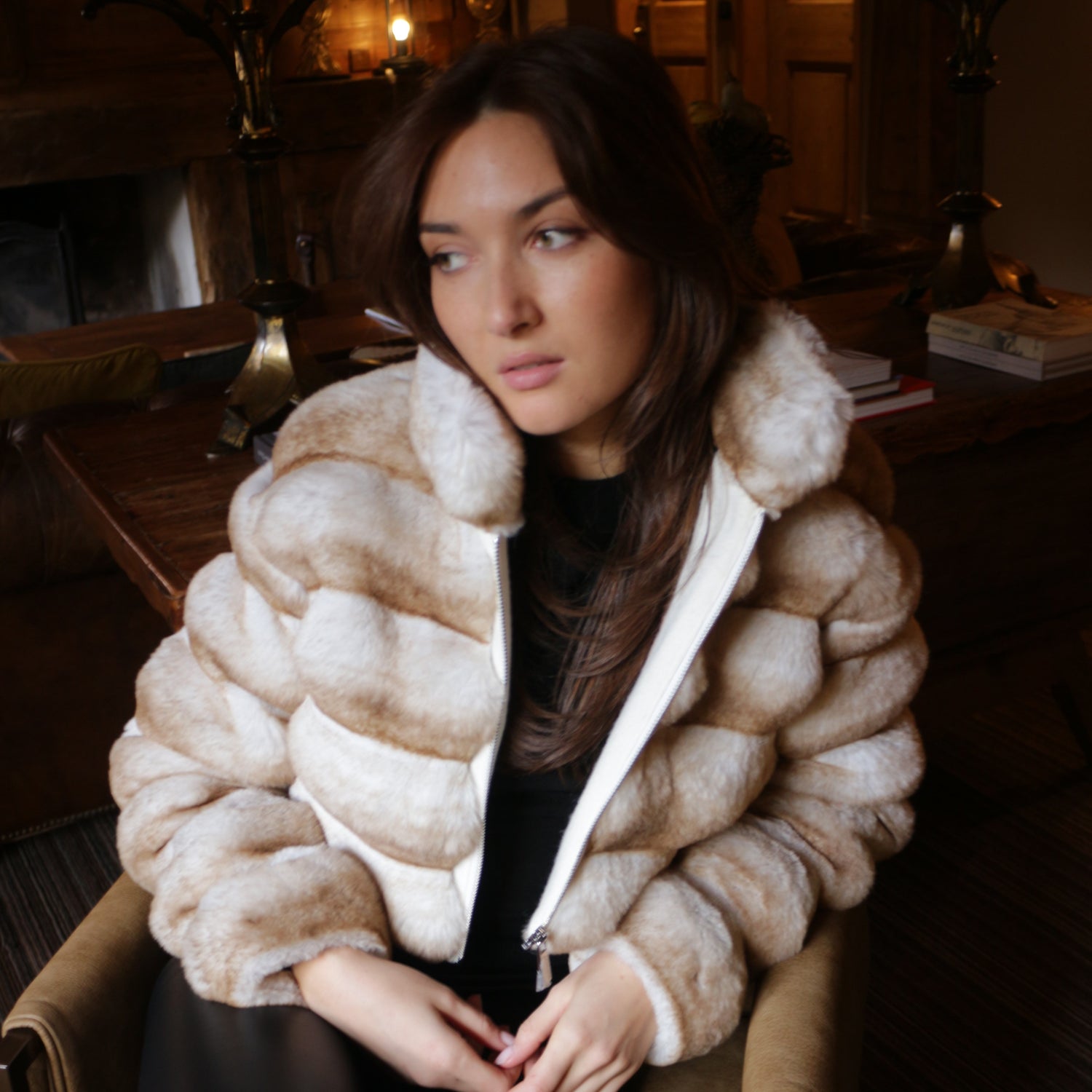 Son coup de cœur ? Le bar de l'hôtel Les Fermes de Marie, à l’atmosphère cosy et aux matières chaleureuses, où l'énergie inspirante de la montagne imprègne chaque recoin. Elle aime s’y rendre vêtue de sa veste courte en fausse fourrure MANEL dont la teinte noisette se fond avec les tons sobres et tabac du lieu.