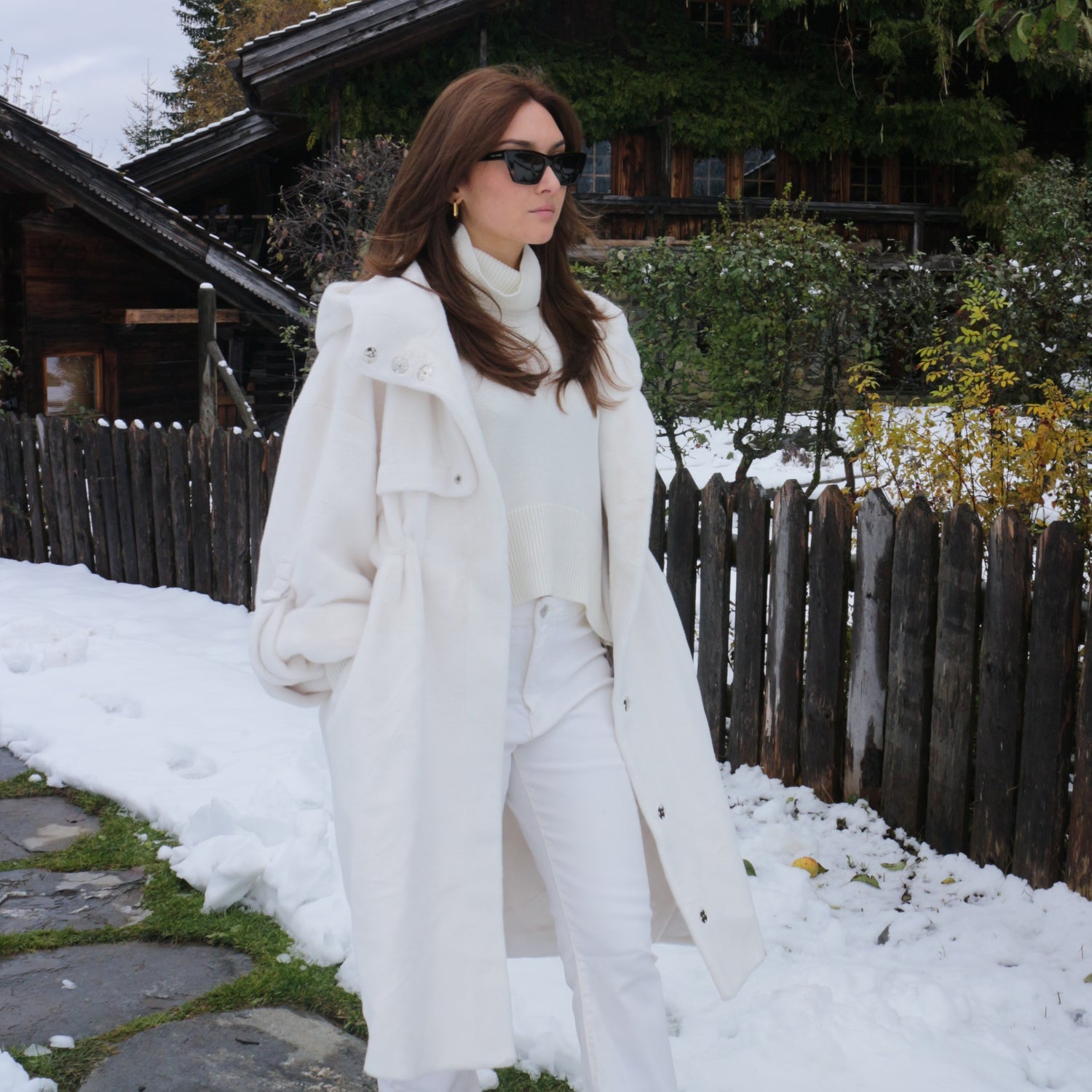 Pour flâner dans le vieux centre-ville de Megève et apprécier la beauté des ruelles médiévales du village, Eva a choisi le manteau mi-long à capuche MYER. Réalisé dans une somptueuse fausse fourrure Furever blanche plus vraie que nature, cette pièce à la texture fluffy est un véritable cocon protecteur.