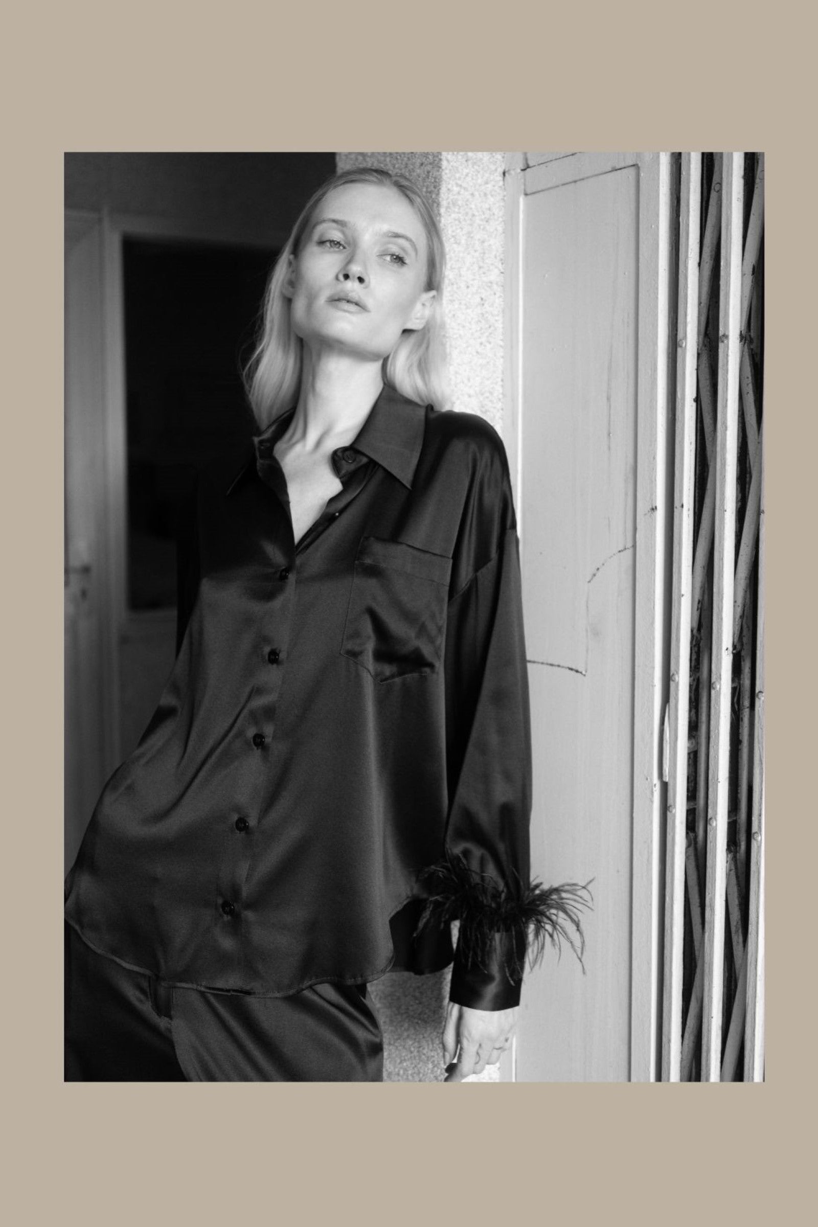 Ligne aérienne et fluide, chemisier à la coupe classique comme notre iconique modèle LEVY, ou orné de plumes délicates, caraco à fines bretelles en soie et dentelle.