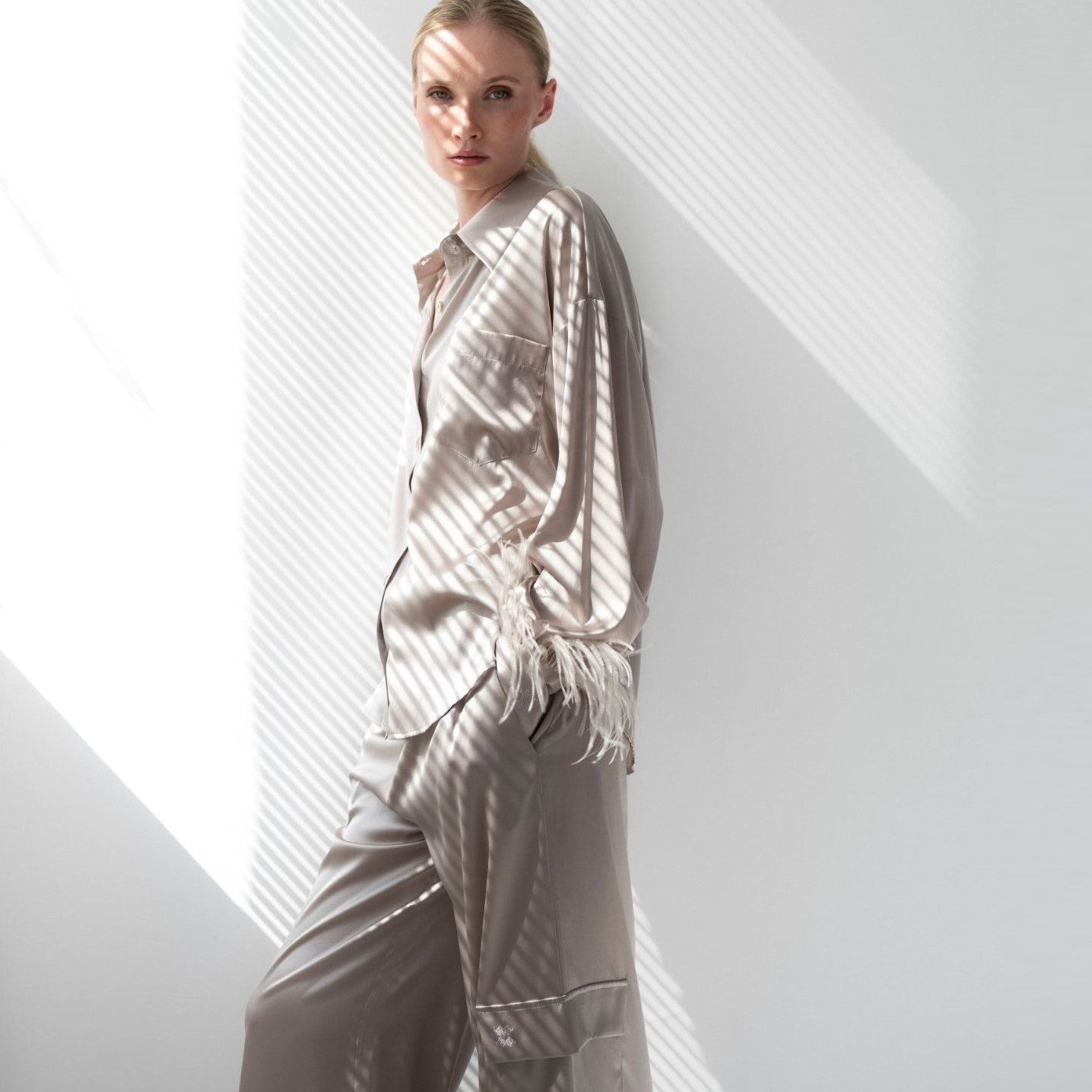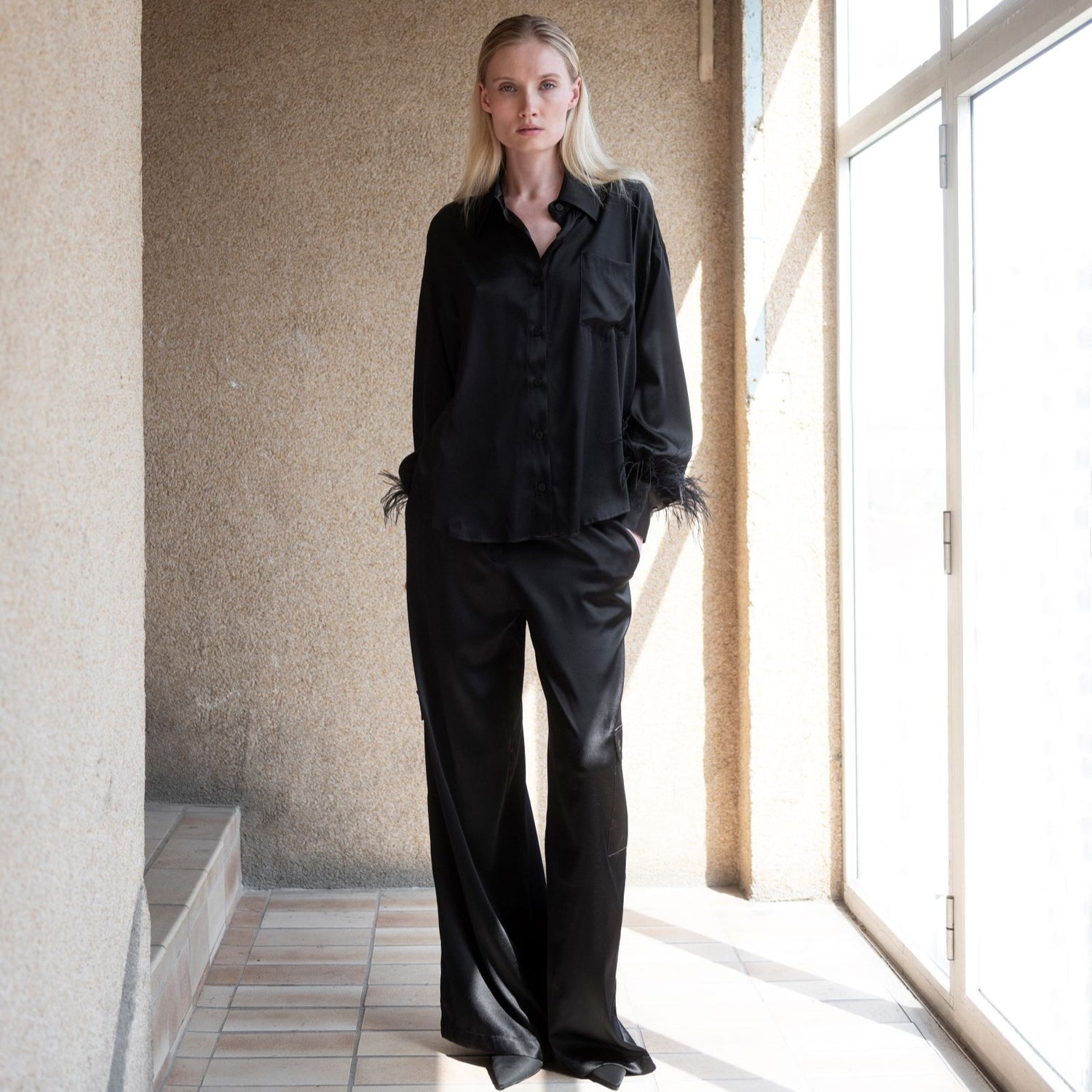 Cette silhouette à l'origine simplissime, a su se réinventer : le pantalon est paré de poches cargo et d'une bande en lurex à la taille, et la chemise en soie est ornée de plumes d'autruches aux manches pour une élégance glam'. Versatile, cet ensemble en soie pour femme offre une élégance sobre ou se transforme facilement en une silhouette grand soir à l'aide de quelques accessoires. Un joli sac, un sautoir ou une paire d'imposantes boucles d'oreilles dorées… Et le tour est joué.