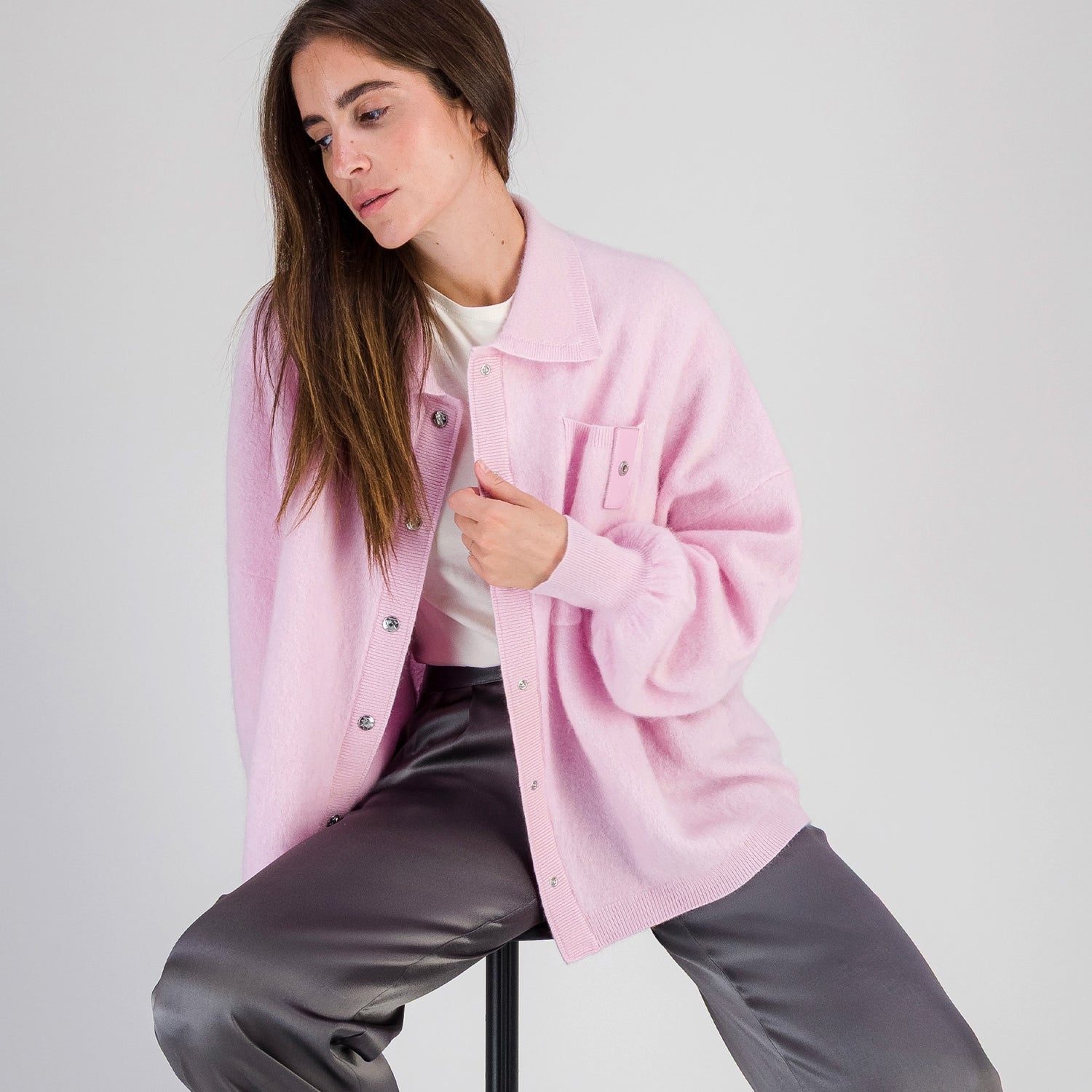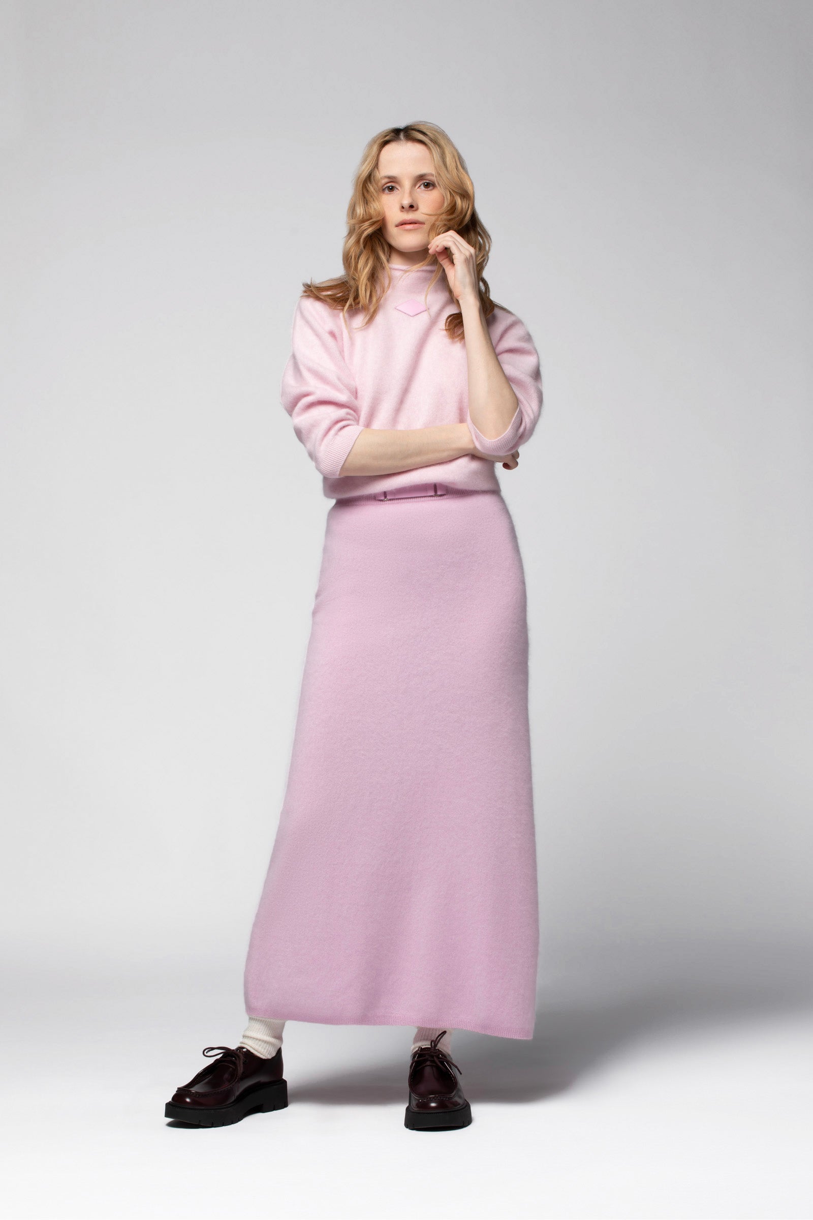 Le cachemire rose s’invite ainsi sur des créations incontournables — pulls en cachemire, surchemises oversize en maille Signature, jupes colonnes, bonnets et écharpes en cachemire — où la douceur de la maille de luxe rencontre l’élégance des détails en cuir ou en soie.
