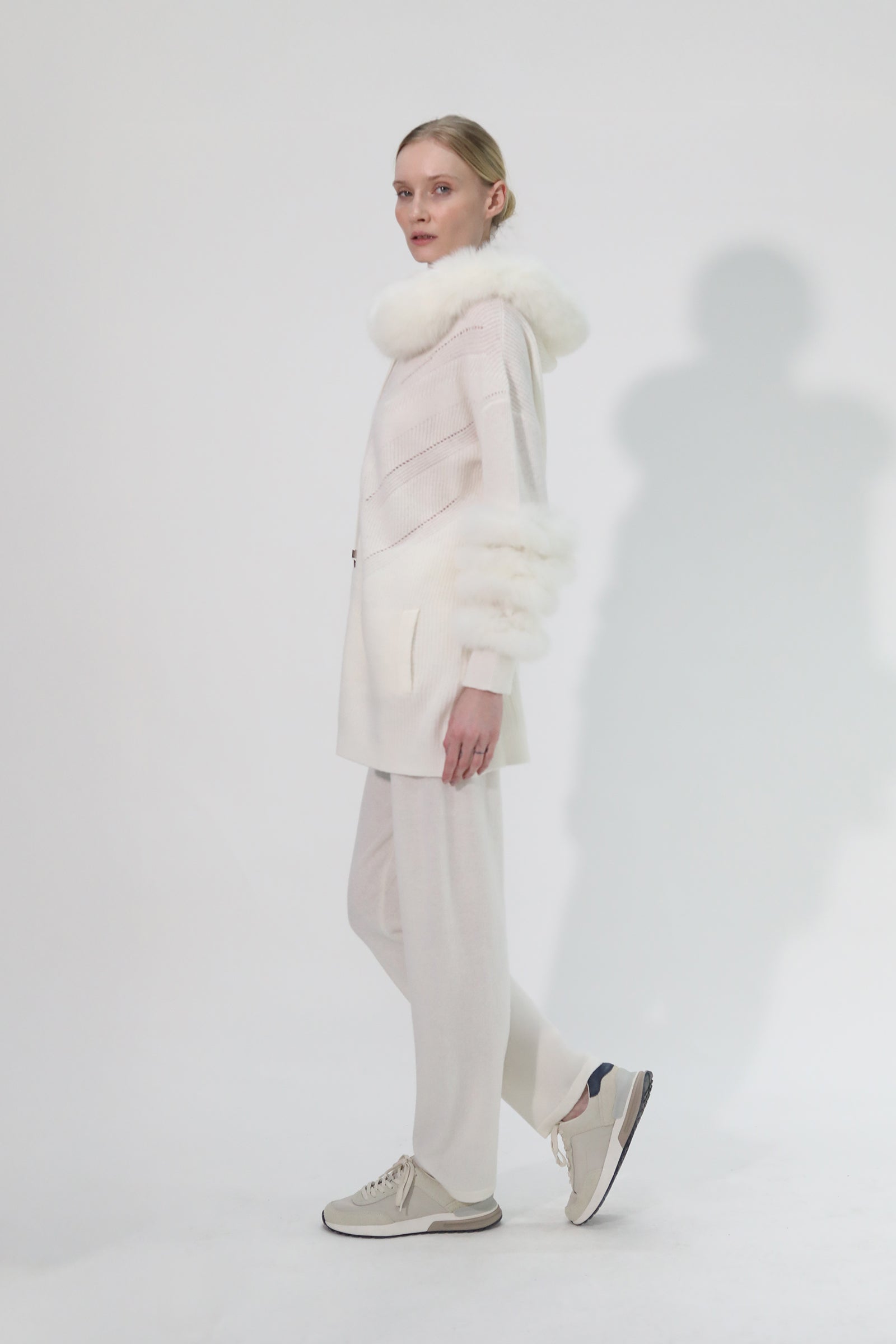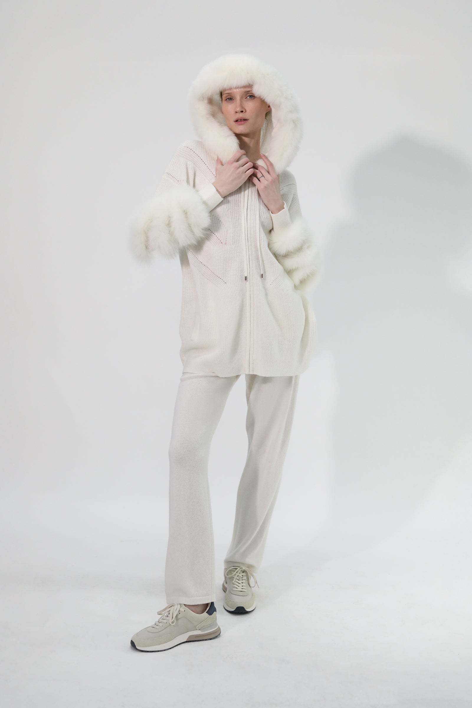 Avec sa teinte blanche éclatante et ses luxueux détails en fourrure de renard, aux manches et à la capuche, notre gilet NIKITA s'impose comme le parfait essentiel de l'hiver. Confectionné en pur cachemire, il se distingue par un jeu de maille texturée et ajourée qui apporte féminité à ses lignes sportwear : coupe droite mi-longue, capuche avec cordon et fermeture zippée.