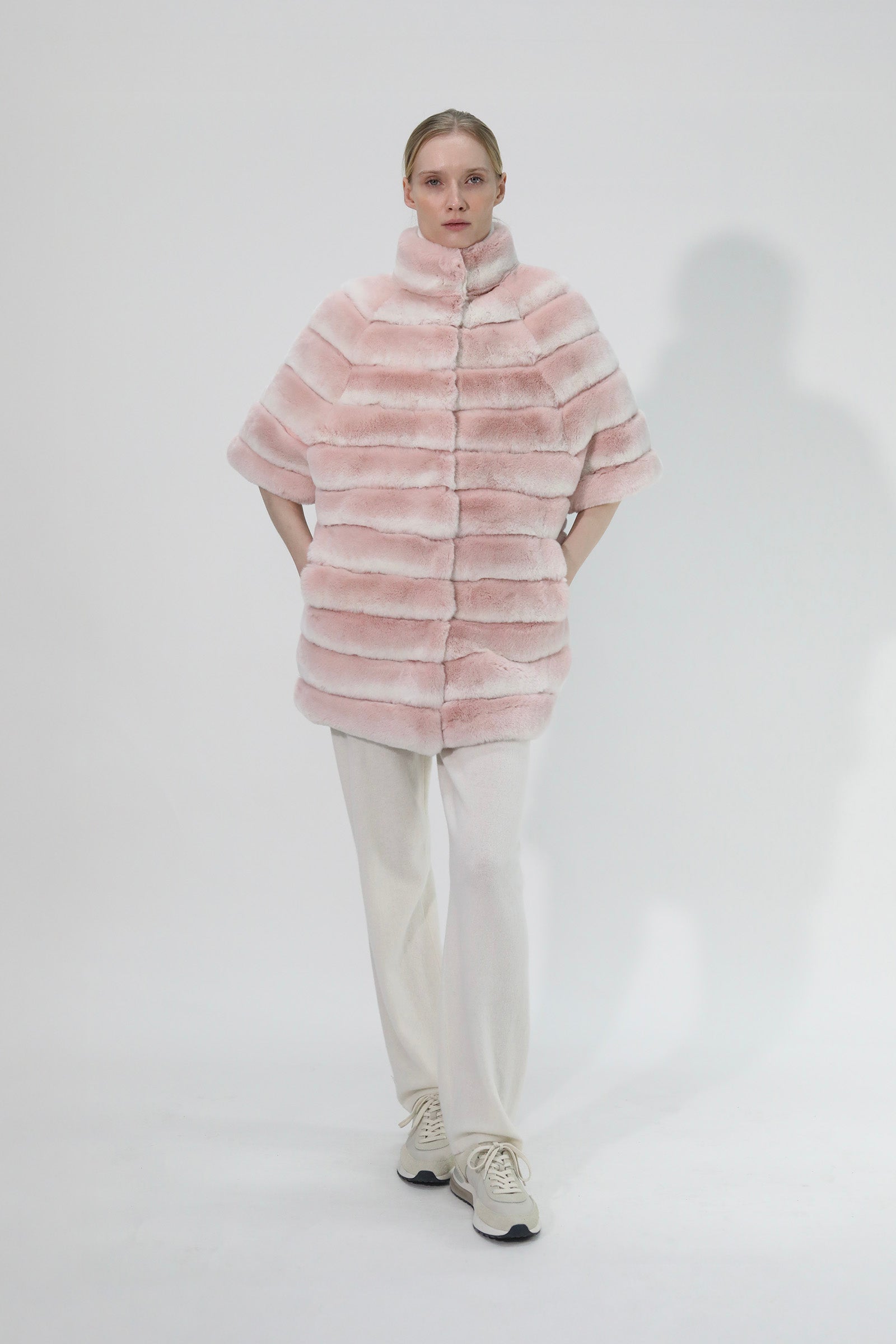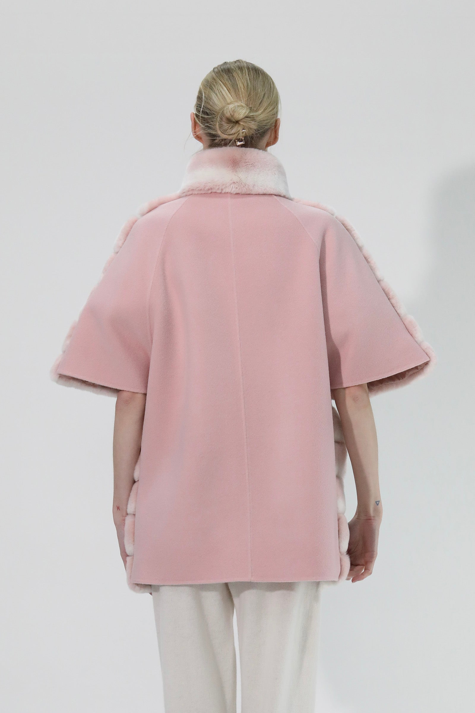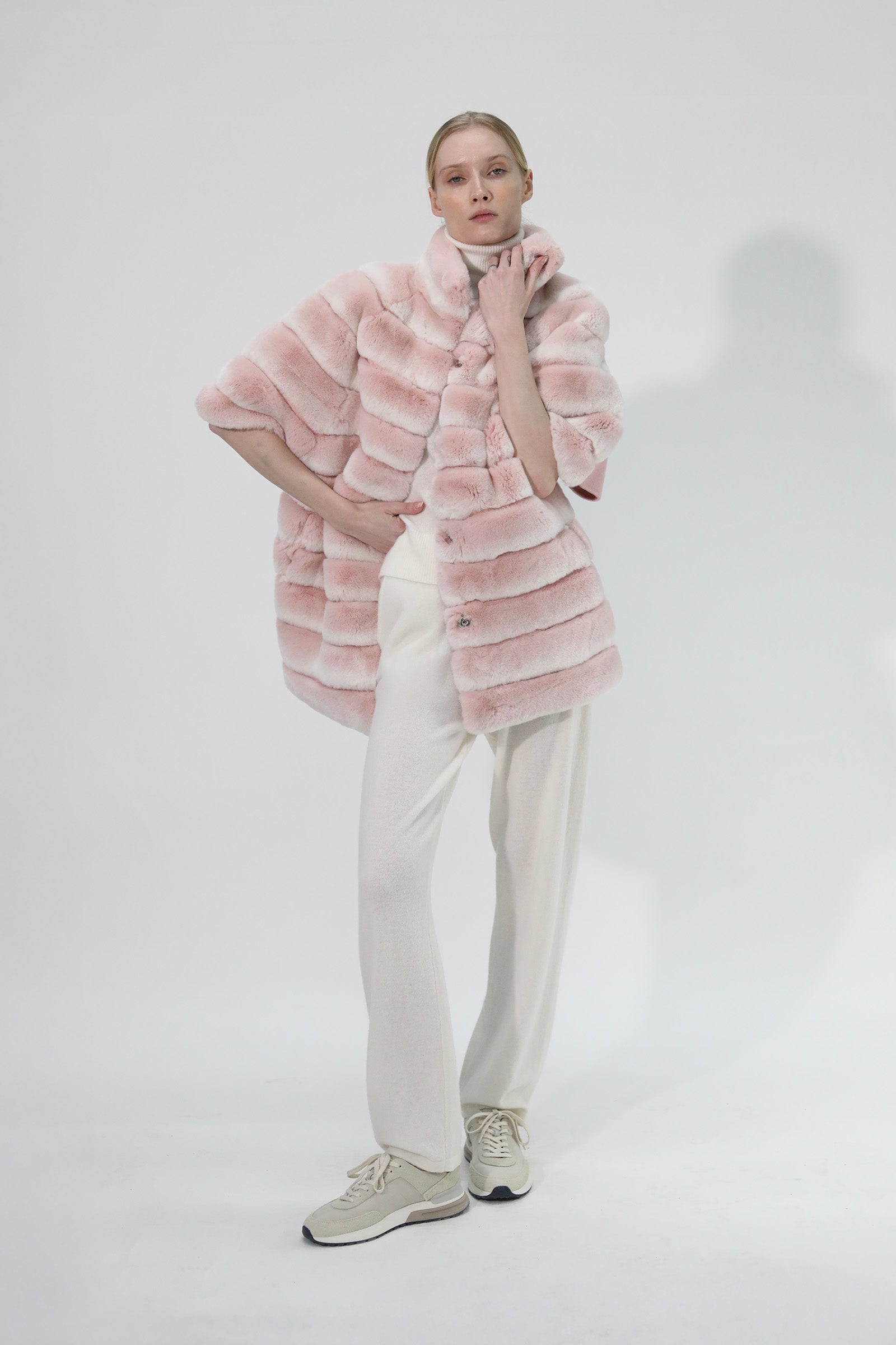 Véritable bijou de savoir-faire, notre manteau VRAM se distingue par son design bi-matière. Sur le devant, une somptueuse fourrure de lapin Rex sculpte l'allure avec raffinement. Au dos, un drap de laine et cachemire offre un tombé parfait. Avec ses manches courtes, son col montant et son volume enveloppant, il casse les codes de l'outwear traditionnel et propose une silhouette résolument contemporaine. Pratique, il dispose de deux poches discrètes sur les côtés et se ferme grâce à des boutons invisibles.
