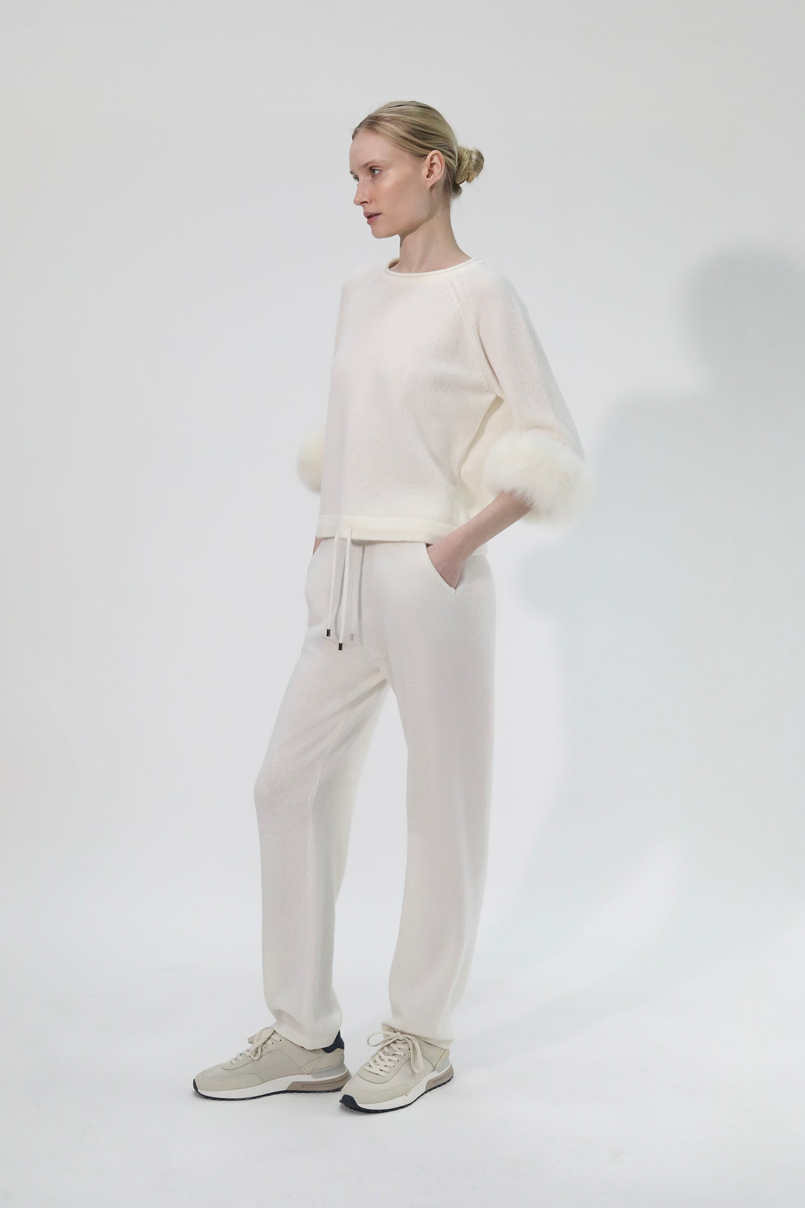 Notre pull en cachemire LYAM signe une allure casual-chic upgradée. Avec sa coupe droite, son col rond et ses manches trois-quarts raglan, il s'impose comme un indispensable du vestiaire féminin. Son design sportwear, soulignée par un cordon à la base, est féminisé par de luxueux manchons en fourrure de renard, ultra duveteux, qui insufflent une touche de raffinement irrésistible.