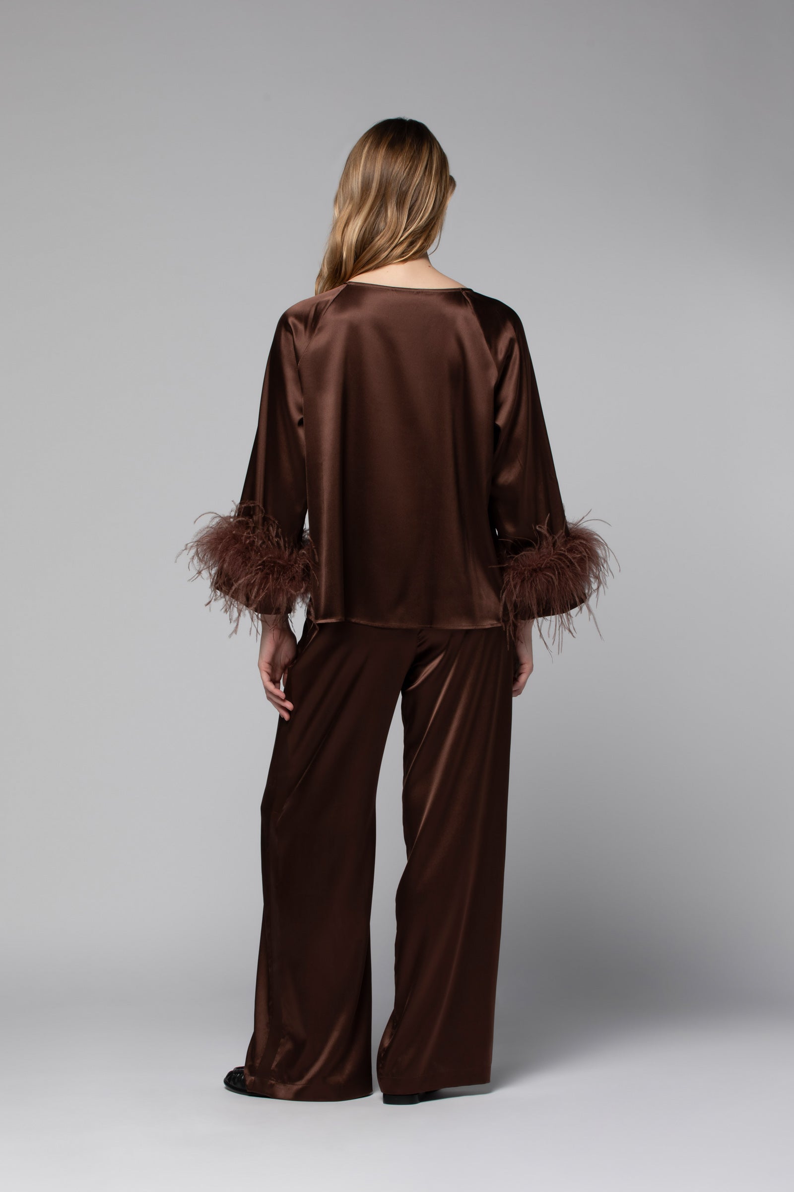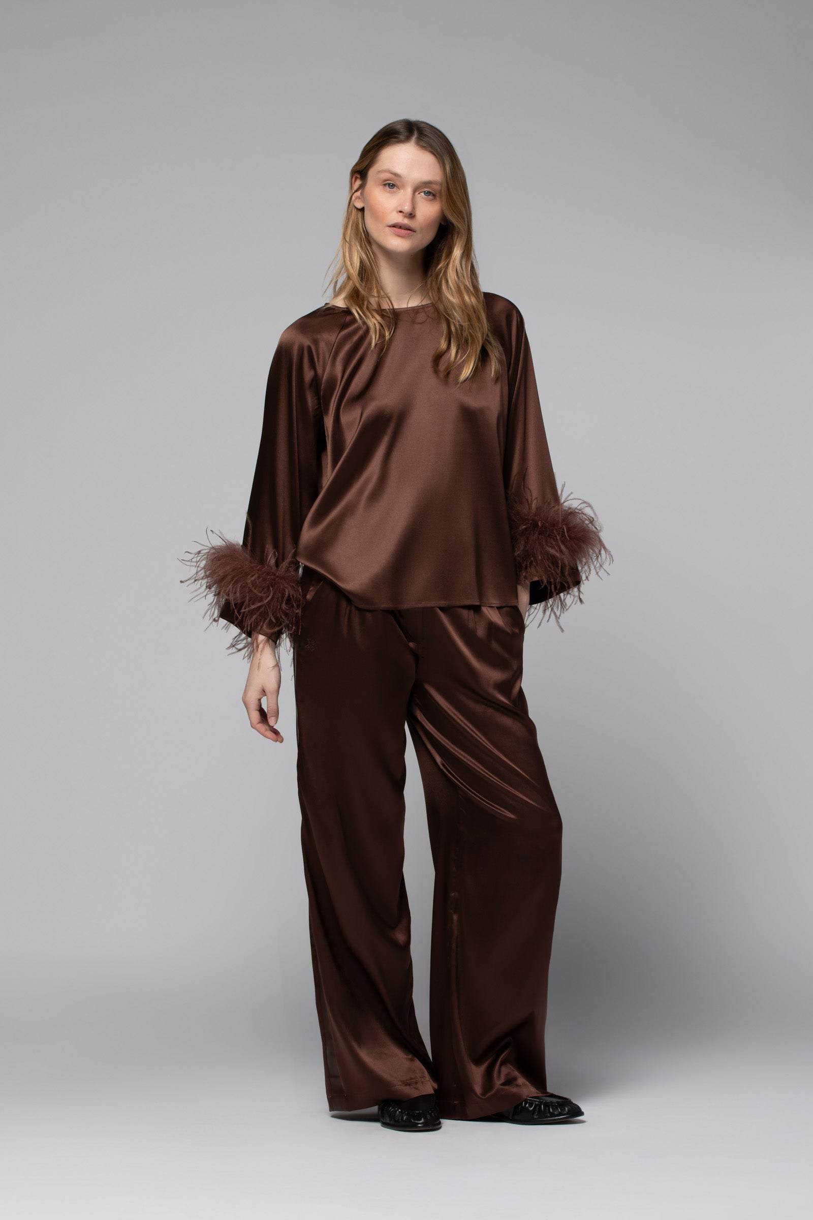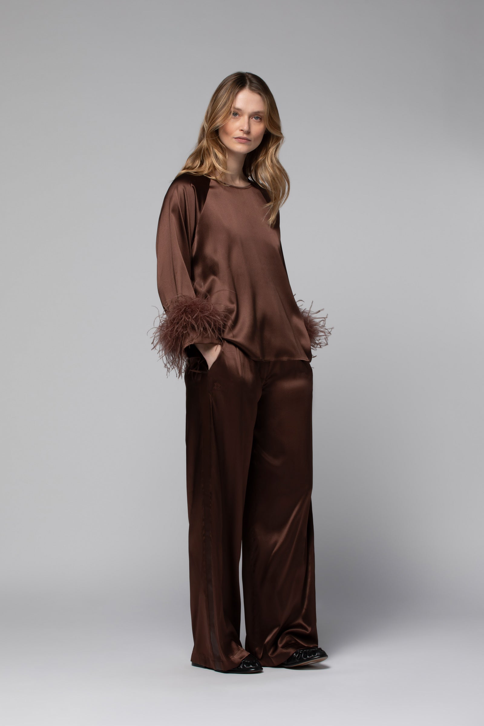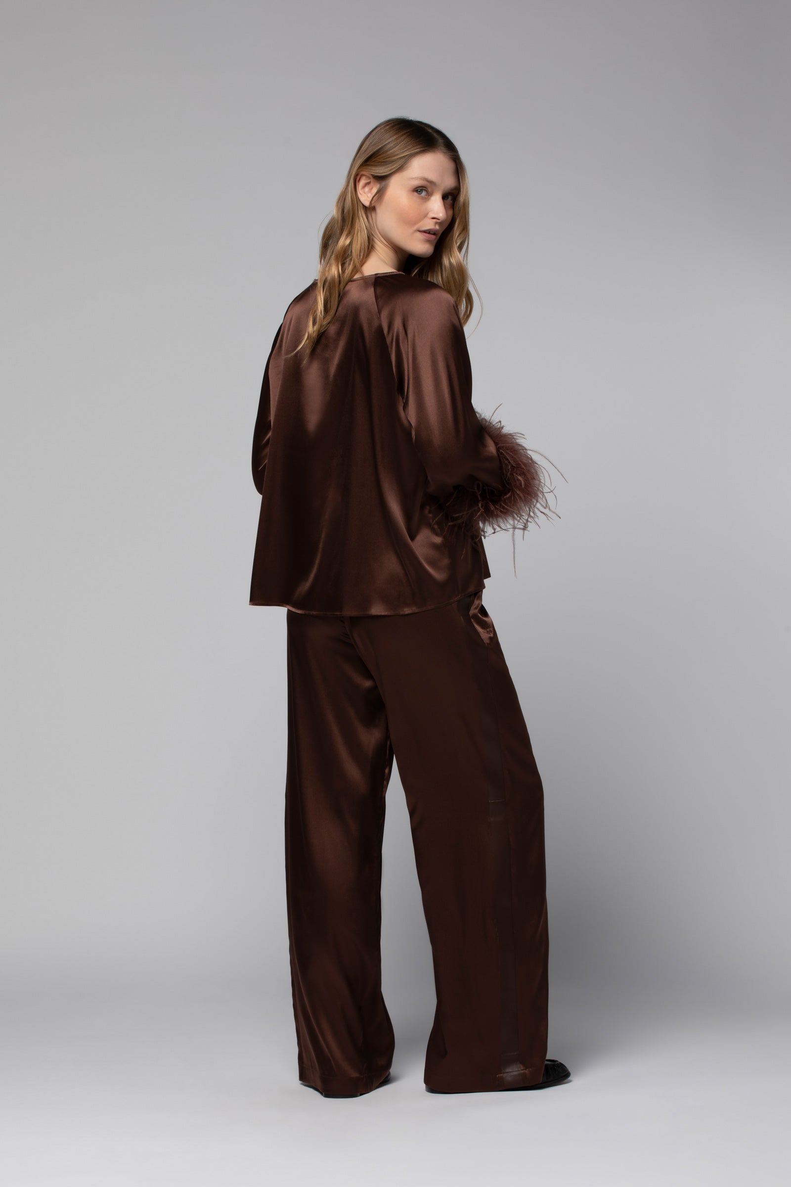 Ce pantalon en soie pour femme est proposé en gris anthracite, noir, chocolat et latte.