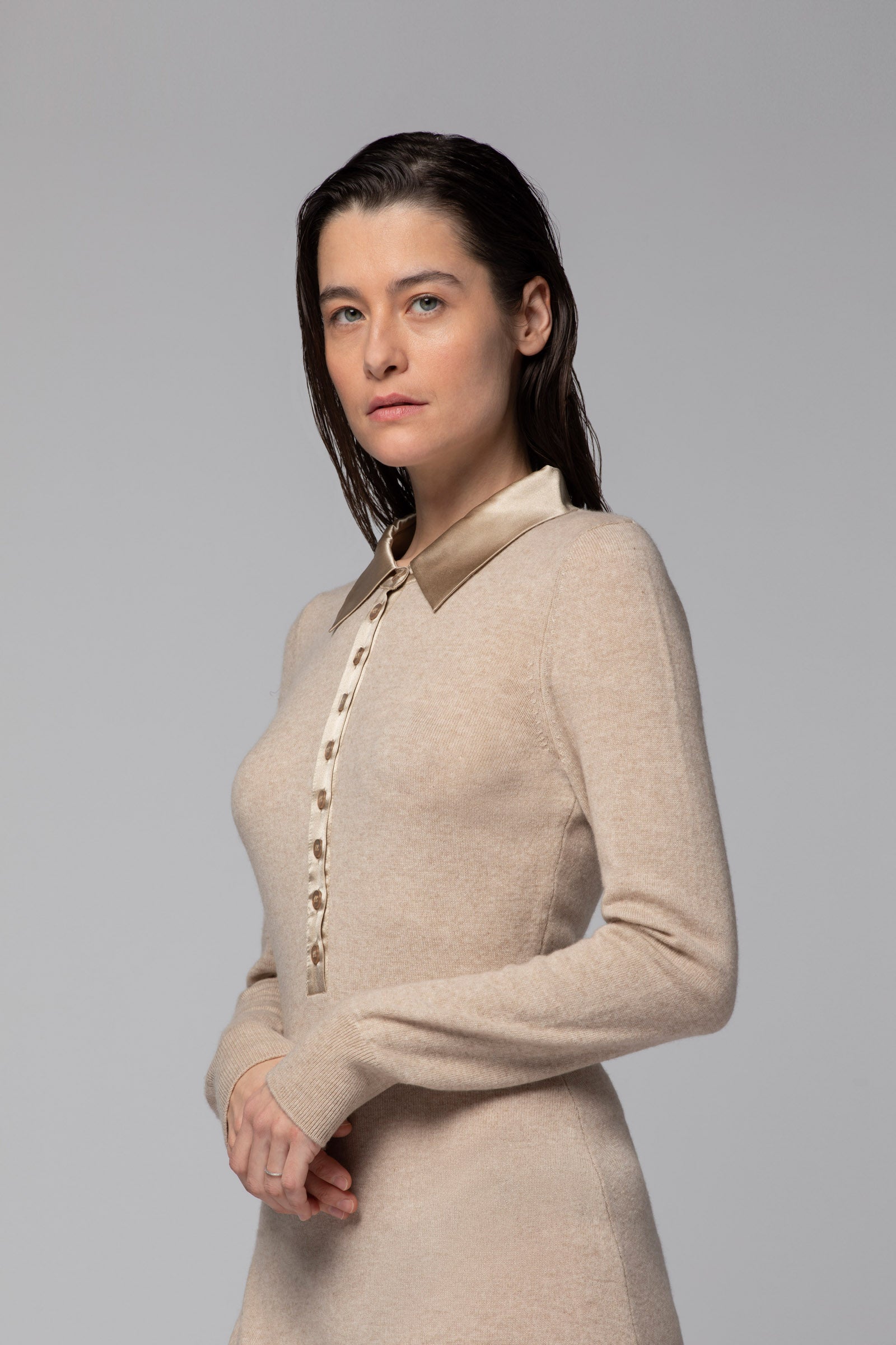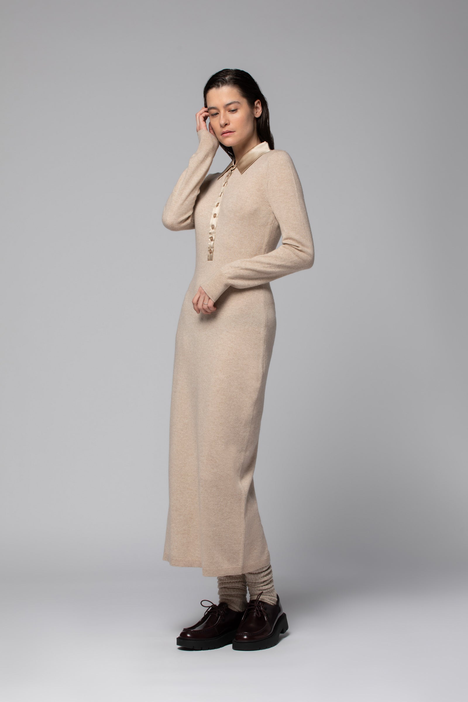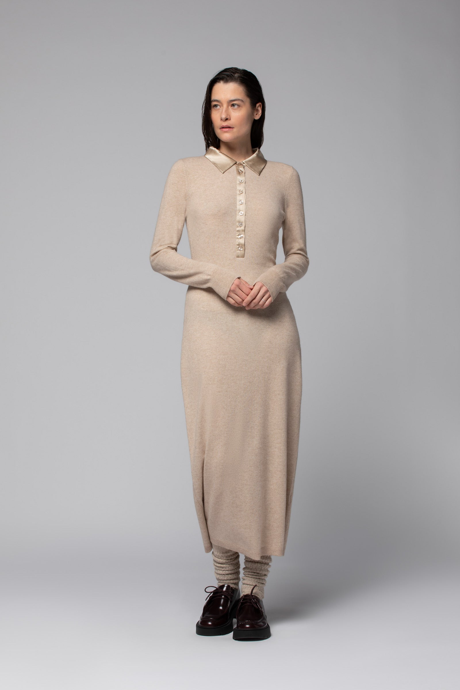 Robe longue en laine et cachemire avec col polo en soie