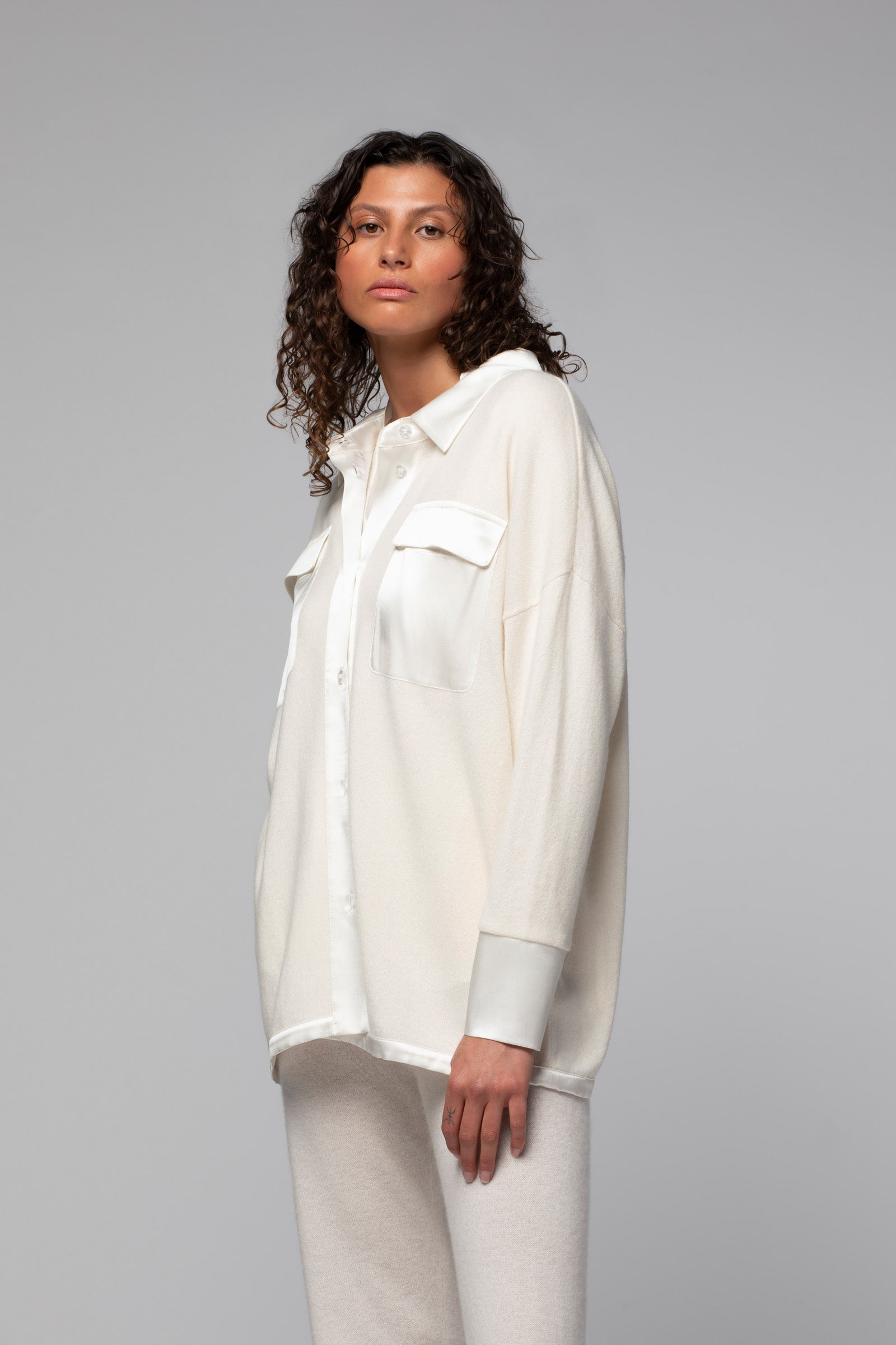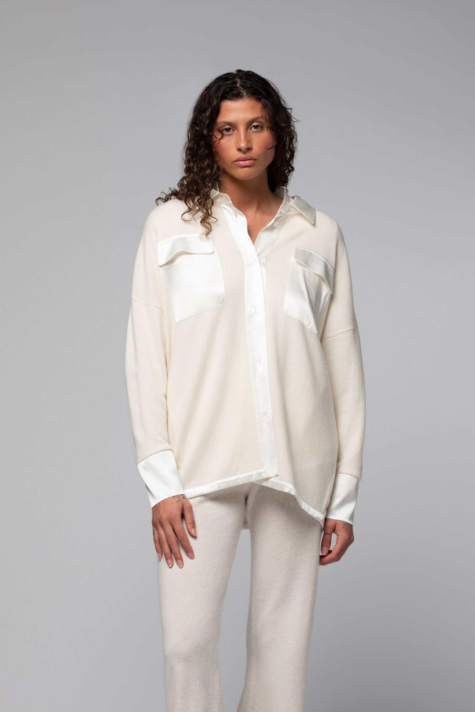 Volume oversize, épaules tombantes, finitions satinées : notre chemise en maille LONIE signe une allure décontractée, un brin nonchalante, mais toujours élégante. Confectionnée dans un doux mélange de laine et cachemire, elle joue la carte du contraste avec ses empiècements en soie qui apportent une touche d'éclat subtile et habillent son col chemise, sa patte de boutonnage, ses poignets et ses poches plaquées à rabats sur la poitrine.