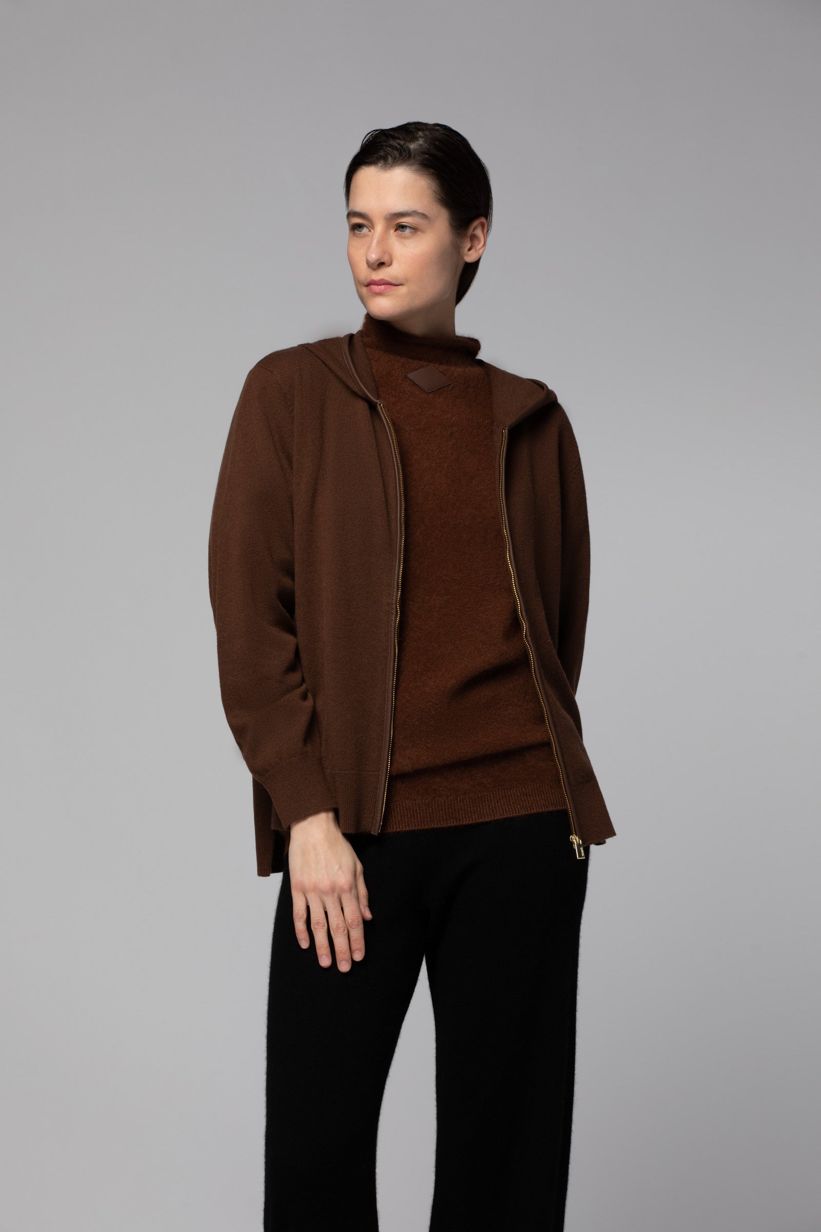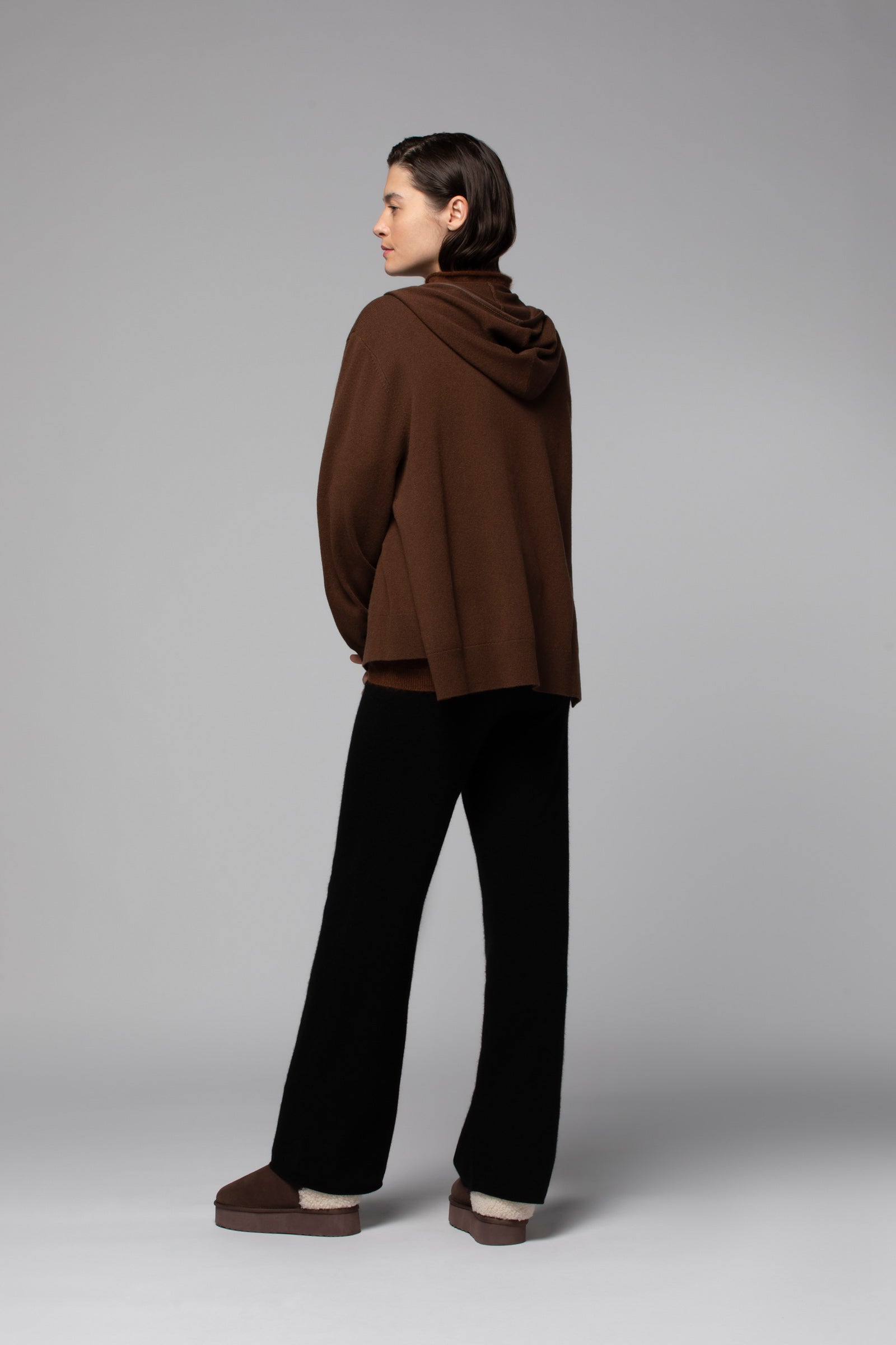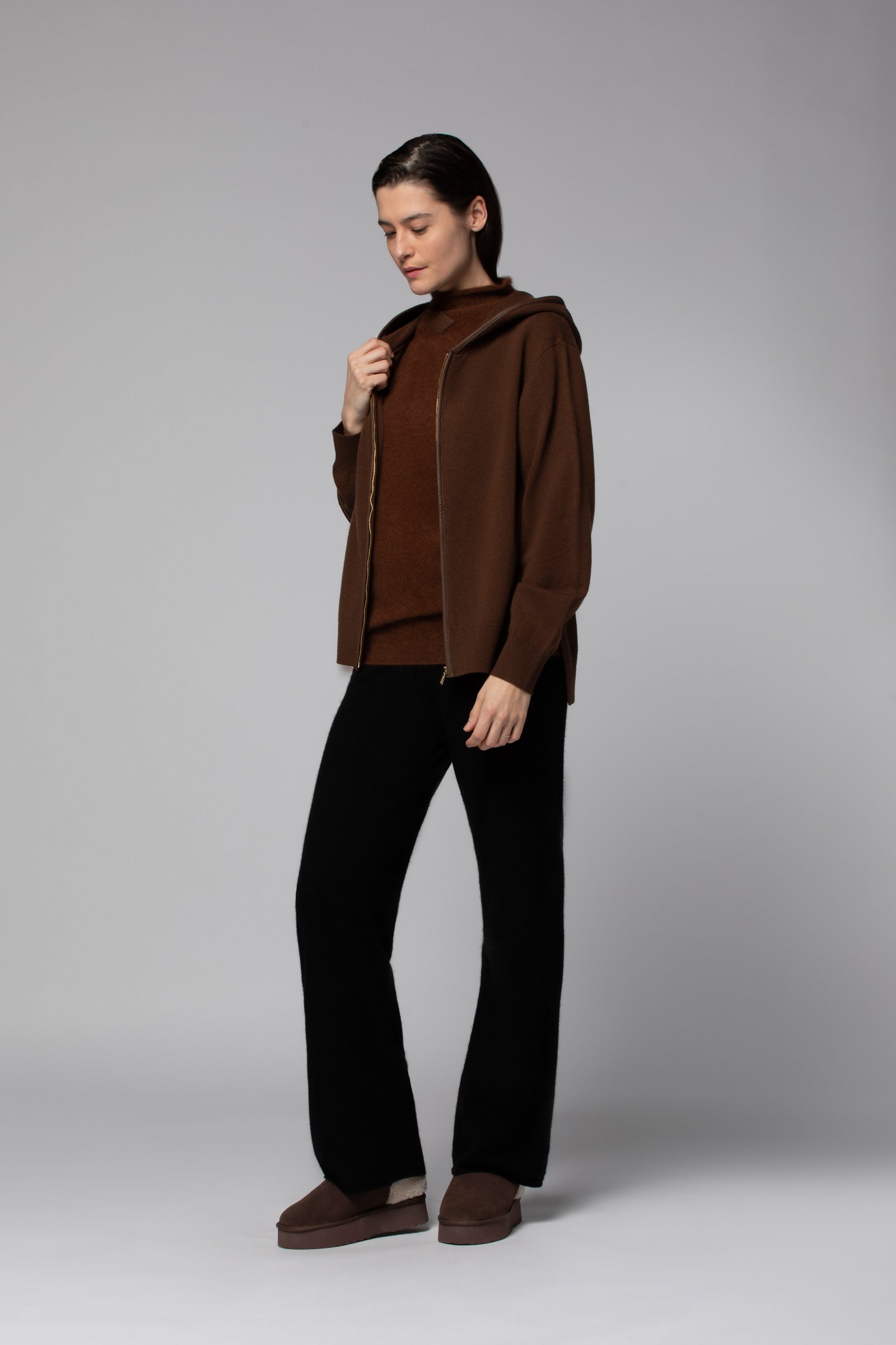 Ce gilet à capuche pour femme est décliné dans une large palette de nuances : noir, chocolat, gris et latte.