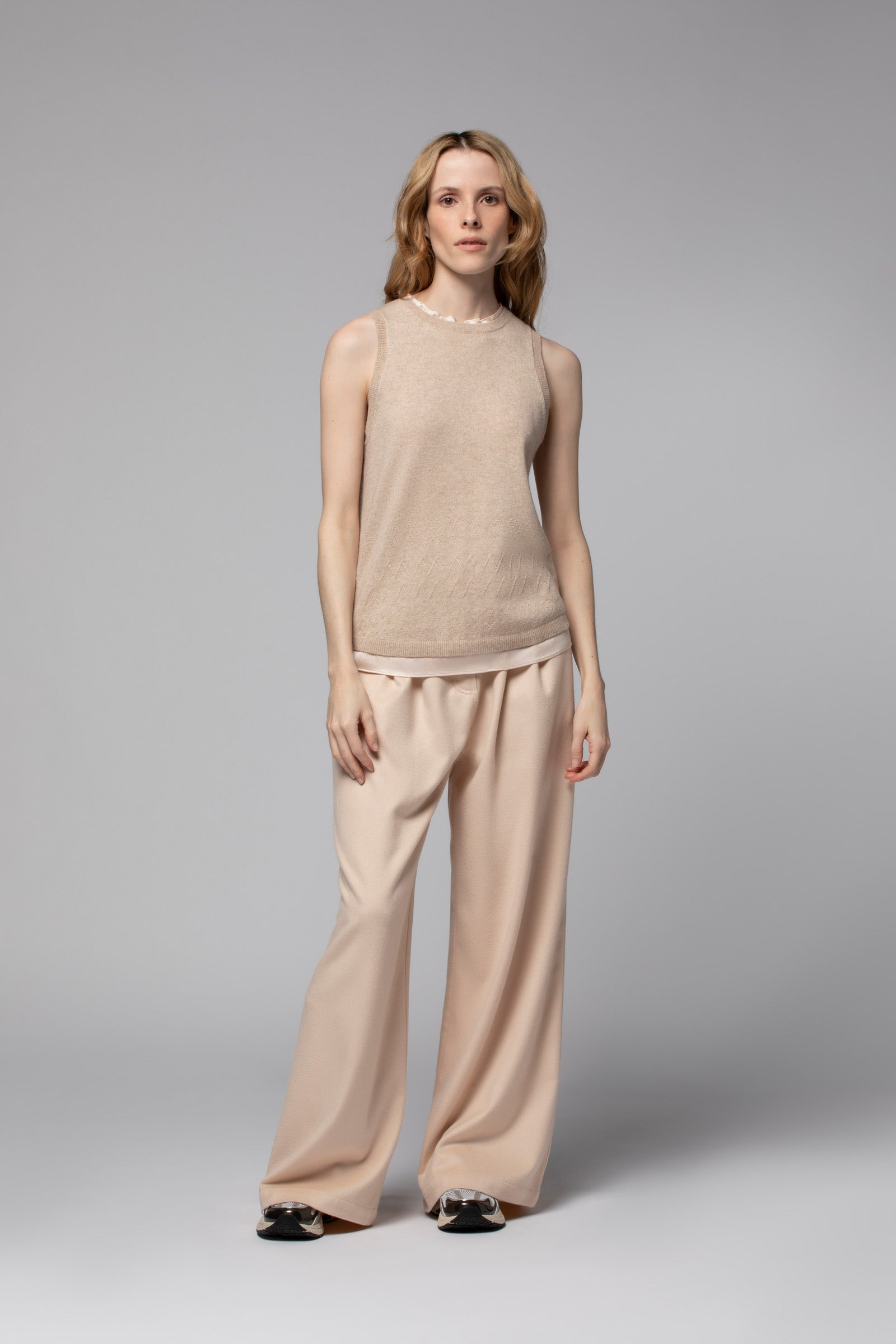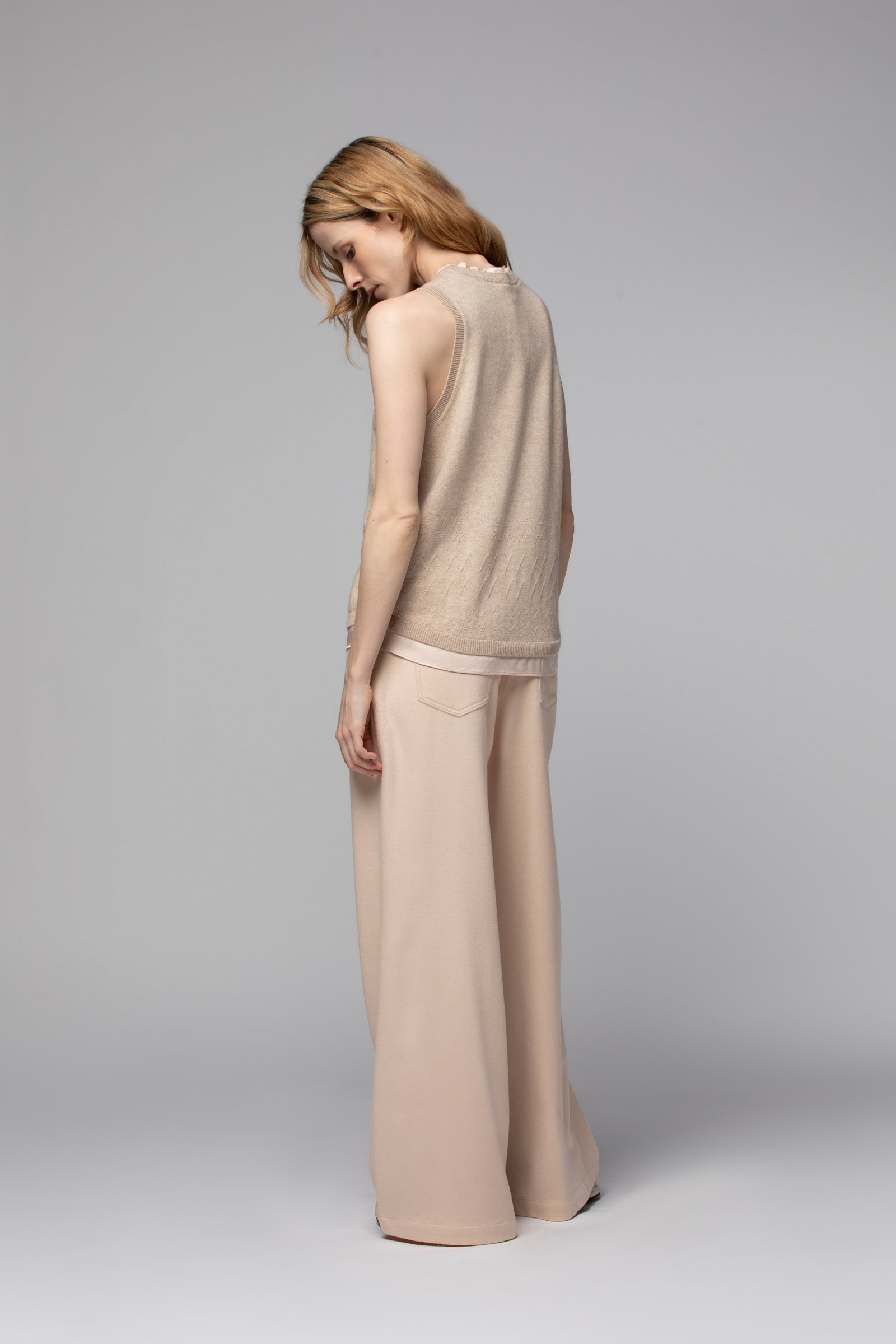 Inspiré de l’iconique pantalon tailleur, notre modèle BABILI en propose une réinterprétation moderne et audacieuse. Confectionné dans un somptueux drap de laine enrichi de fils de soie, il séduit par sa douceur exceptionnelle et son tombé fluide, agréable à porter au quotidien. Sa coupe large, structurée par des plis à l’avant, dessine une silhouette élégante et parfaitement équilibrée. À l’arrière, une découpe façon jean insuffle une touche résolument contemporaine, qui bouscule avec finesse les codes du tailoring traditionnel. Sa ceinture, dotée de passants, se ferme par un bouton gravé du monogramme MAX&MOI, qui signe cette création avec subtilité.