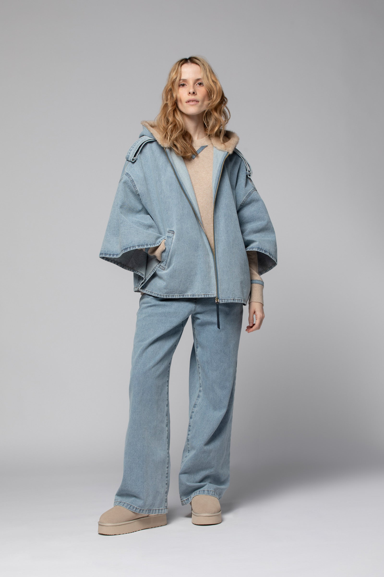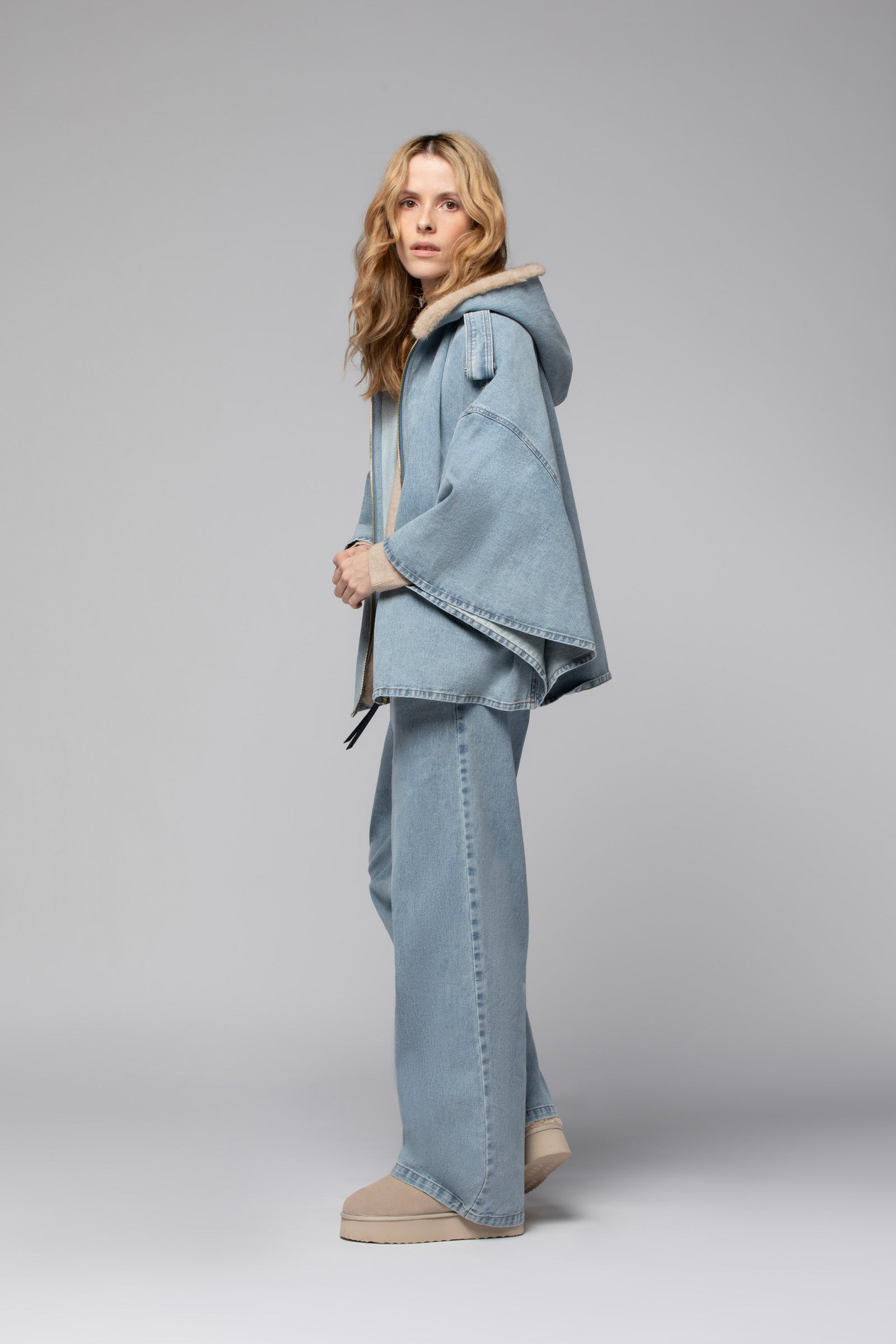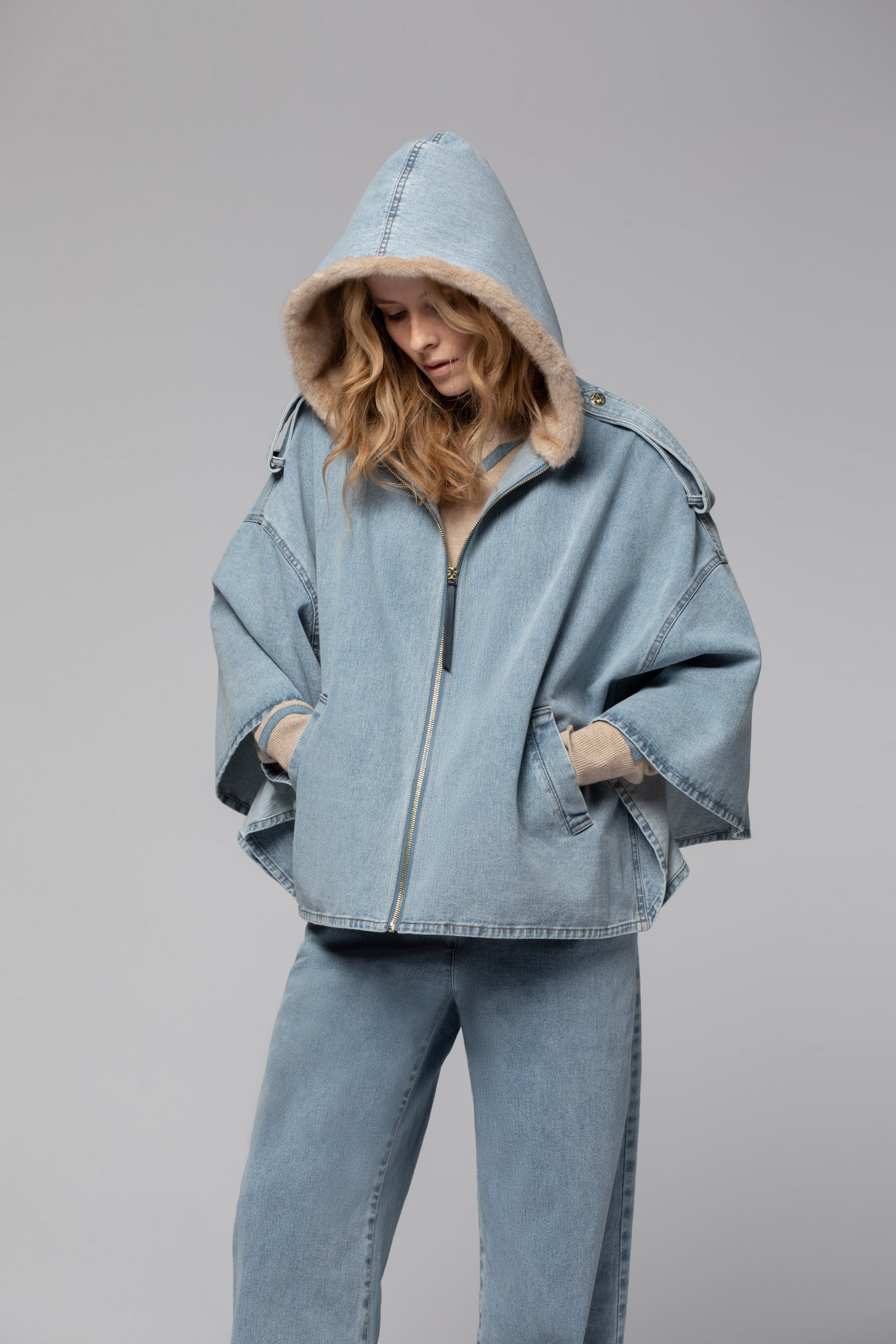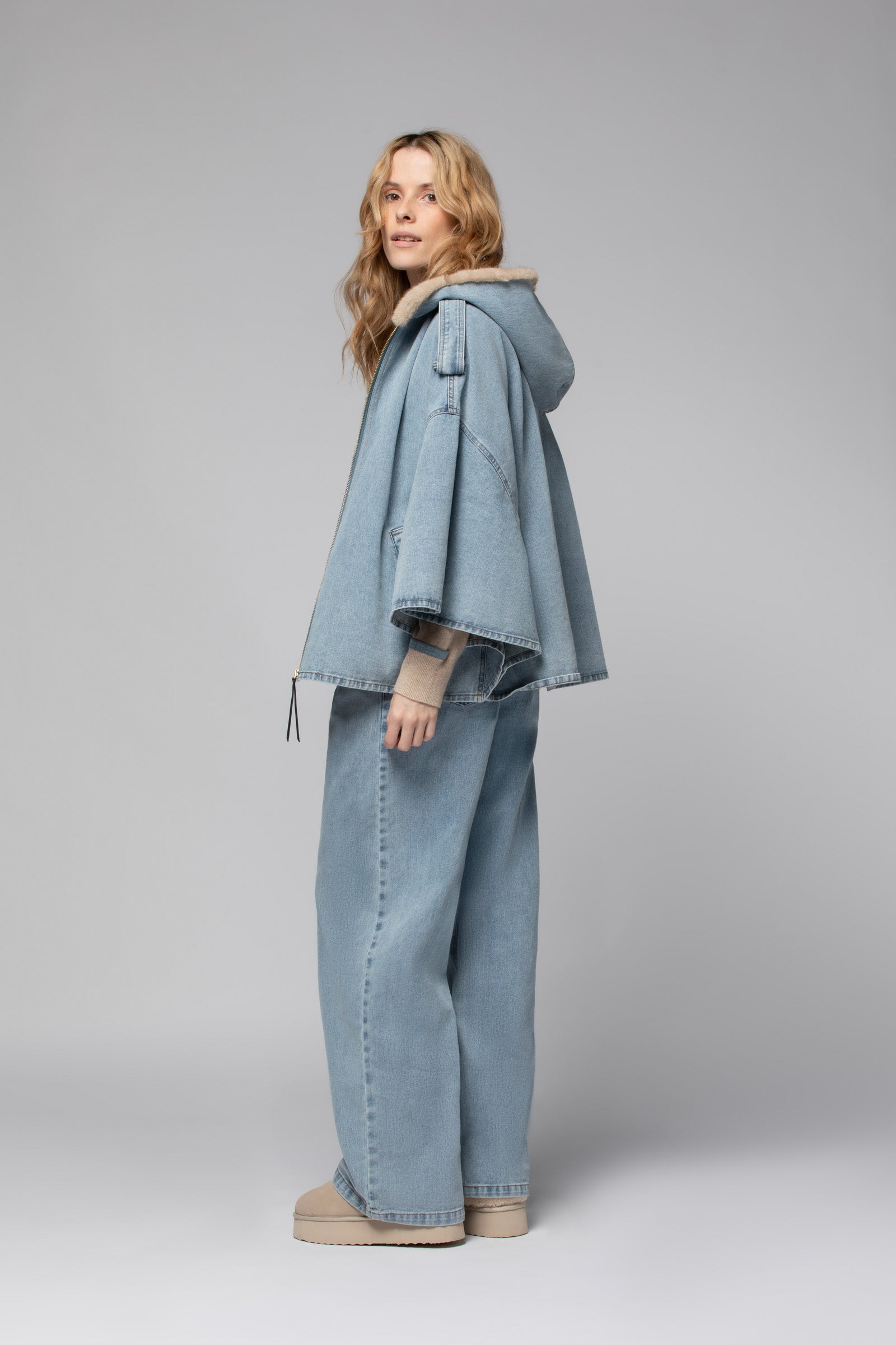 Confectionné dans un superbe denim 100% coton, notre poncho VANDA affiche une allure résolument contemporaine. Sa coupe ample s'associe à de larges emmanchures zippées, qui révèlent tout le savoir-faire de cette pièce versatile : portées fermées ou ouvertes, elles permettent de moduler la silhouette au gré de vos envies. Idéal pour la mi-saison, ce poncho cape se distingue par sa capuche généreuse, doublée d’une fausse fourrure à la texture incroyablement duveteuse. Elle s'ajuste d'un geste grâce à une fermeture zippée, rehaussée d'une longue tirette graphique en cuir. Surpiqures apparentes, patte d'épaules et boutons signatures MAX&MOI viennent parfaire le modèle.