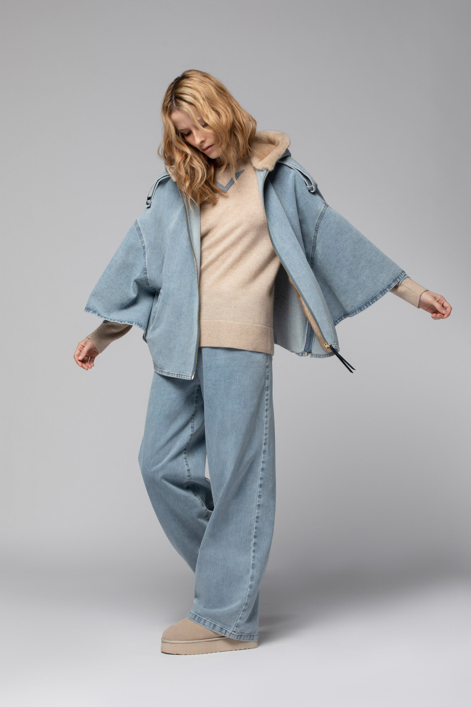 Citadin, ce poncho en denim pour femme est tout simplement irrésistible porté avec notre pantalon en denim BICHA. Dans un esprit plus audacieux, on l'associe à notre iconique legging en cuir d'agneau.