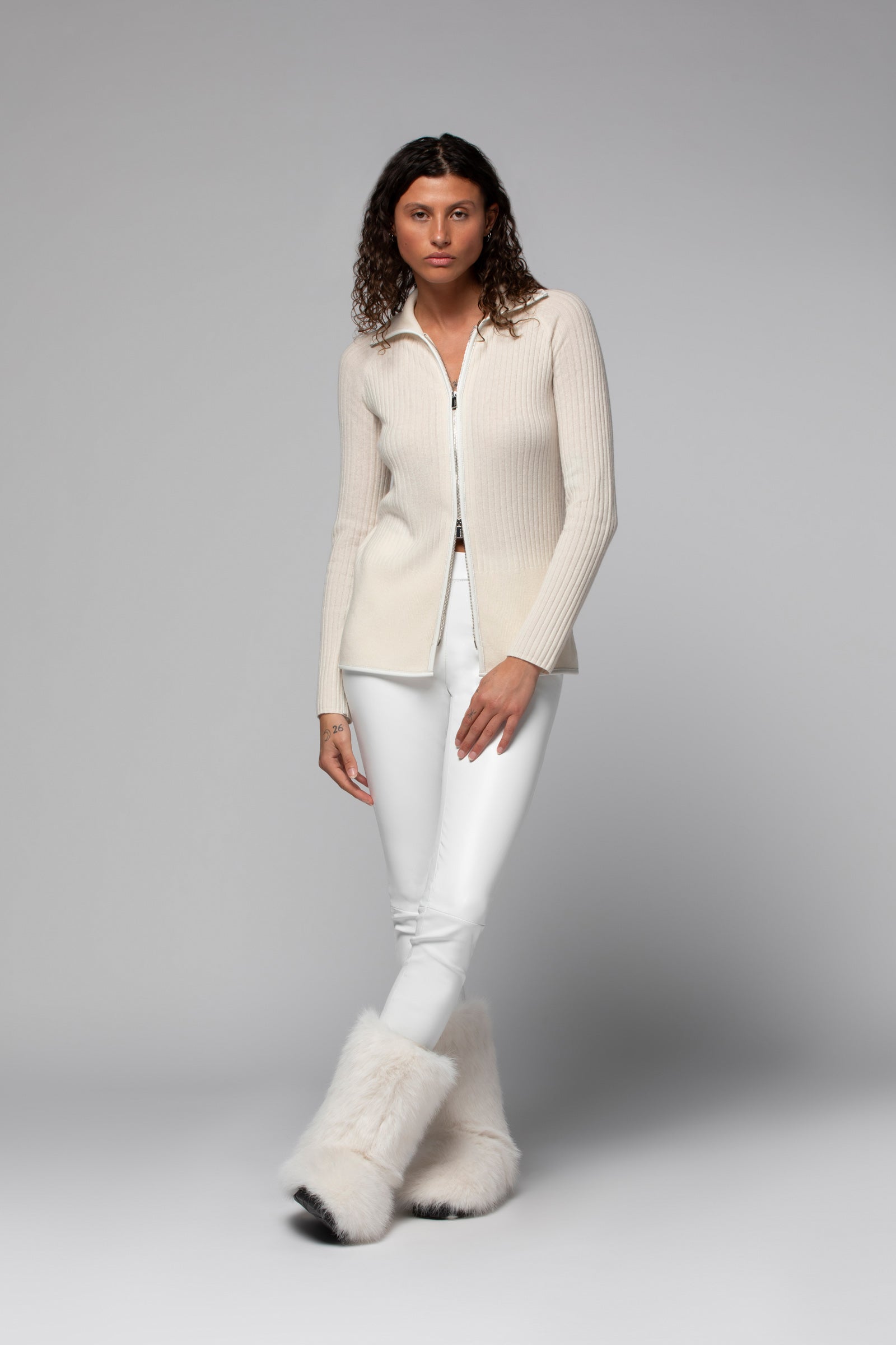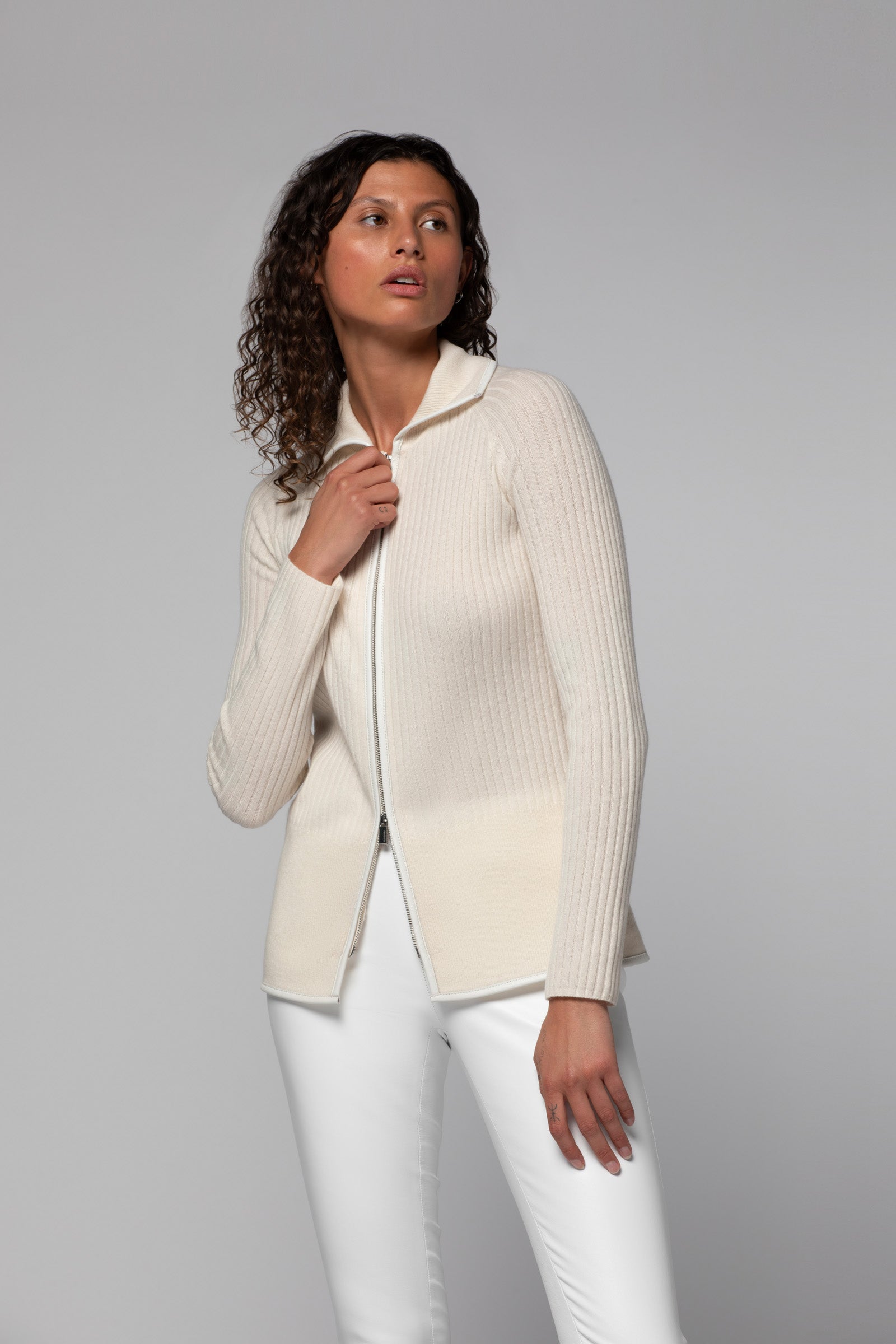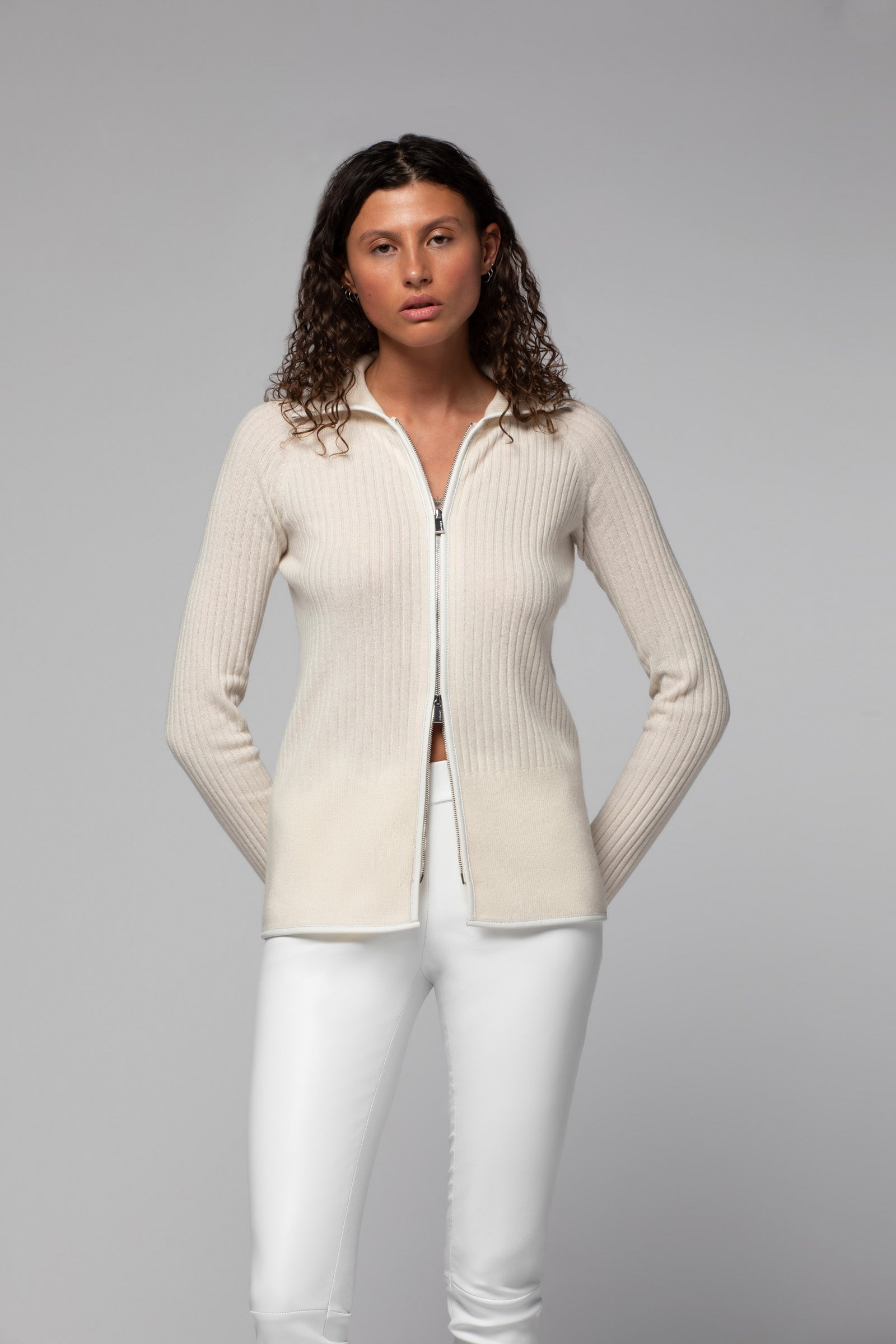 Avec son col structuré et sa fermeture zippée bordée de finitions en cuir, notre pull POESIE revisite les codes du pull pour femme dans une version résolument contemporaine. Il se distingue par sa maille côtelée en laine et cachemire, qui épouse les courbes avec douceur et dessine une silhouette féminine. Pensé pour s’adapter à toutes vos envies grâce à son zip à double curseur, il se joue des styles avec élégance et se porte aussi bien entrouvert, intégralement fermé ou à la manière d'un gilet. Une allure tantôt sophistiquée, tantôt décontractée, toujours parfaitement maîtrisée.