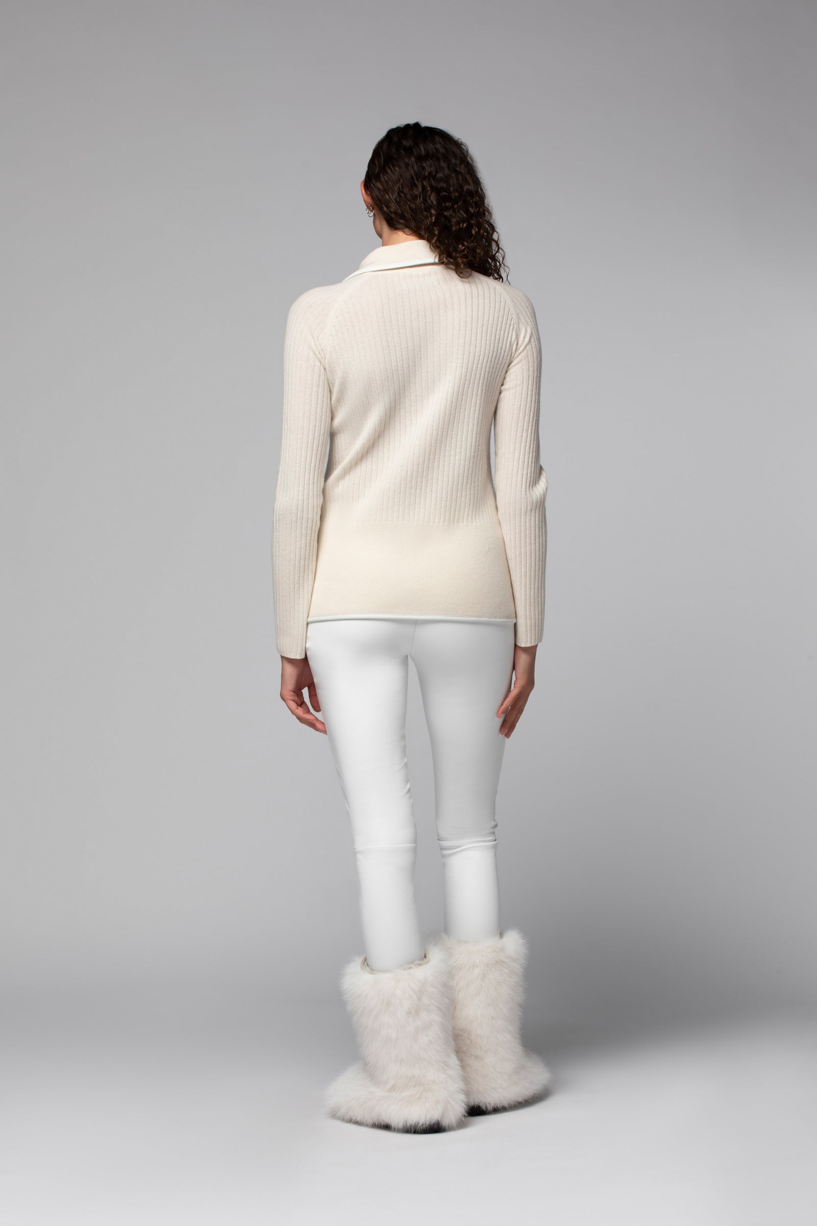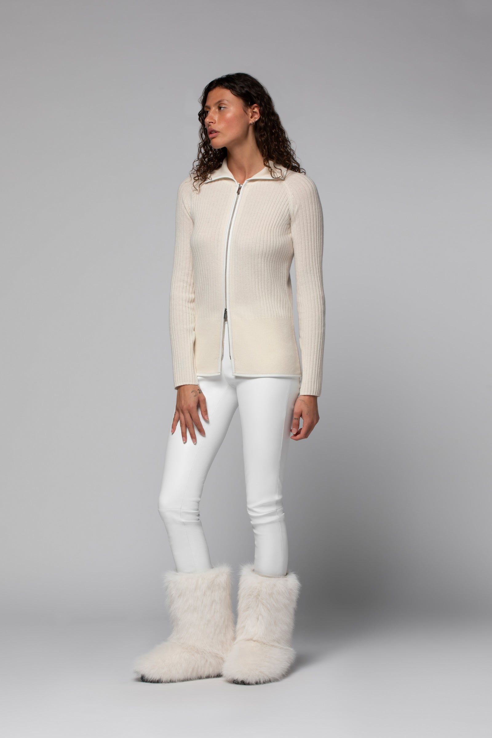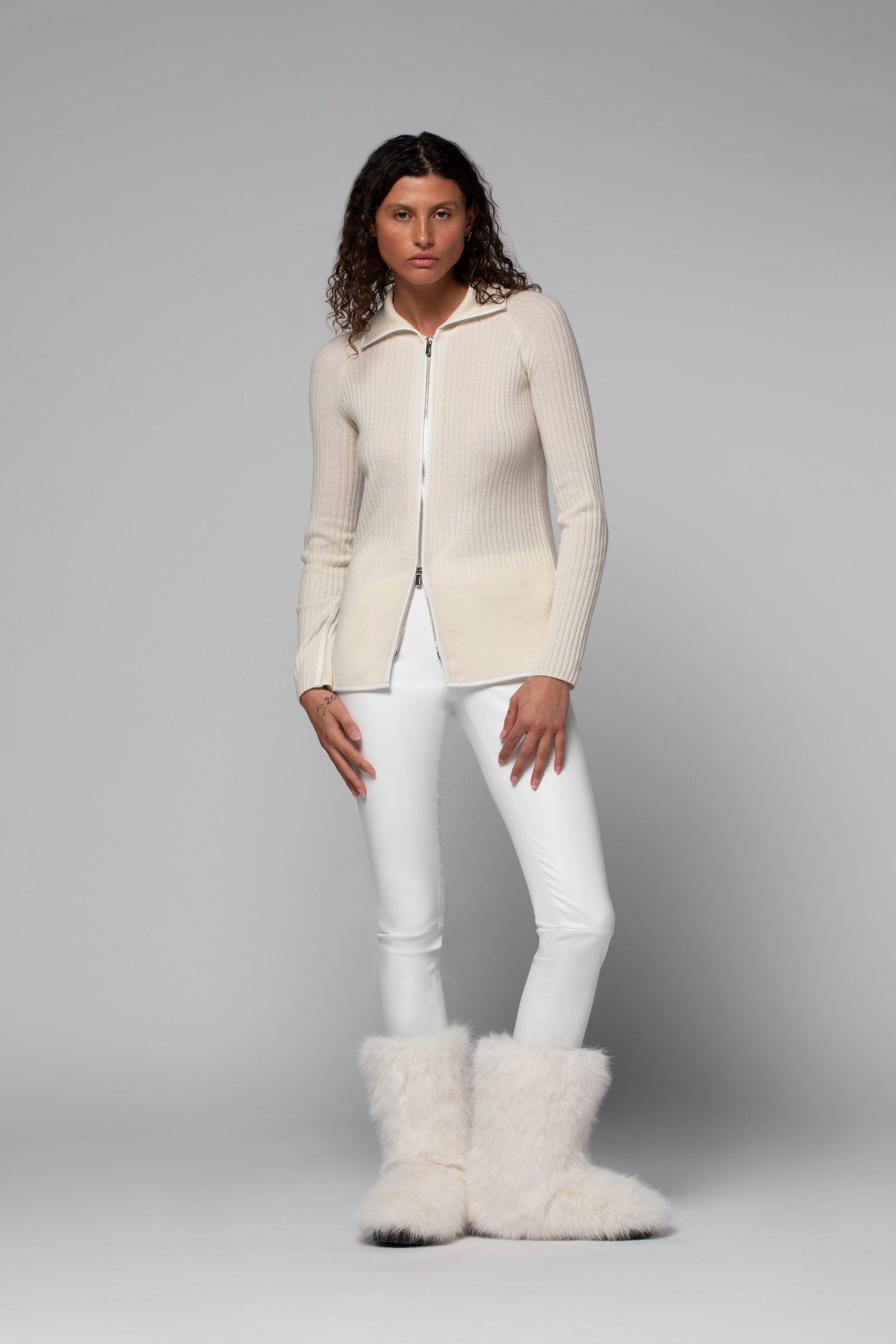 Avec son col structuré et sa fermeture zippée bordée de finitions en cuir, notre pull POESIE revisite les codes du pull pour femme dans une version résolument contemporaine. Il se distingue par sa maille côtelée en laine et cachemire, qui épouse les courbes avec douceur et dessine une silhouette féminine. Pensé pour s’adapter à toutes vos envies grâce à son zip à double curseur, il se joue des styles avec élégance et se porte aussi bien entrouvert, intégralement fermé ou à la manière d'un gilet. Une allure tantôt sophistiquée, tantôt décontractée, toujours parfaitement maîtrisée.