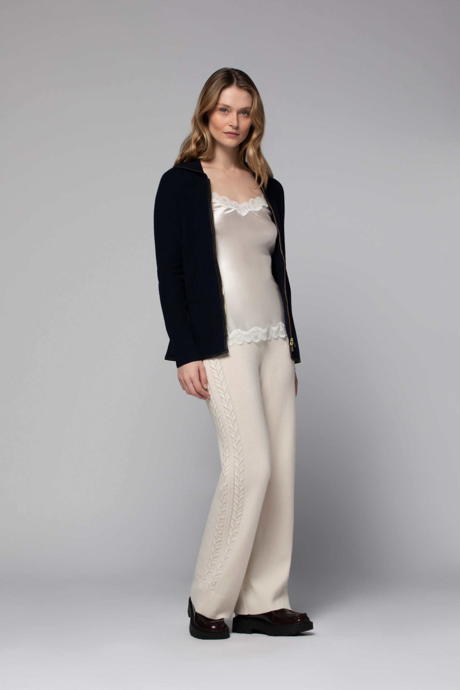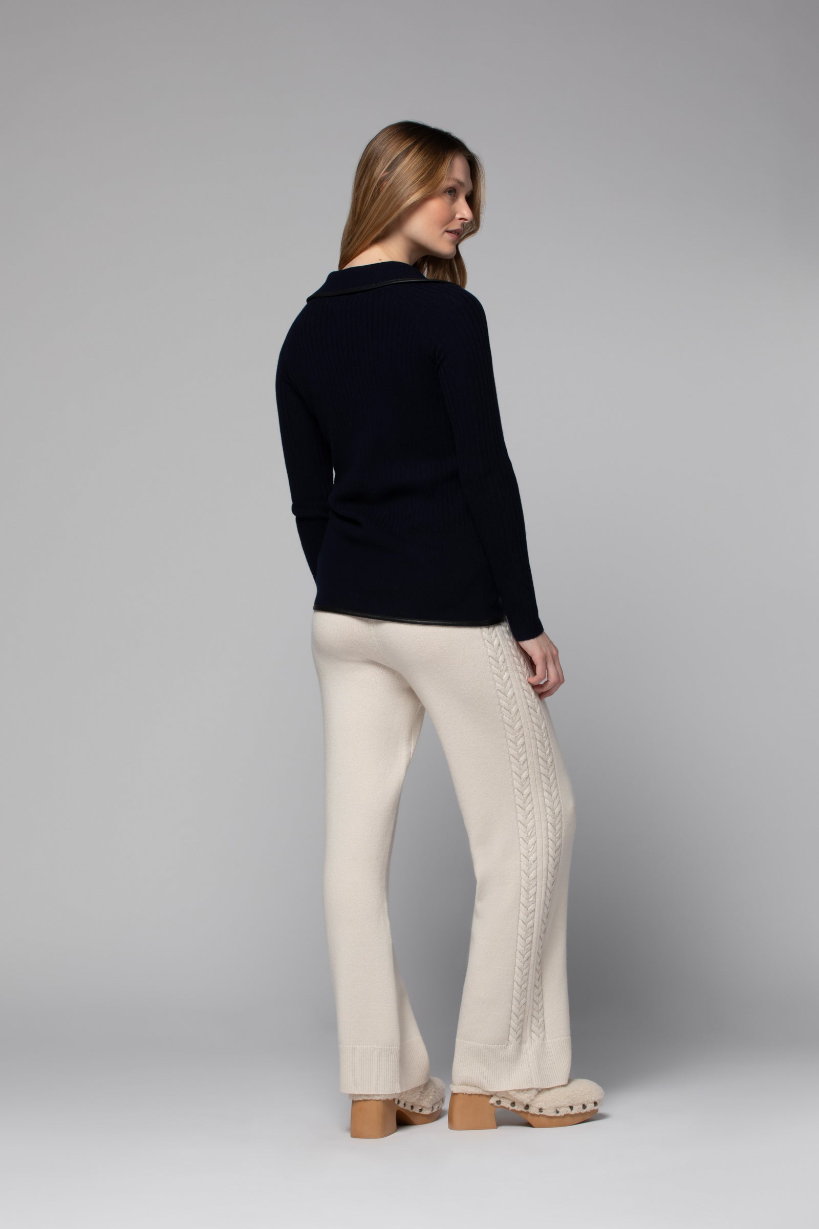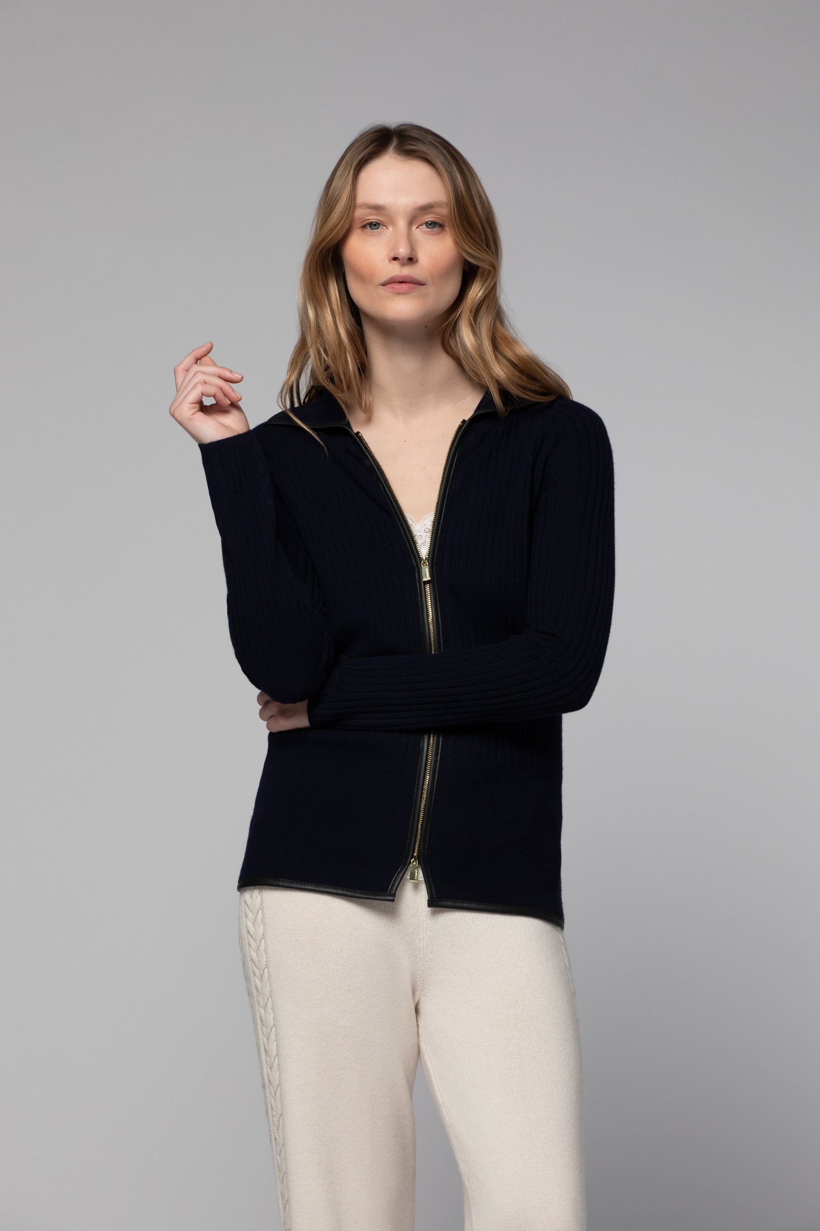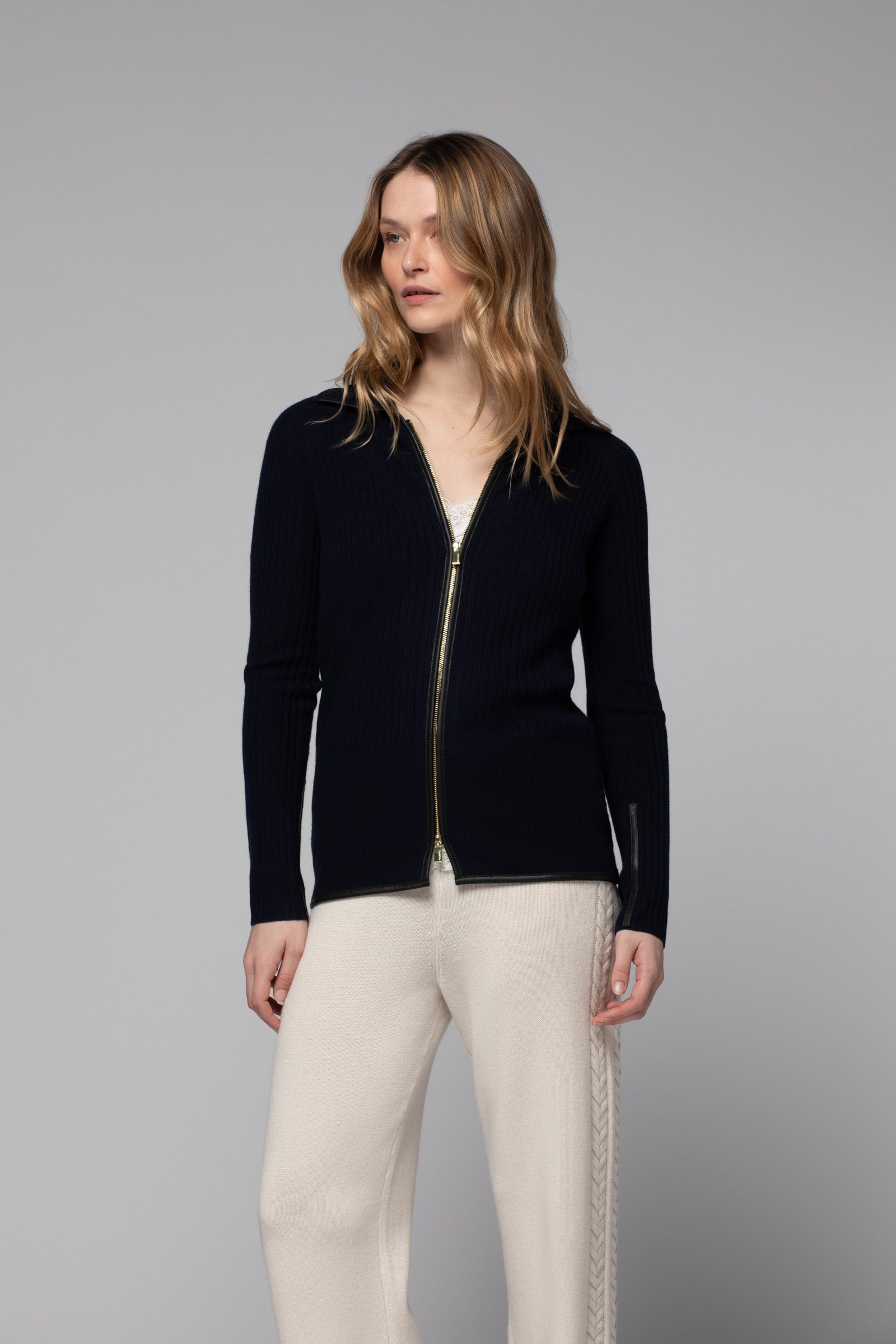 Avec son col structuré et sa fermeture zippée bordée de finitions en cuir, notre pull POESIE revisite les codes du pull pour femme dans une version résolument contemporaine. Il se distingue par sa maille côtelée en laine et cachemire, qui épouse les courbes avec douceur et dessine une silhouette féminine. Pensé pour s’adapter à toutes vos envies grâce à son zip à double curseur, il se joue des styles avec élégance et se porte aussi bien entrouvert, intégralement fermé ou à la manière d'un gilet. Une allure tantôt sophistiquée, tantôt décontractée, toujours parfaitement maîtrisée.
