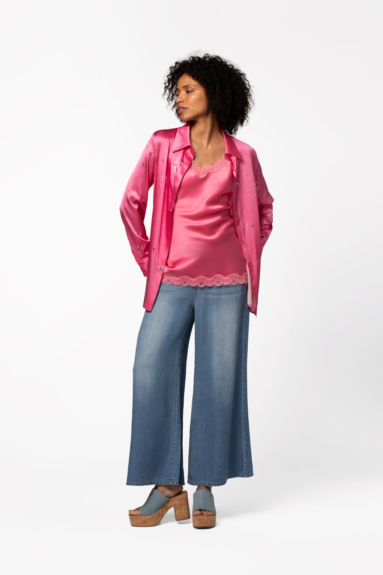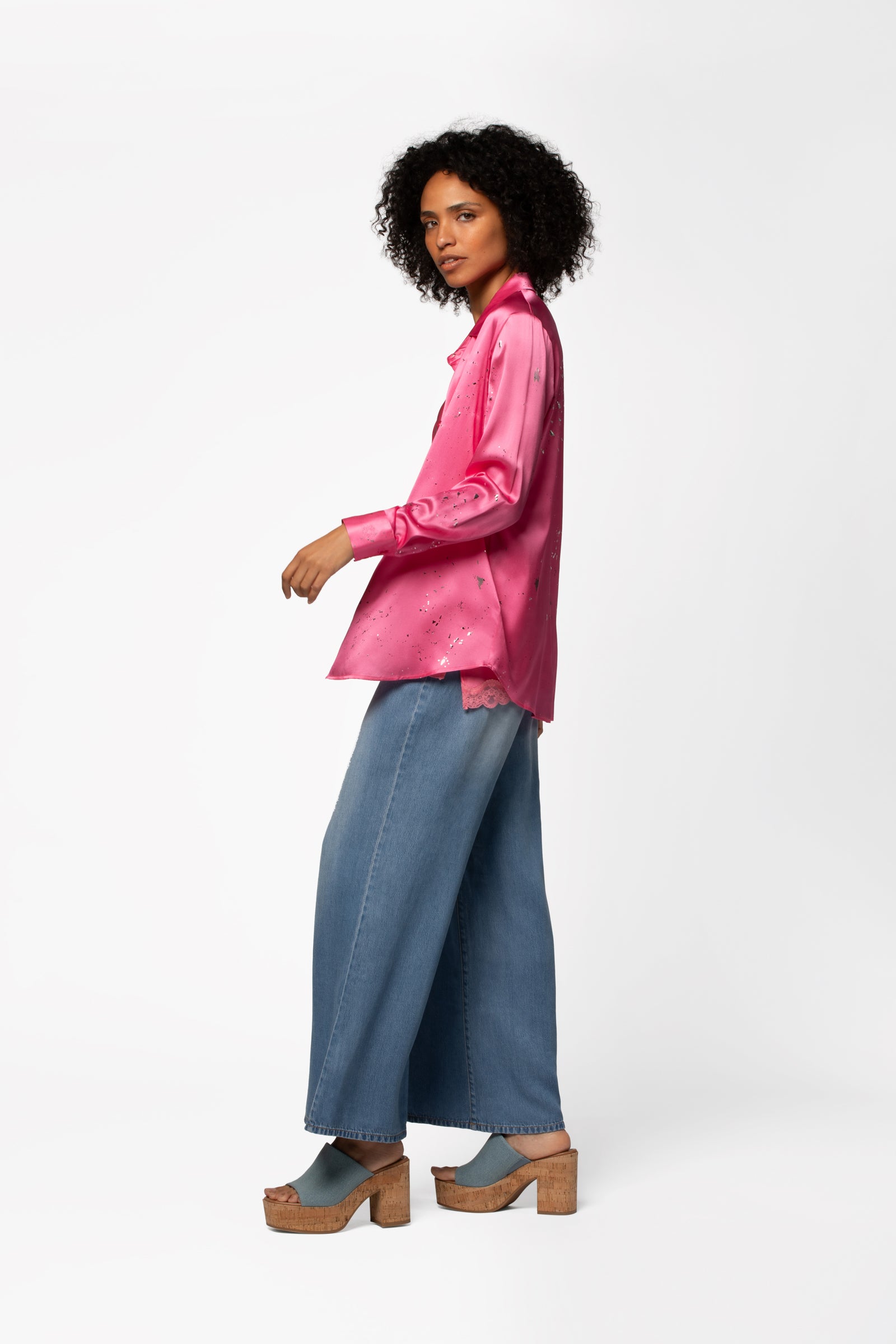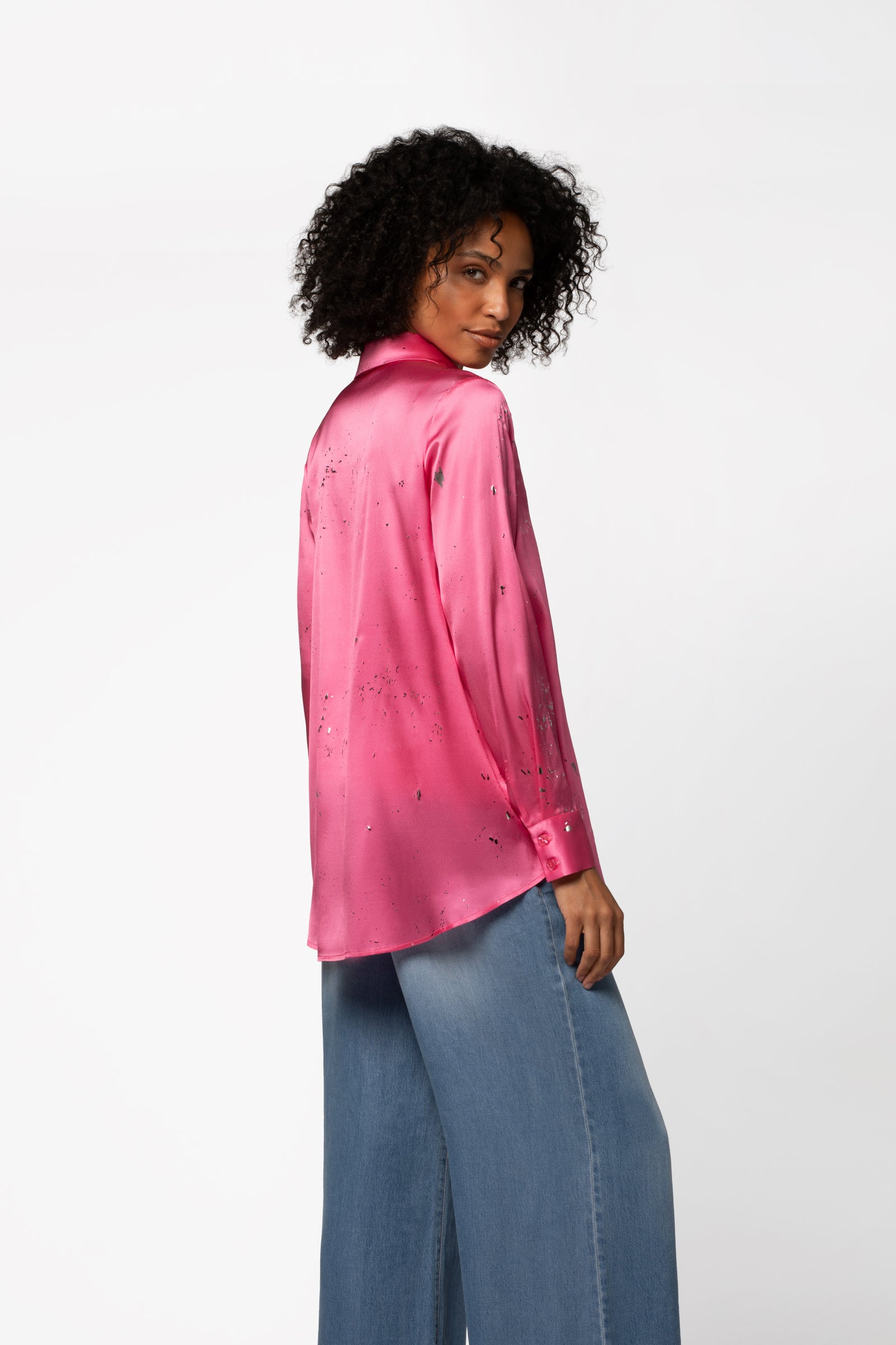 Décliné dans une large palette de nuances, ce chemisier en soie se réinvente cette saison dans de nouveaux coloris lumineux - rose fuchsia, jaune soleil, bleu horizon et taupe - ainsi que dans des dégradés tie-and-dye inédits.
