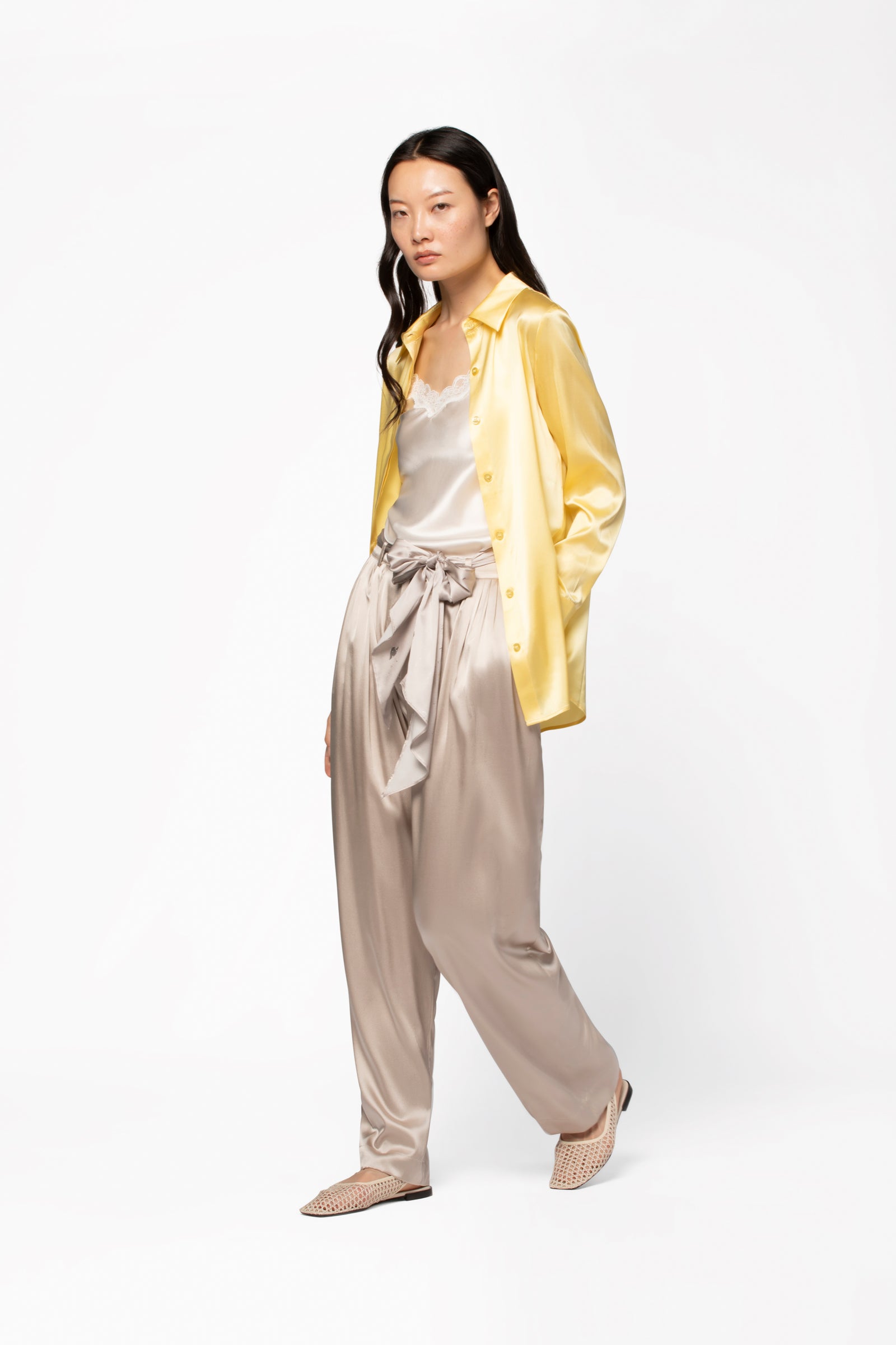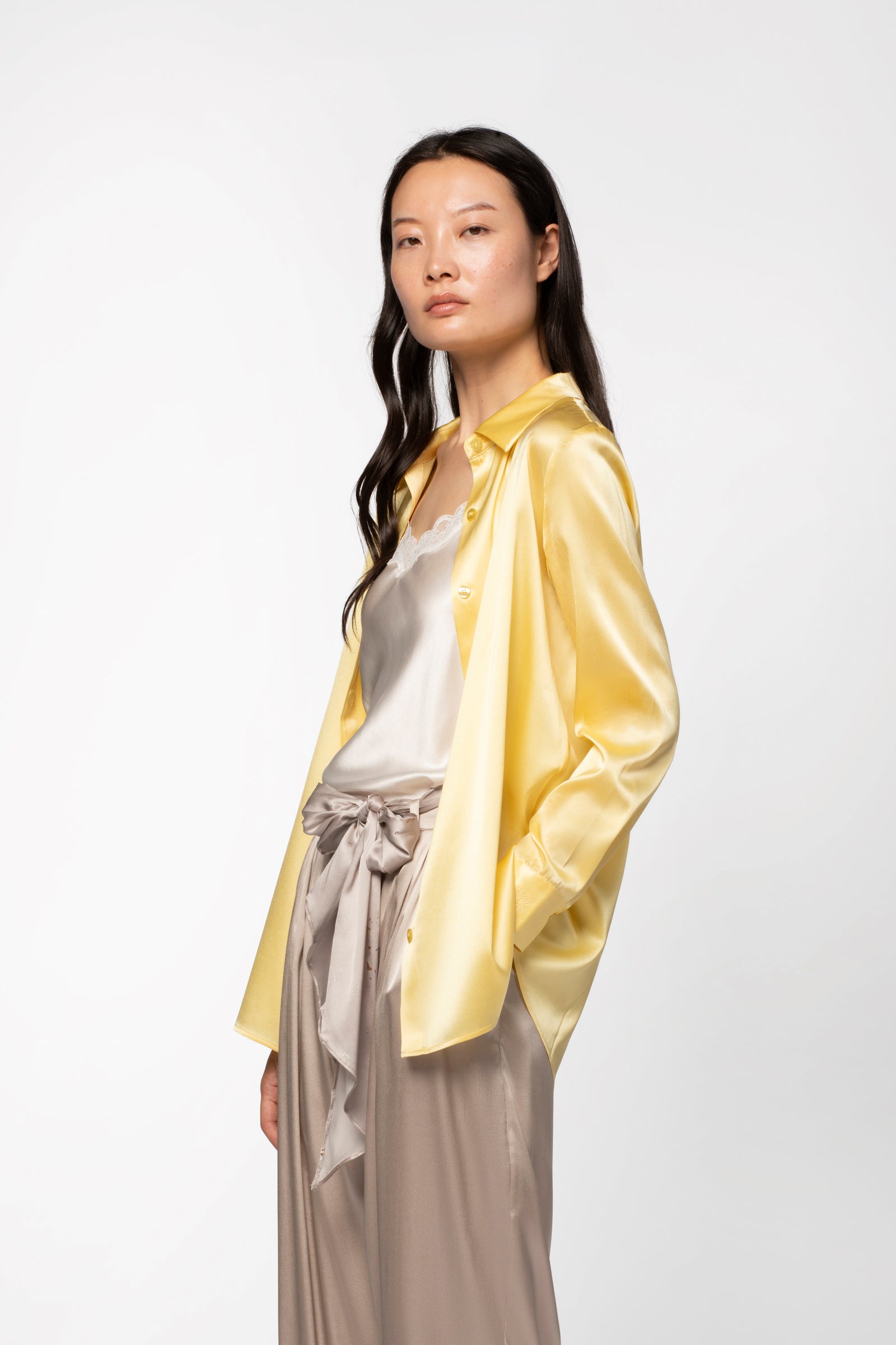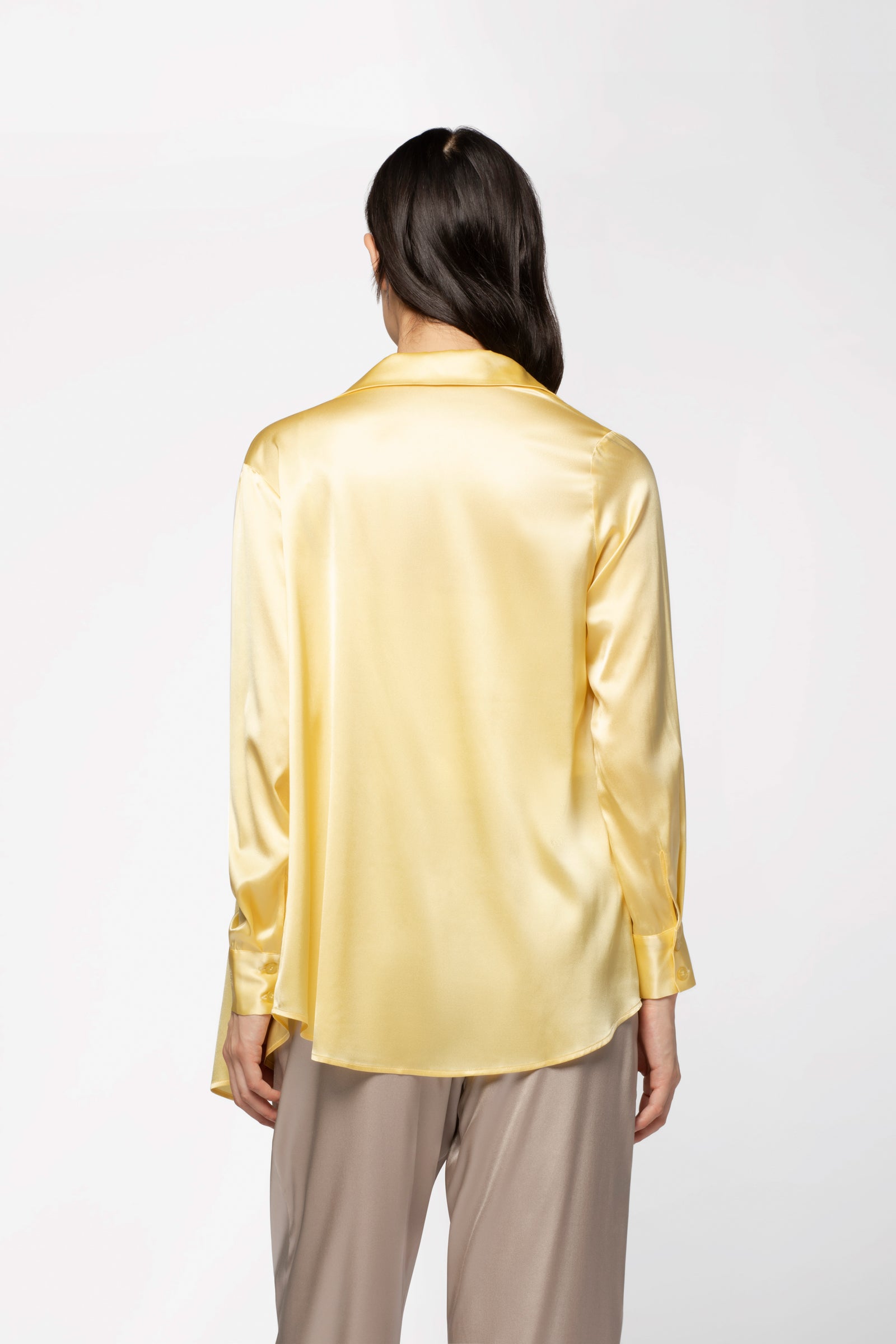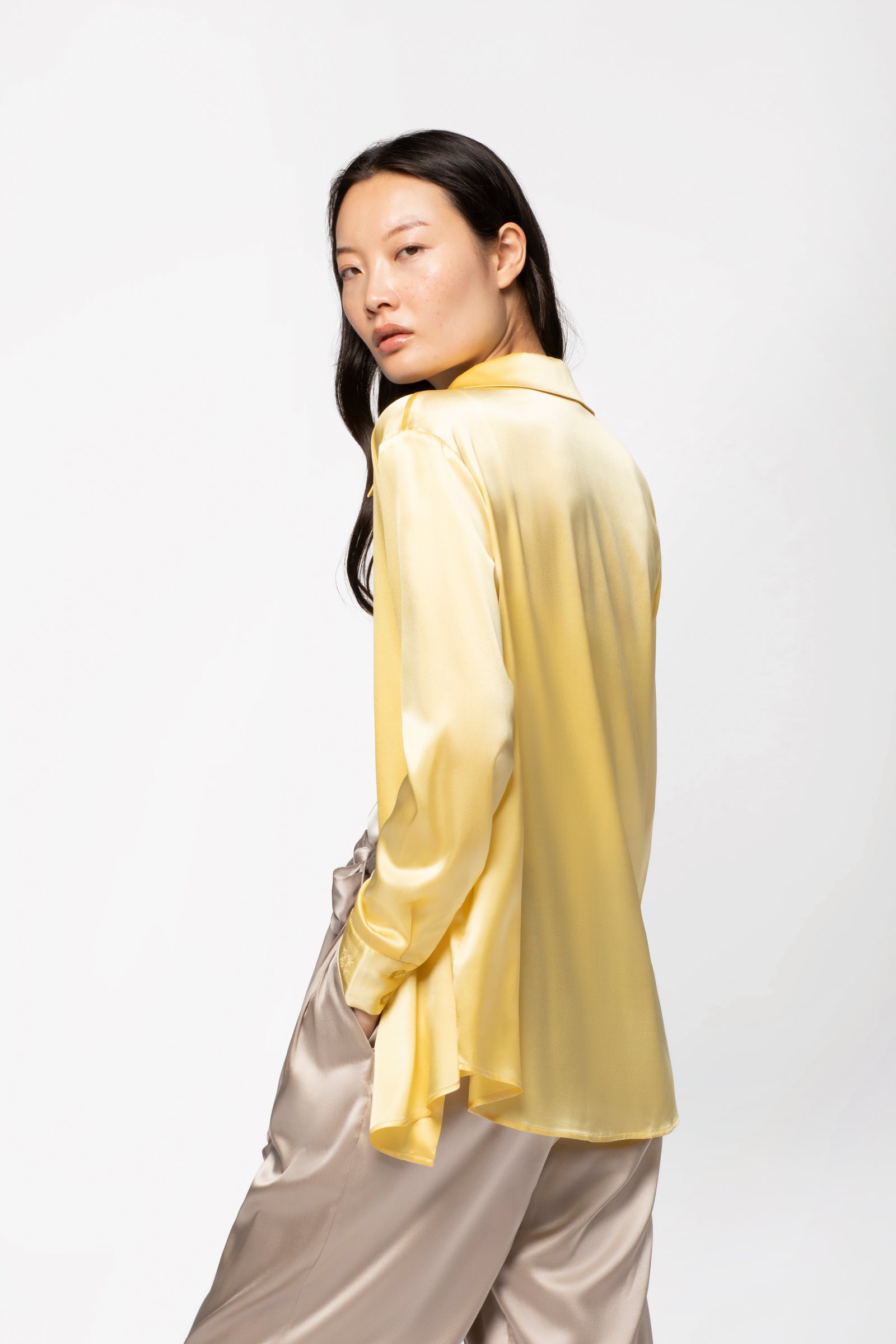 Décliné dans une large palette de nuances, ce chemisier en soie se réinvente cette saison dans de nouveaux coloris lumineux - rose fuchsia, jaune soleil, bleu horizon et taupe - ainsi que dans des dégradés tie-and-dye inédits.