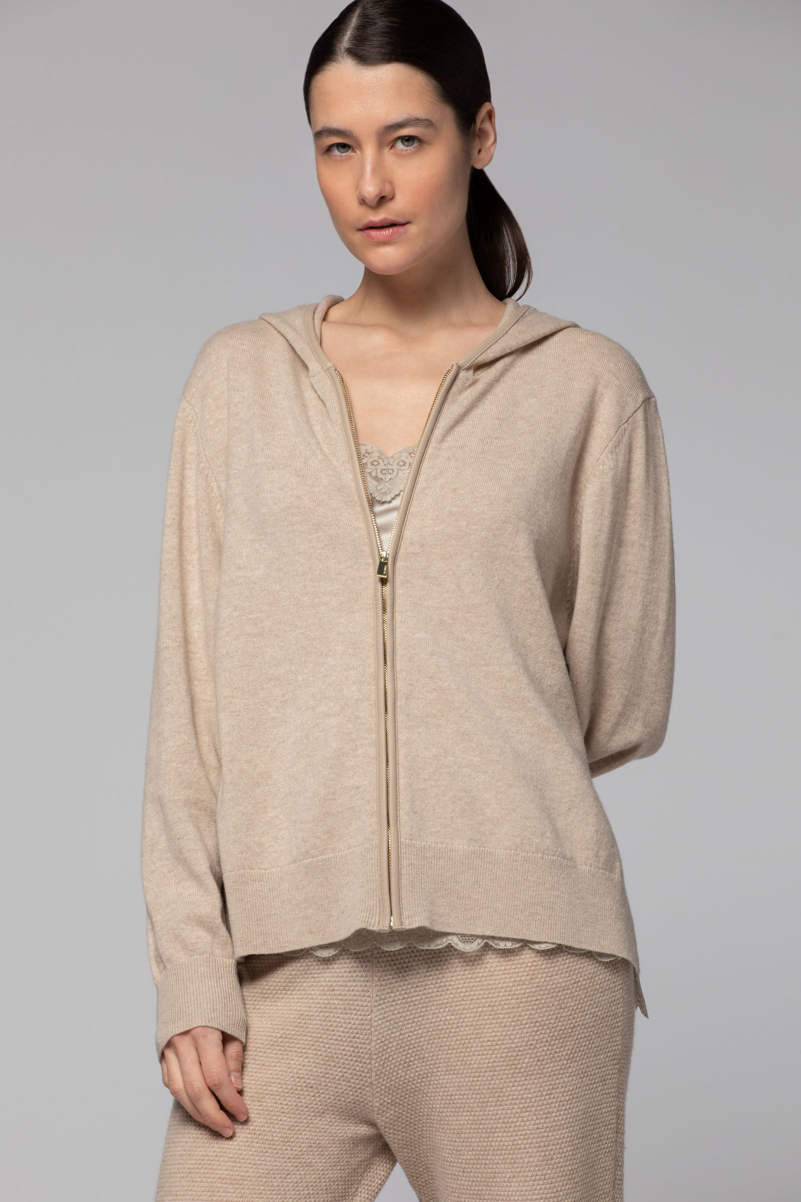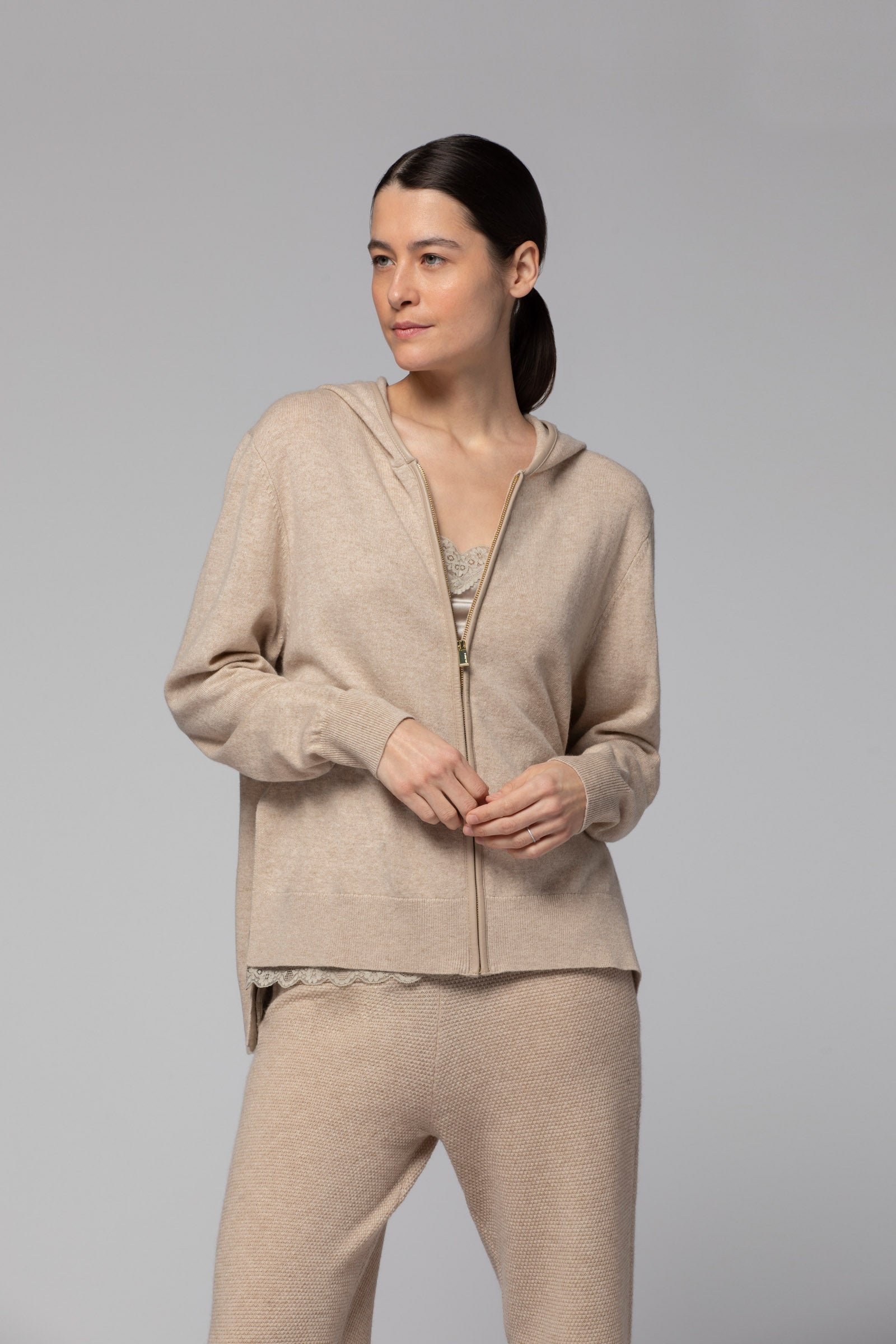 Ce gilet à capuche pour femme est décliné dans une large palette de nuances : noir, chocolat, gris et latte.