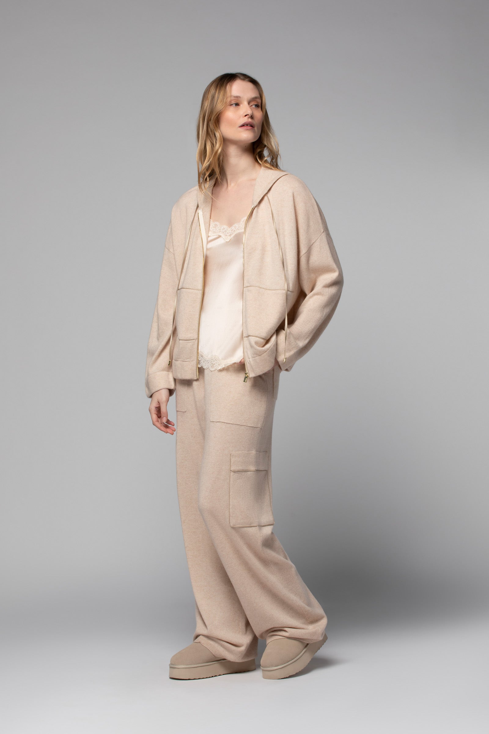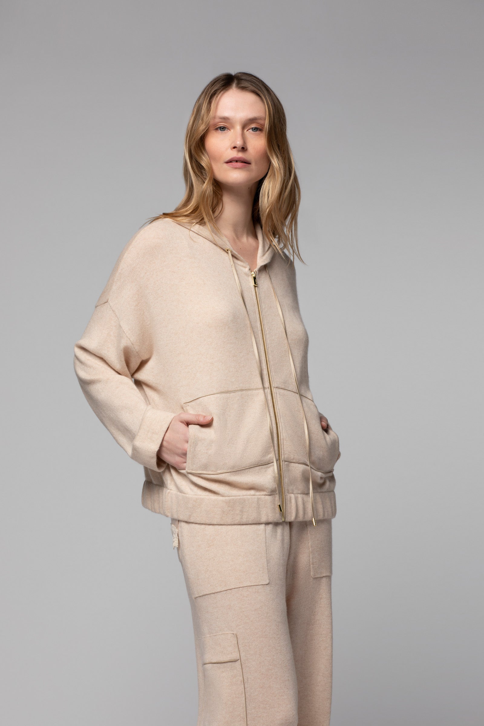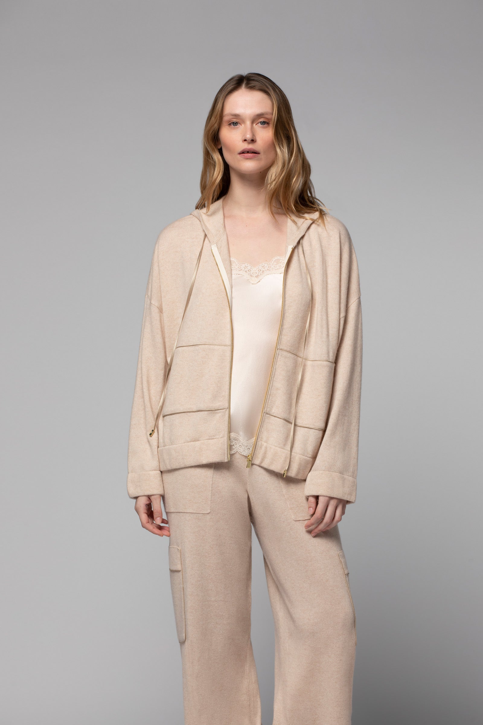 Avec notre gilet GILIA, le sweat zippé gagne en raffinement. Confectionné en laine et cachemire, il enveloppe le corps d'une chaleur douce et réconfortante. Sa coupe ample et ses épaules tombantes lui confèrent une allure à l'élégance décontractée, tandis que ses finitions en soie féminisent ses lignes et signent toute sa singularité — une bande graphique structure la capuche, un long cordon en soie permet un ajustement parfait et un passepoil délicat rehausse ses poches plaquées. Autant de détails qui subliment cette pièce du quotidien.