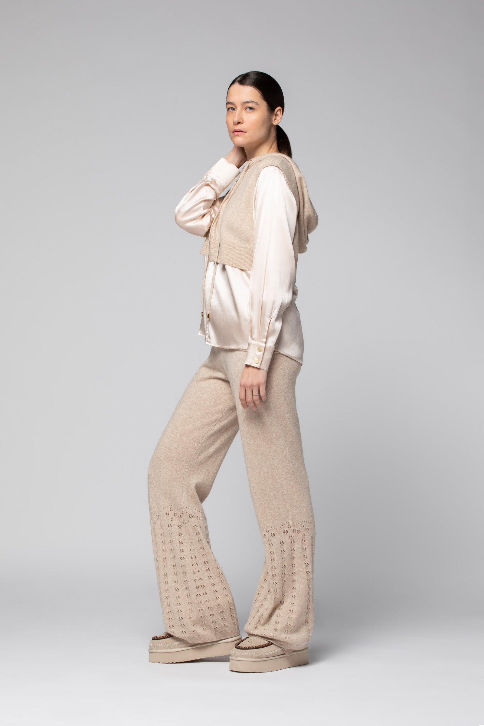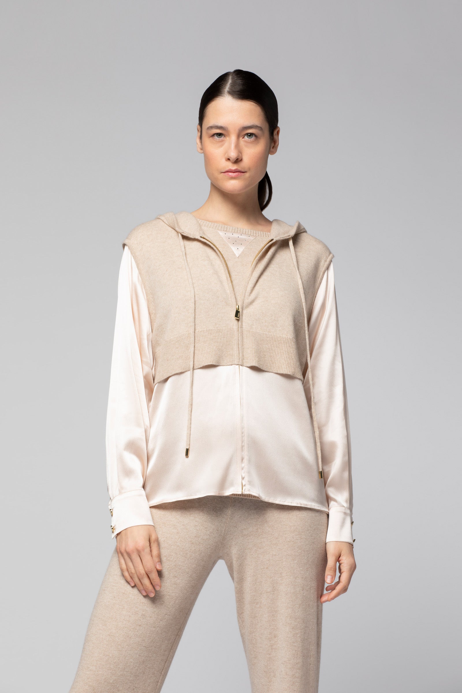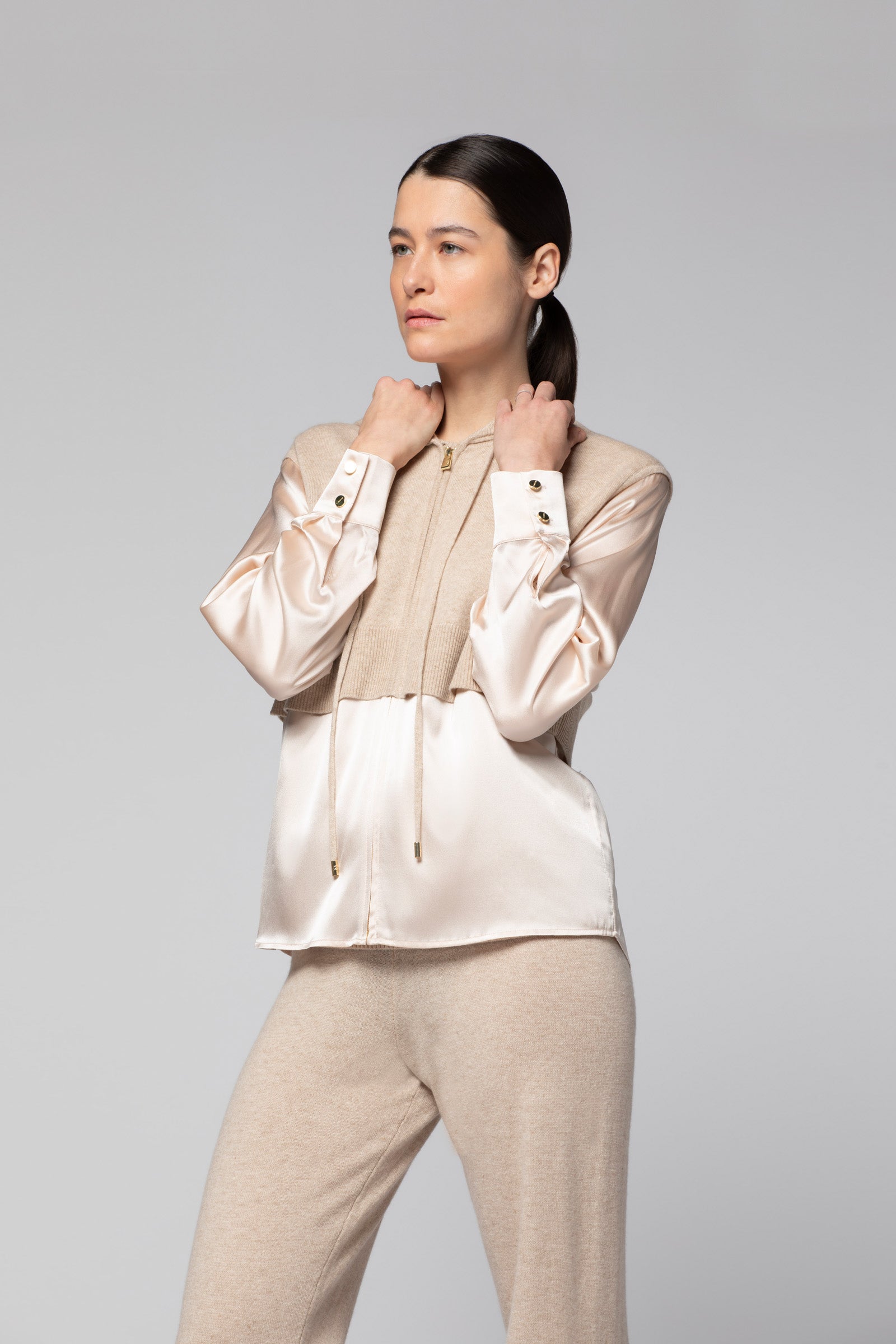 Notre gilet GRETA réinvente les codes du sweat zippé dans une version ultra-féminine et résolument moderne. Confectionné dans une douce maille en laine et cachemire, ce gilet bi-matière se distingue par ses manches et son bas en soie fluide, qui apportent une touche de raffinement et de légèreté. Sa capuche, dotée de cordons de serrage, insuffle un esprit décontracté, contrebalancée par les poignets chemise de ses manches longues, qui twistent l'allure pour un vestiaire casual-chic upgradé.