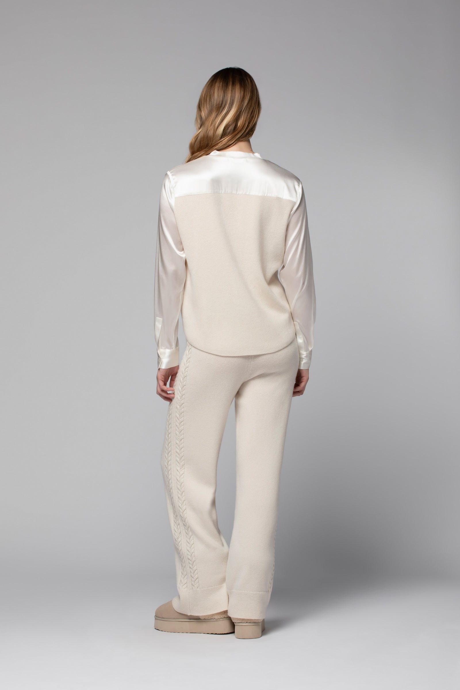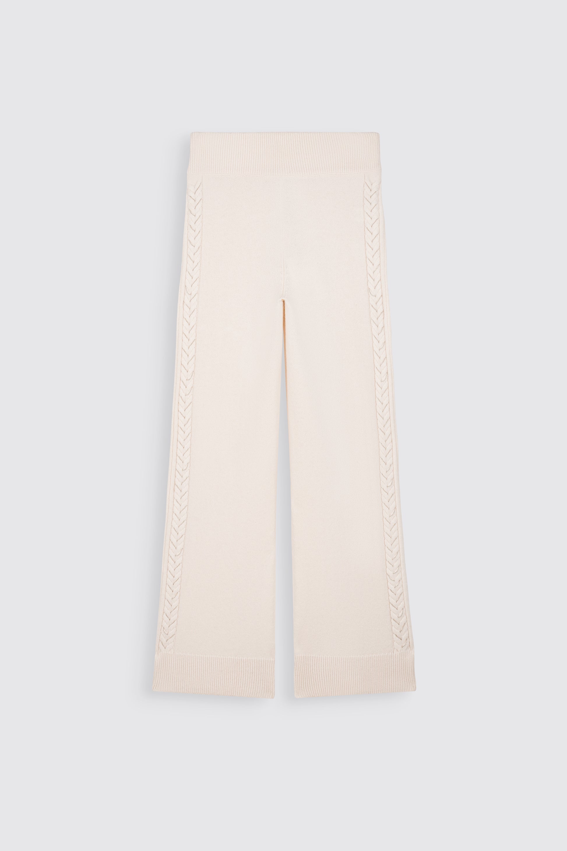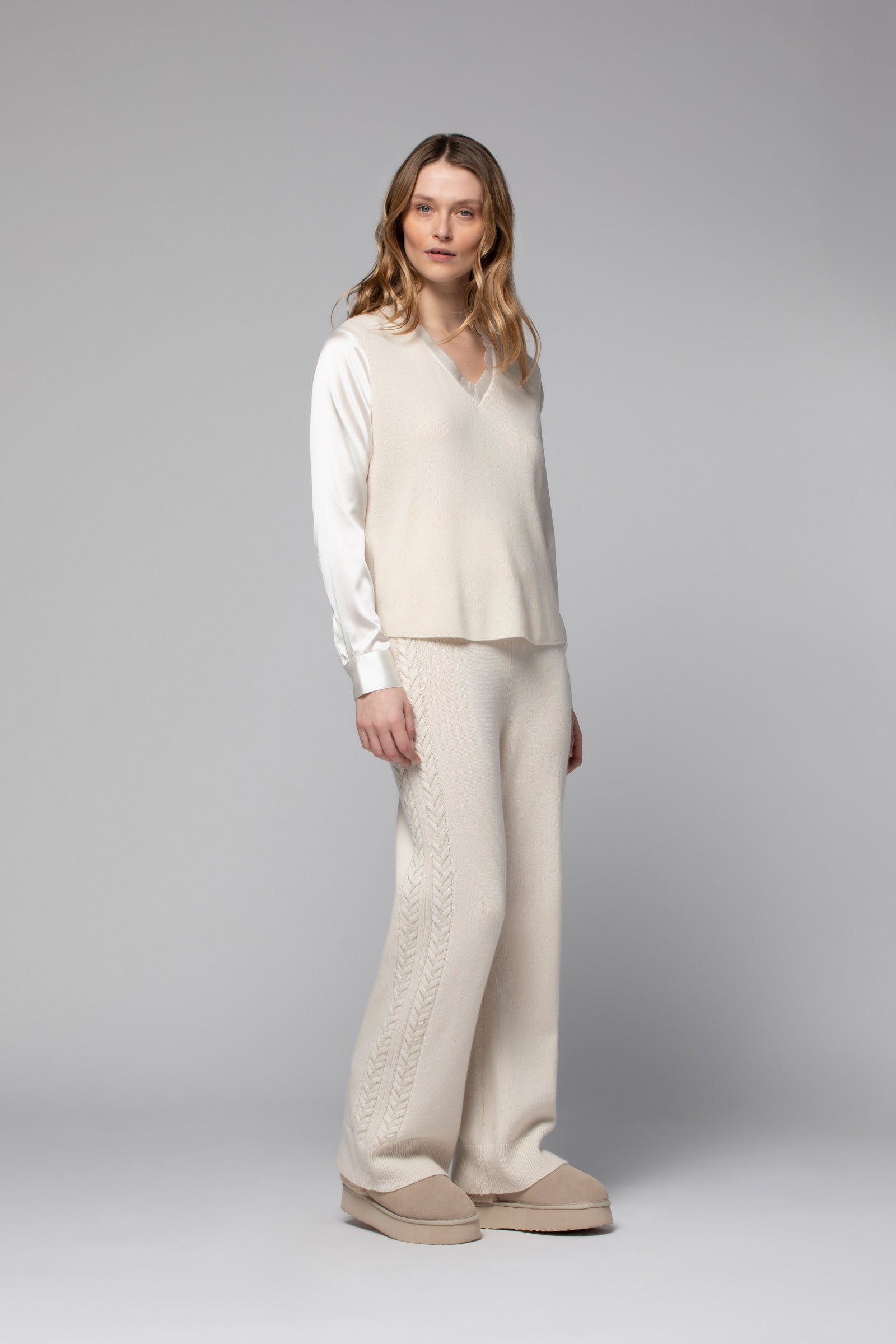 Confectionné dans un doux mélange de laine et cachemire, notre pantalon BRUNA est une promesse de confort absolu. Sa coupe droite, légèrement amplifiée, signe une allure à l'élégance décontractée, sublimée sur les côtés par de superbes tresses en maille, rehaussées de chaînes bijou à l'éclat raffiné. Pratique, il est doté d’une ceinture élastique qui s'adapte parfaitement à toutes les morphologies et garantie un maintien optimal. De larges finitions en bord-côte, à la taille et aux chevilles, viennent parfaire le modèle et structurent la silhouette avec finesse.