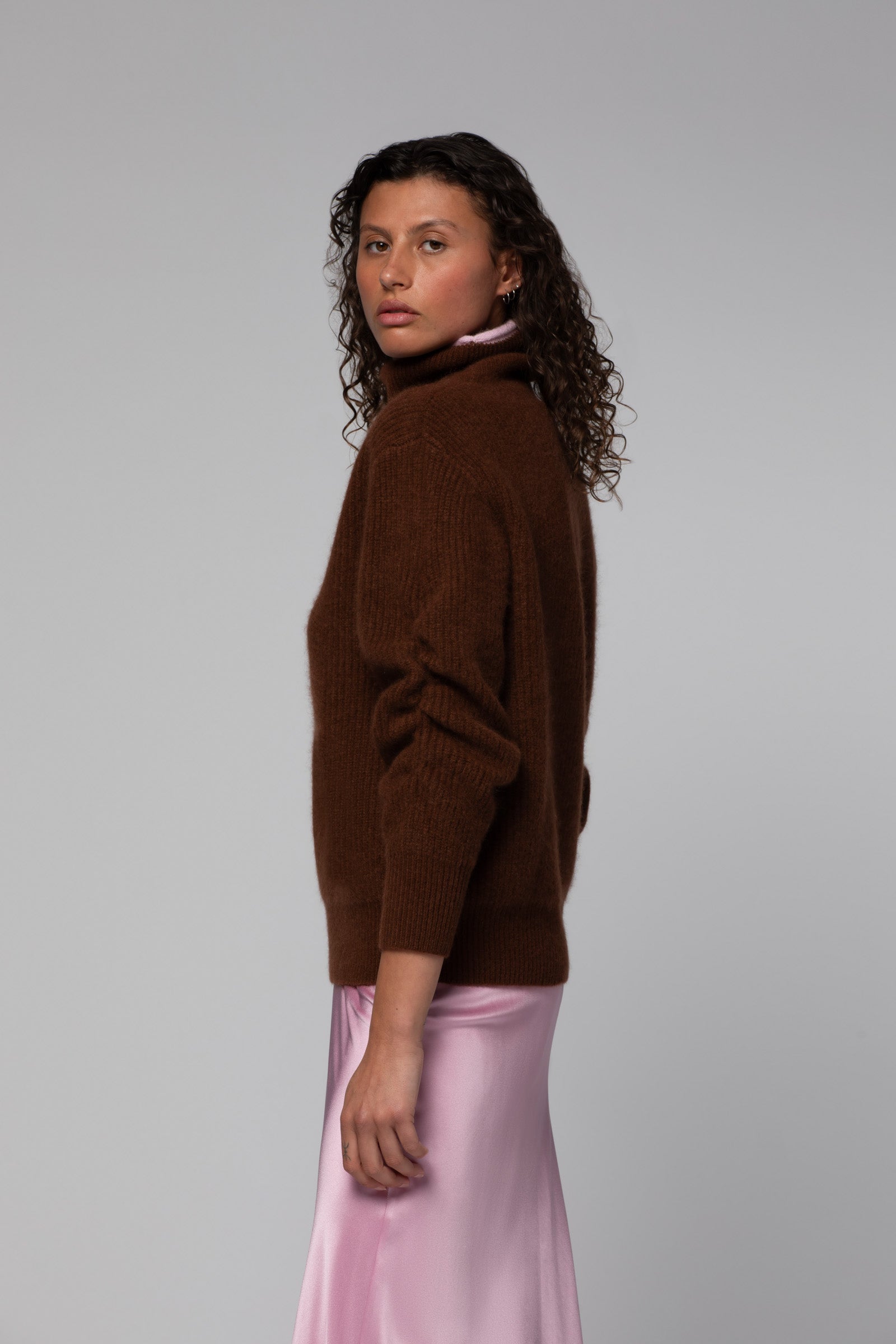 Notre pull PALOMA est un essentiel du vestiaire féminin. Confectionné dans un doux mélange de laine et cachemire, il séduit par sa maille en côte anglaise, à la texture irrésistible, qui signe une allure raffinée. Il joue des volumes avec justesse grâce à sa coupe ample, son généreux col roulé et ses manches longues retroussées, dans un jeu de plis à la sophistication naturelle. Une finition roulottée contrastée, au col, adoucit ses lignes et vient parfaire le modèle.