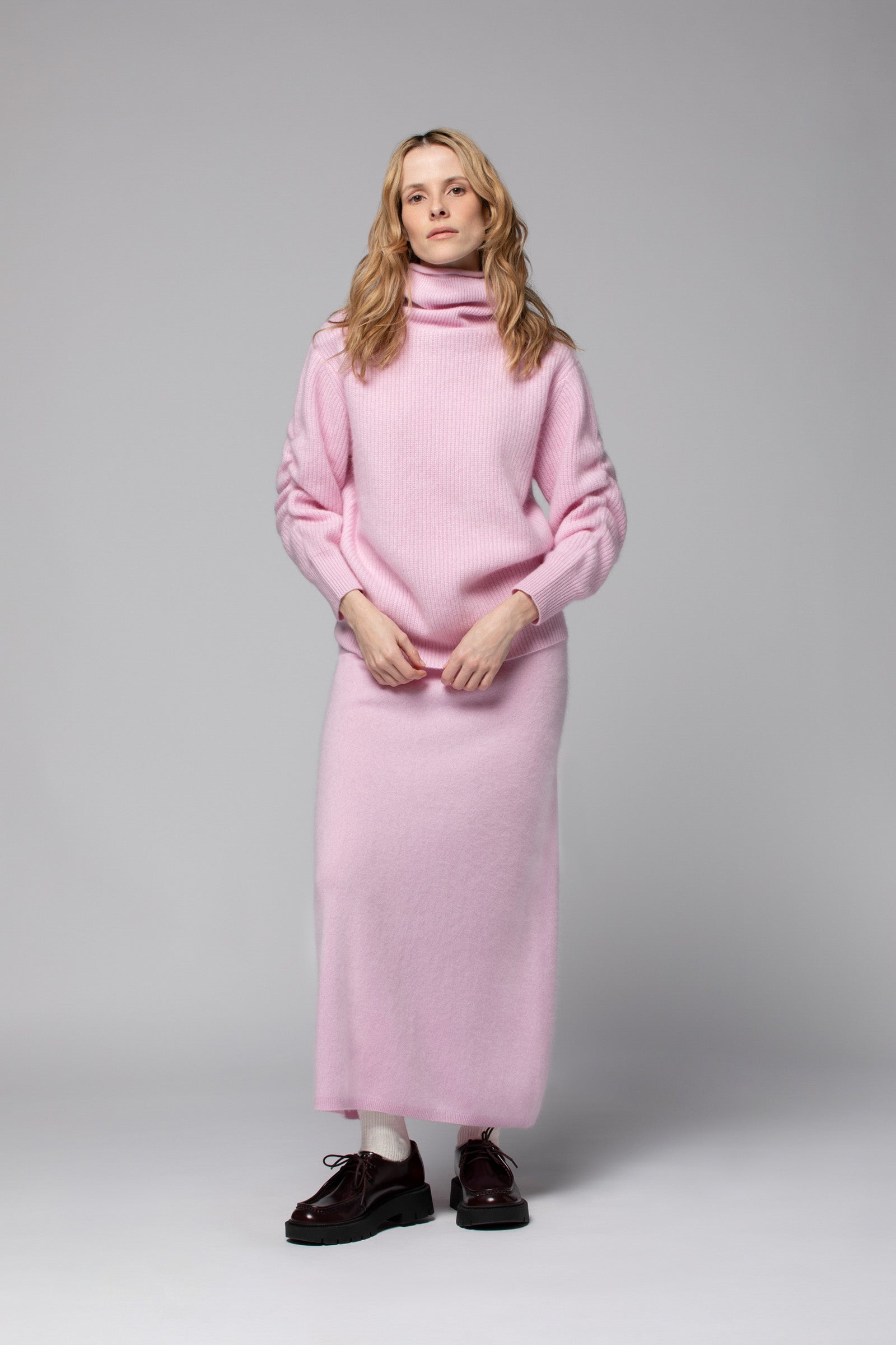 Notre pull PALOMA est un essentiel du vestiaire féminin. Confectionné dans un doux mélange de laine et cachemire, il séduit par sa maille en côte anglaise, à la texture irrésistible, qui signe une allure raffinée. Il joue des volumes avec justesse grâce à sa coupe ample, son généreux col roulé et ses manches longues retroussées, dans un jeu de plis à la sophistication naturelle. Une délicate finition roulottée, au col, adoucit ses lignes et vient parfaire le modèle.