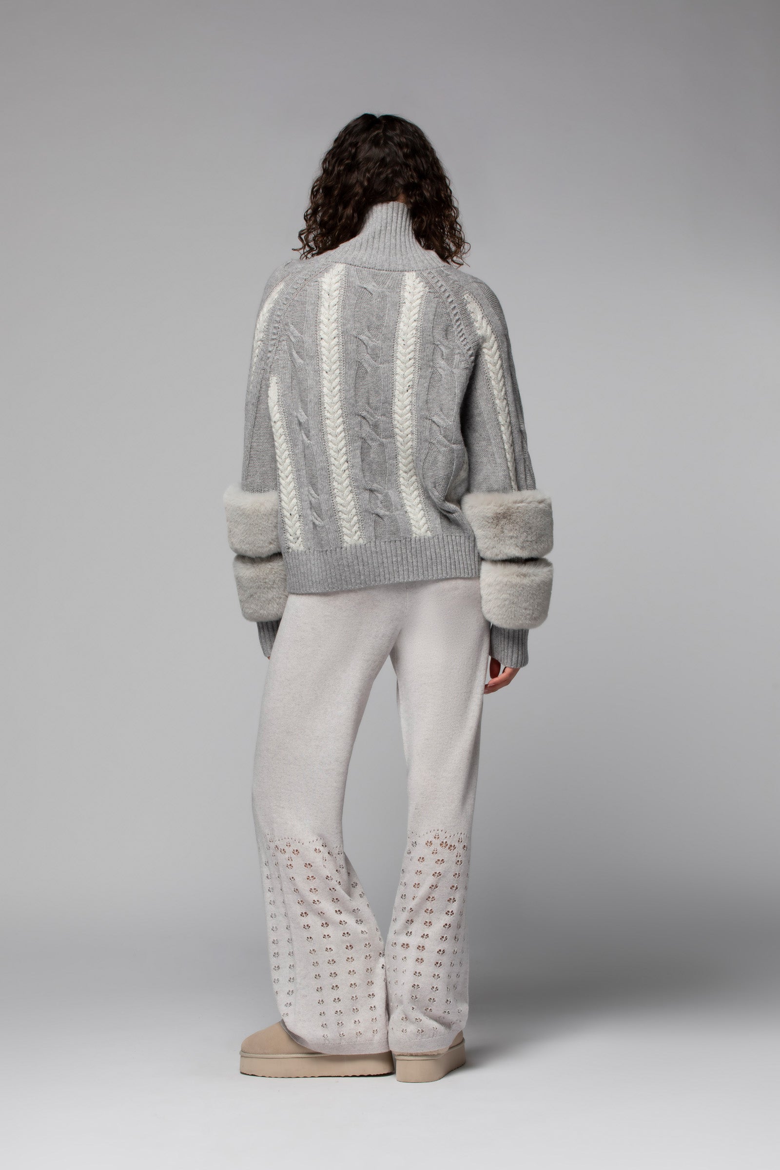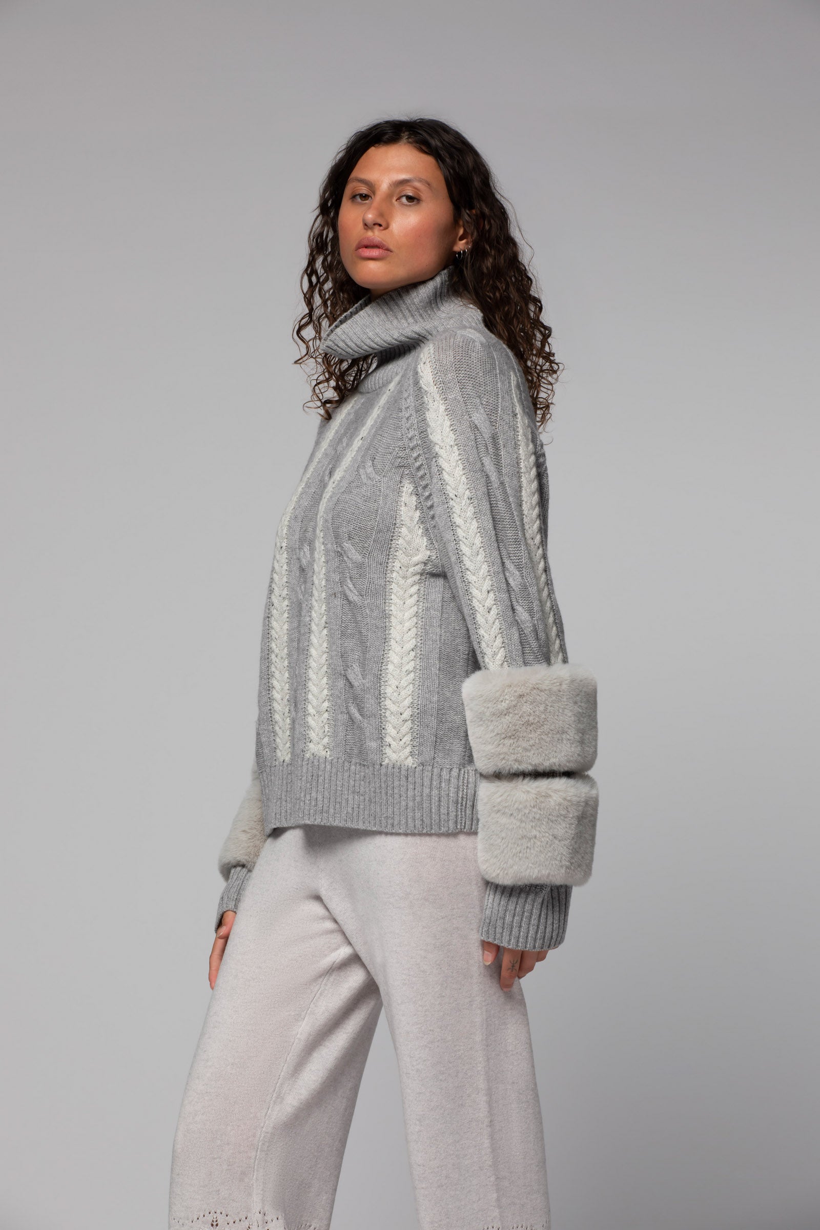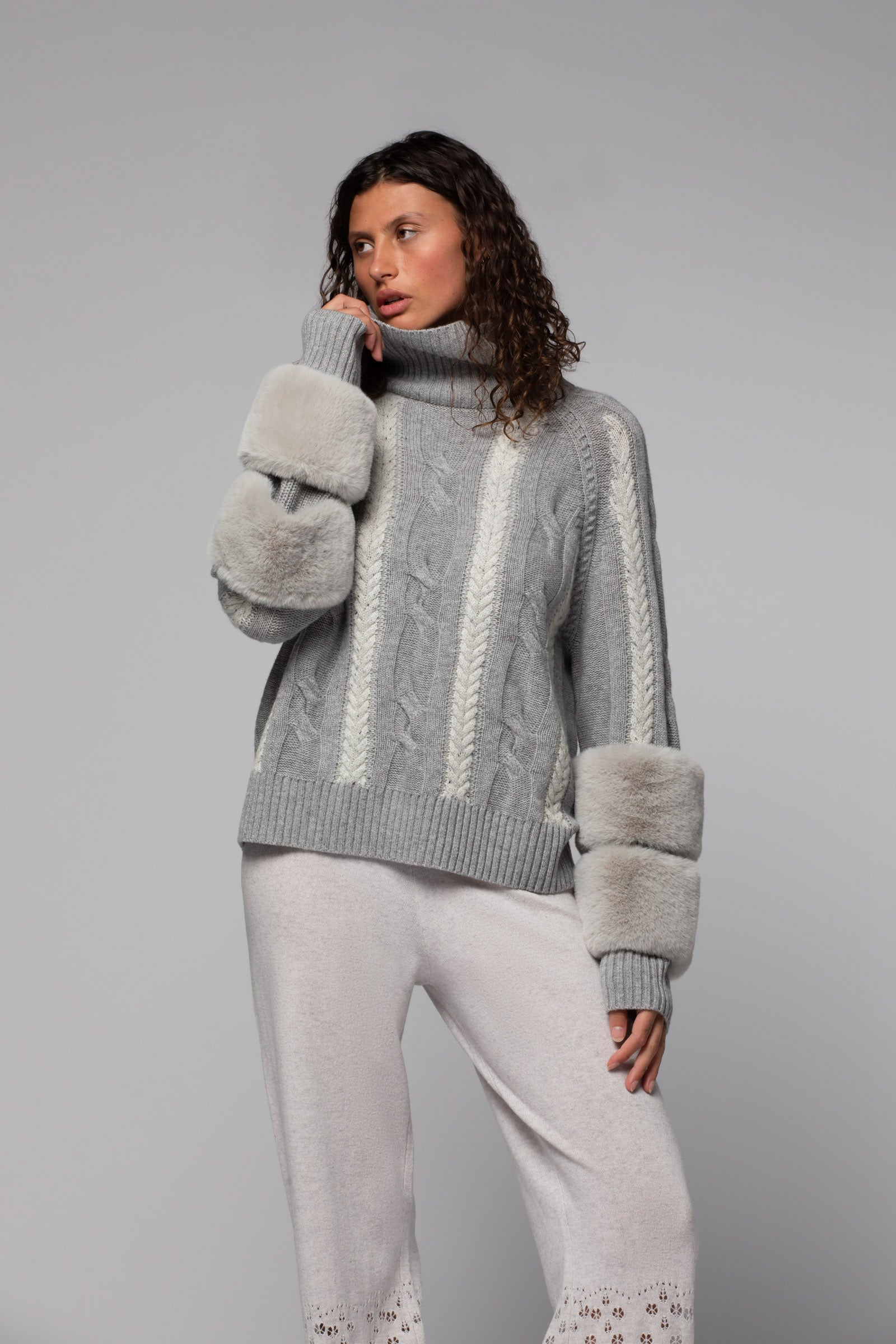 Notre pull PAZ est un véritable bijou. Confectionné en laine et cachemire, il séduit par ses torsades graphiques, ses tresses contrastées et ses larges finitions en bord-côtes, qui structurent la silhouette avec raffinement. Avec sa coupe droite, ses manches longues raglan et son col roulé enveloppant, il réchauffe l'allure avec douceur et s'impose comme un must-have de la saison hivernale. Son atout charme ? Des manchons en fausse fourrure Furever, au volume généreux et à la texture ultra désirable, qui signent un vestiaire casual-chic affirmé.