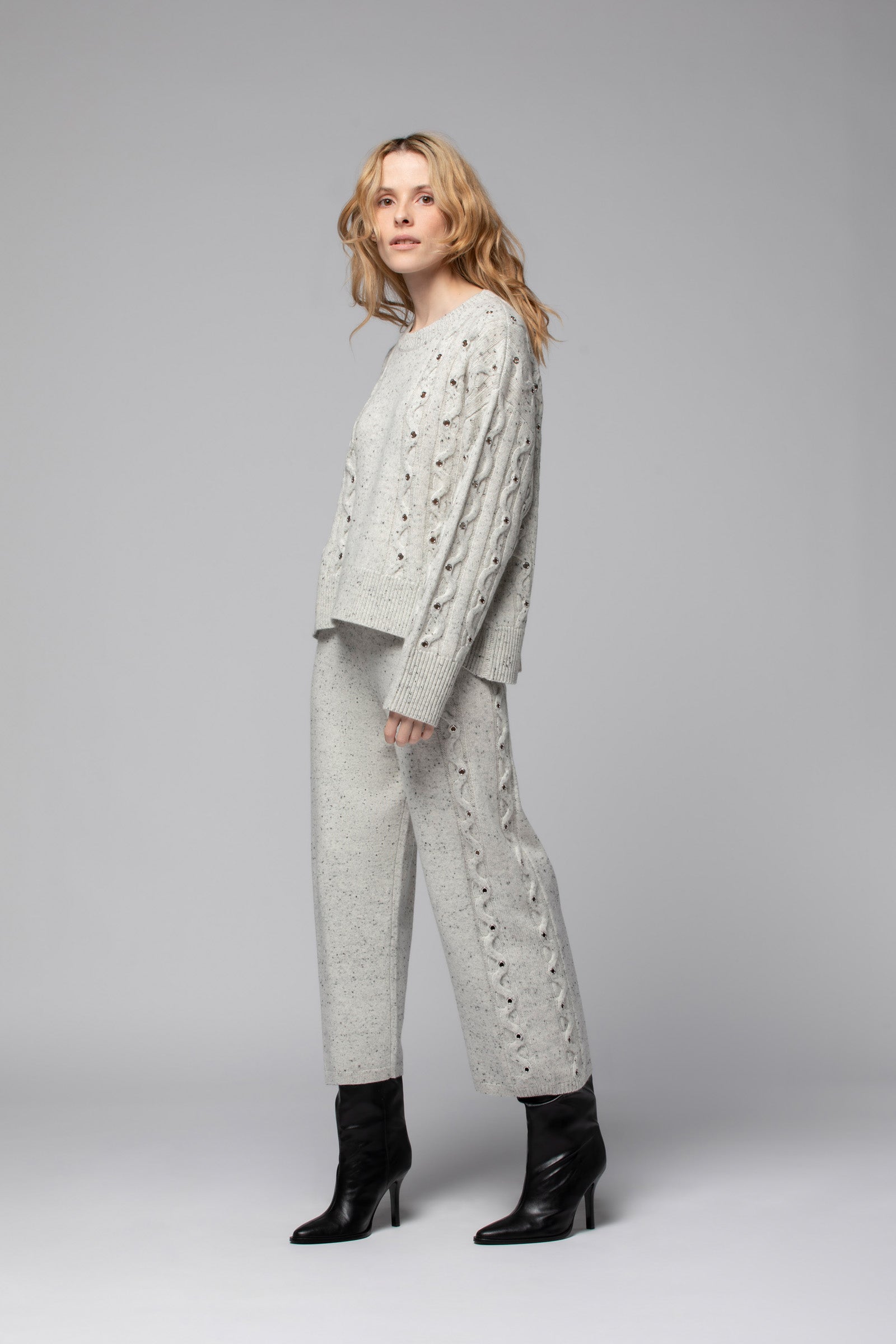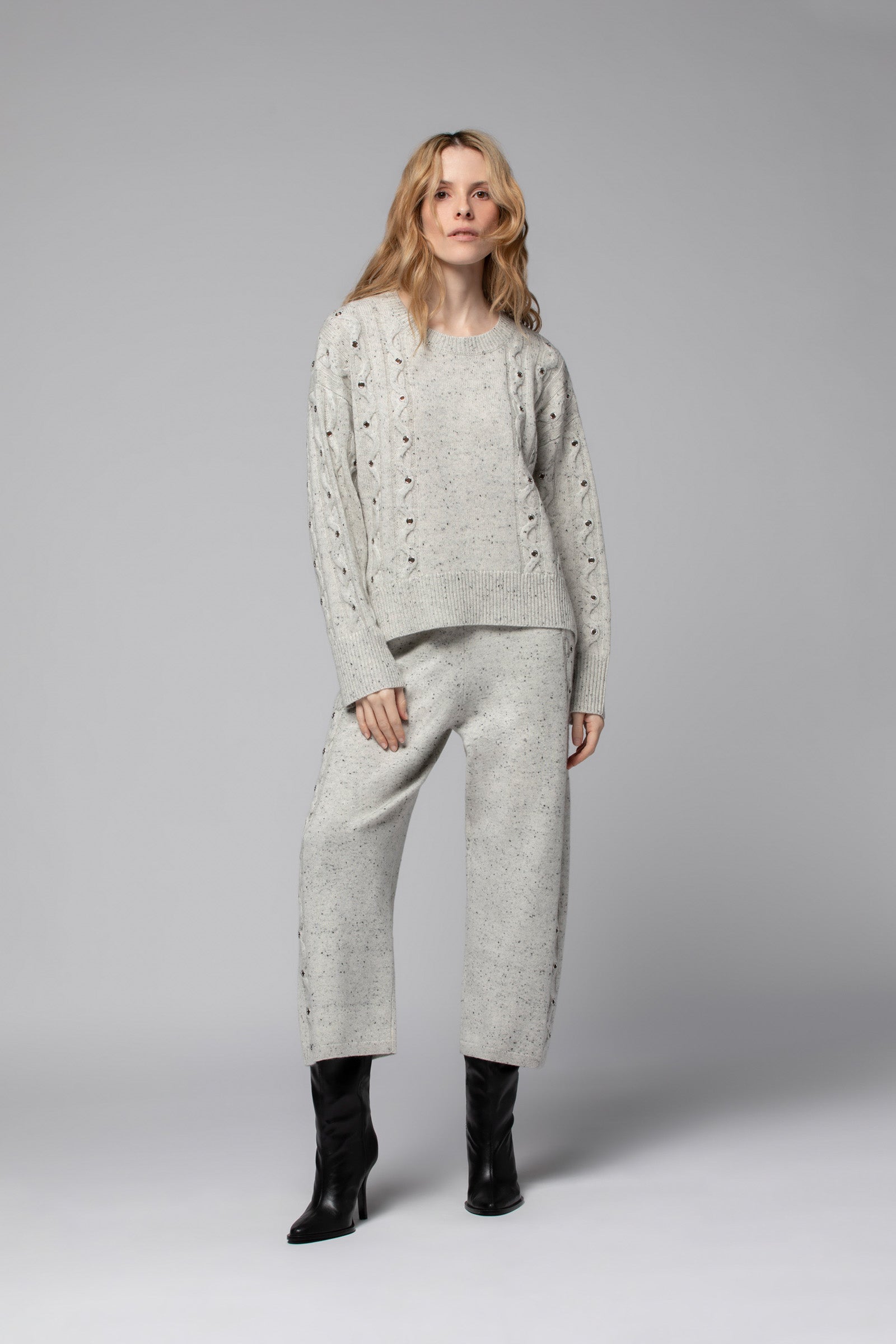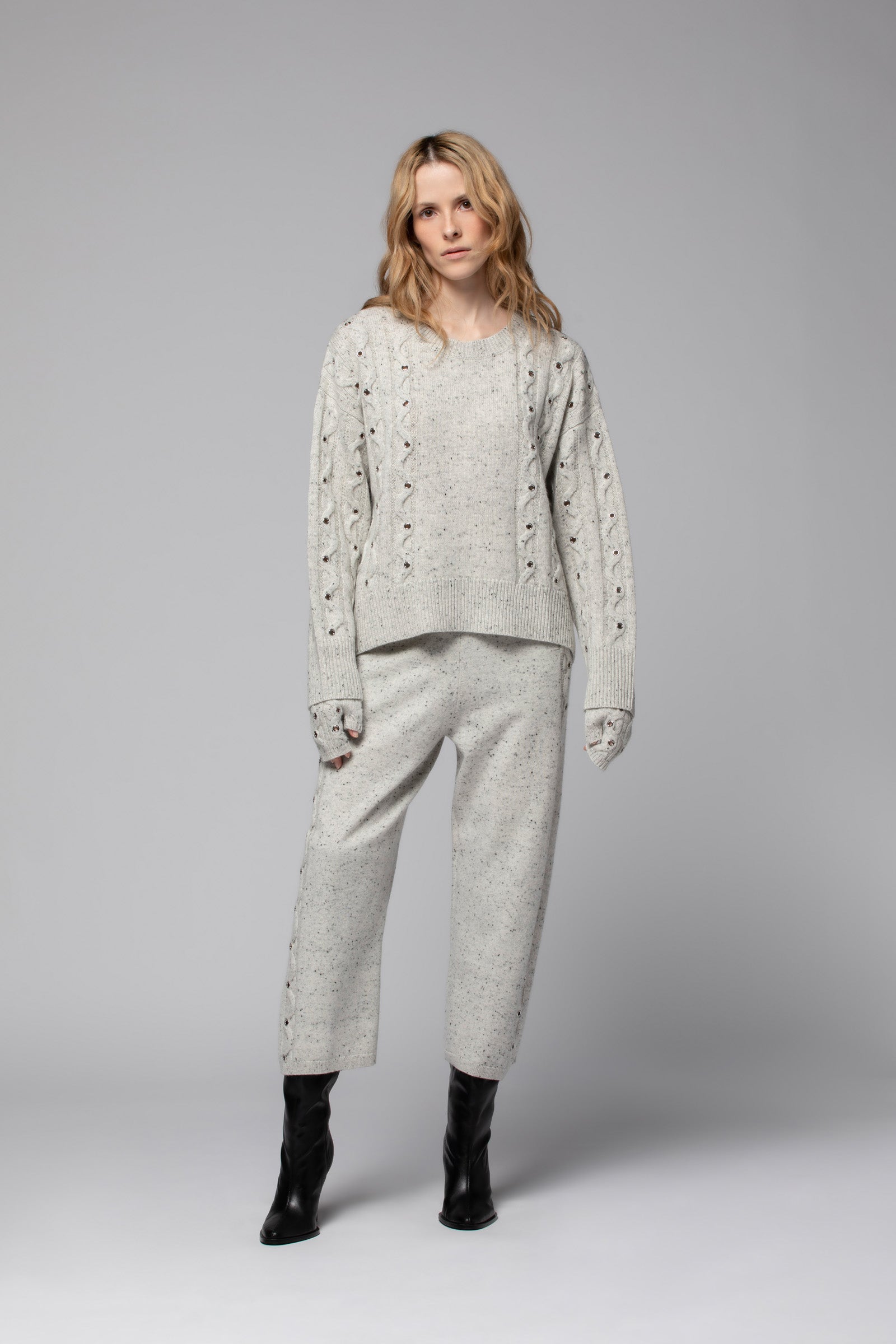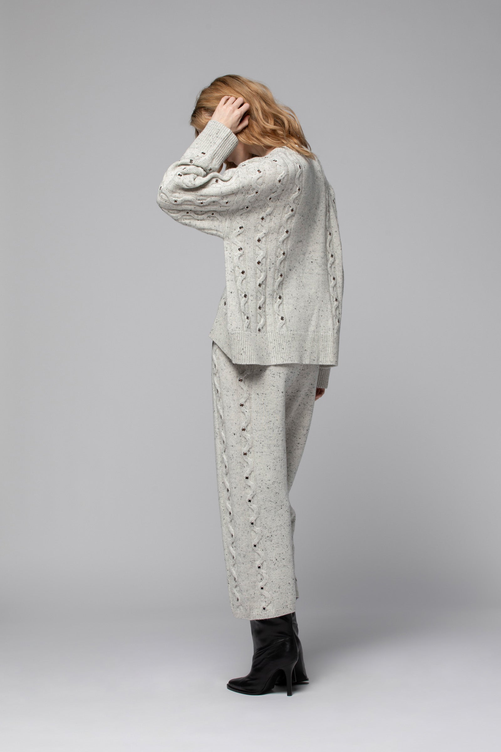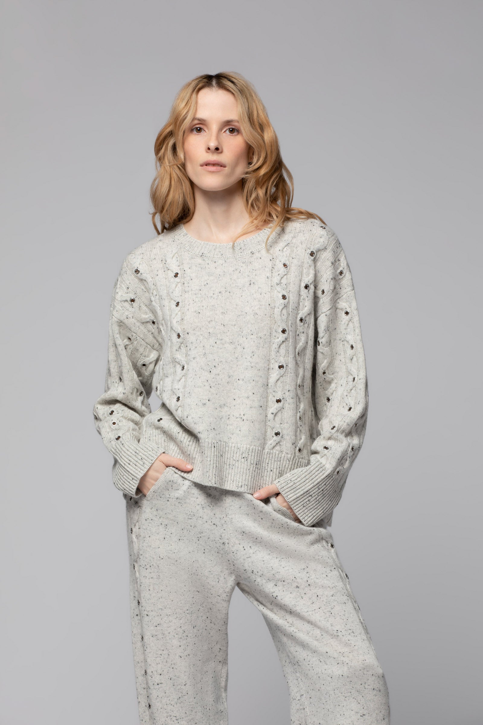 Notre pull POLINE est une pièce de caractère, à l’allure résolument contemporaine. Confectionné dans une douce maille de laine et cachemire, il séduit par son jeu de torsades ponctué d’œillets métalliques, qui apportent du relief et soulignent son esthétique ultra moderne. Sa coupe droite et son encolure ronde en font un essentiel du quotidien, aussi confortable que raffiné, tandis que ses épaules tombantes insufflent une décontraction parfaitement maîtrisée. De larges bord-côte — au col, à l’ourlet et aux poignets — accentuent ses lignes graphiques avec justesse.