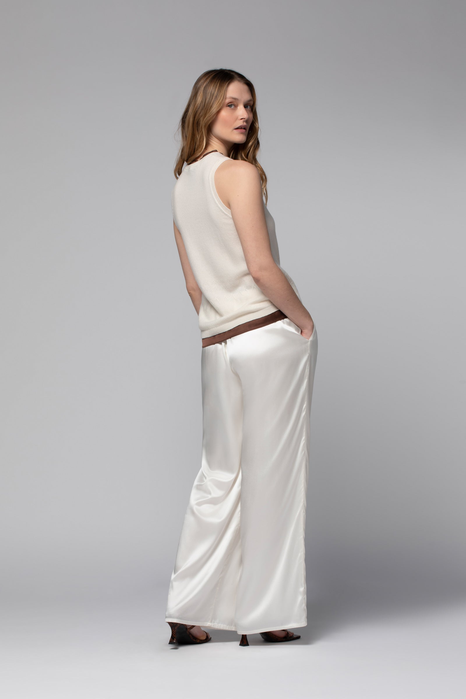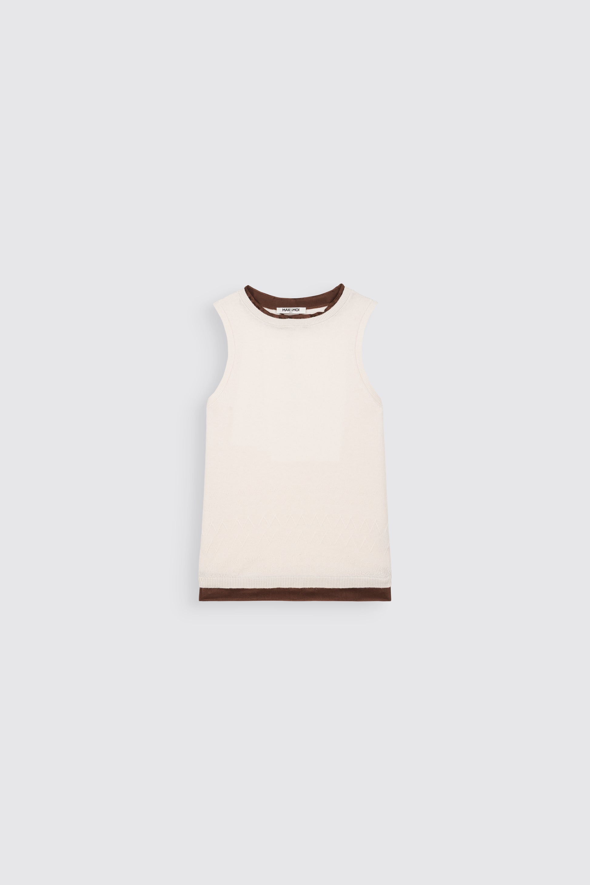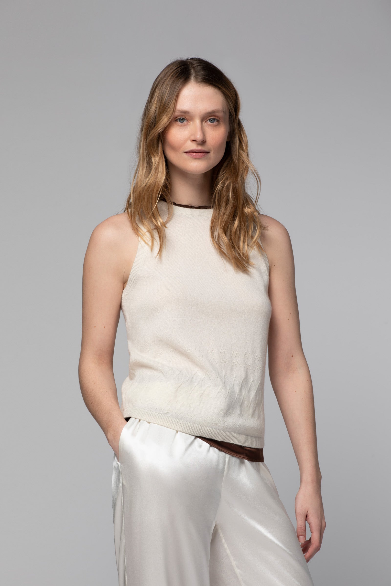 Notre top en maille TORY est une création raffinée qui saura rehausser tous vos looks du quotidien. Confectionné dans un doux mélange de laine et cachemire, ce modèle sans manches séduit par ses lignes épurées et son jeu de maille créative, qui dévoile l'iconique "M" de MAX&MOI pour une signature tout en finesse. Il se distingue par ses finitions en soie contrastées, au col et à l'ourlet, qui accentuent son allure féminine et apportent une touche de légèreté.