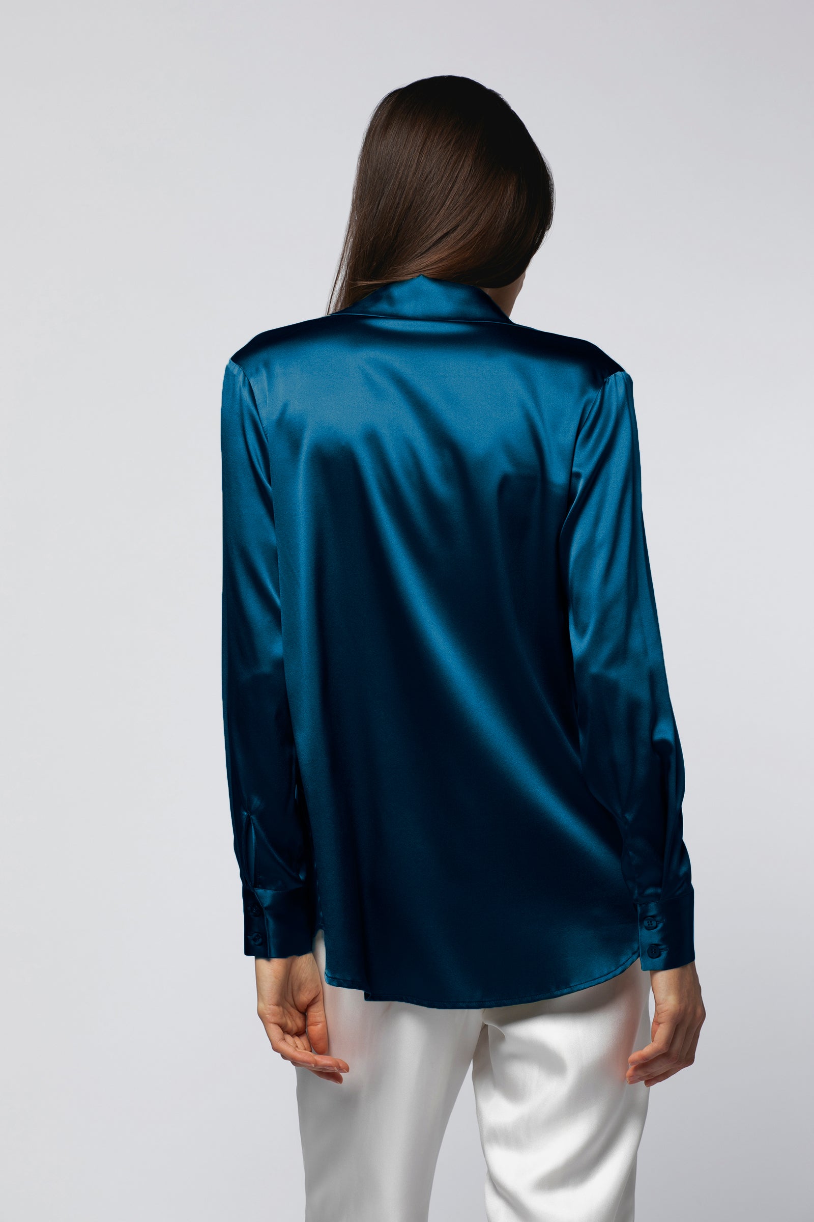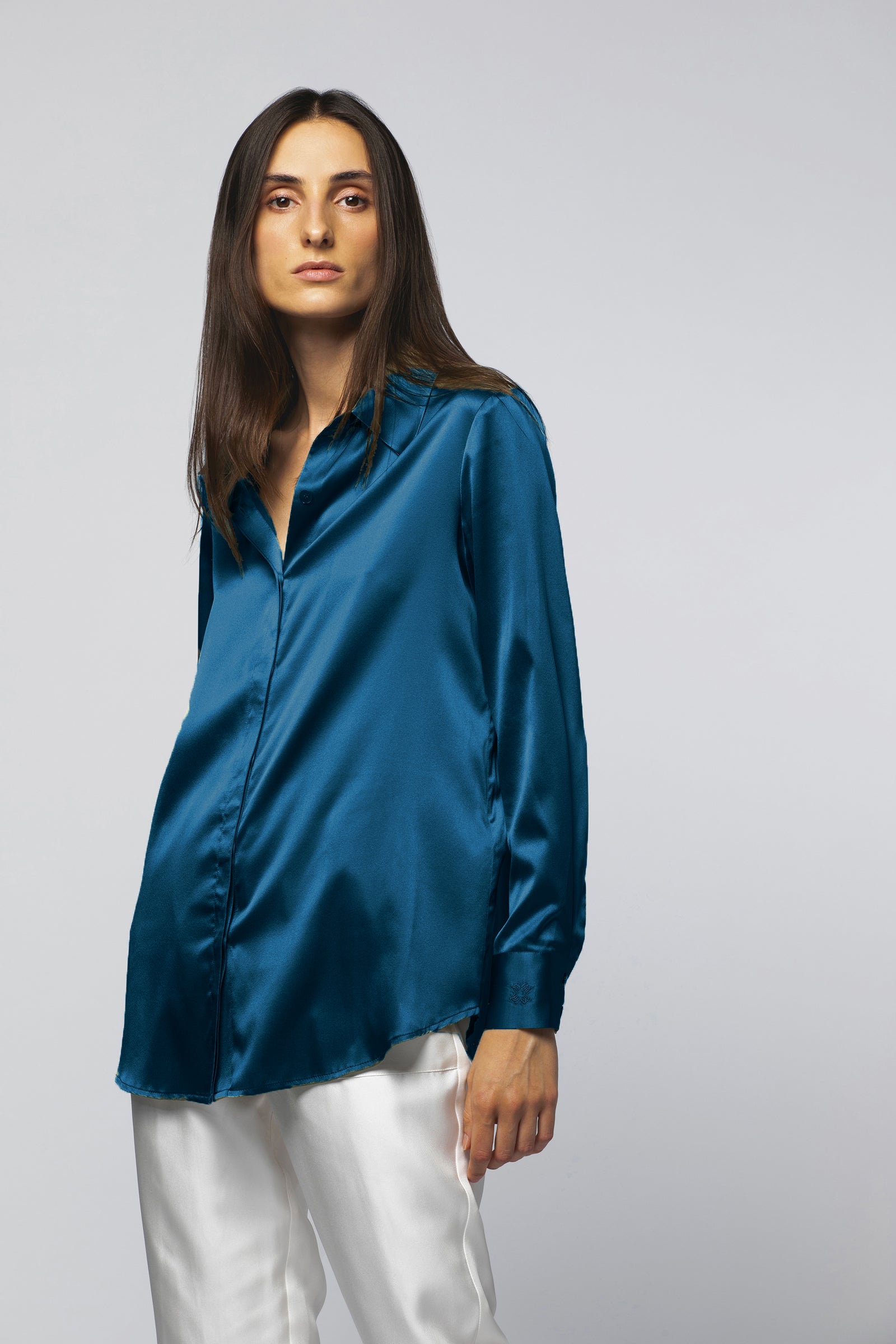 Elégante et glamour, notre chemise Levy bleu pétrole confectionnée en 100% soie, est un incontournable du vestiaire féminin. De coupe légèrement ample, elle est dotée d'un joli col chemise. Grâce à sa patte de boutonnage cachée sur le milieu devant, elle peut se porter ouverte ou fermée selon vos envies. Ses longues manches sont sublimées par des poignets chemises agrémentés de boutons nacrés et d'une broderie ton sur ton MAX&MOI.