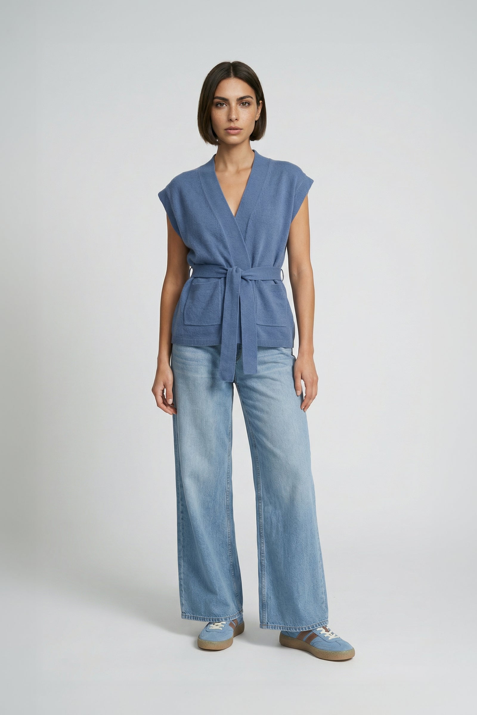 Notre cardigan GAYA incarne l’élégance décontractée des beaux jours. Confectionné dans une maille ultra-fine 100% cachemire, il procure confort et chaleur tout en préservant une silhouette légère grâce à son design sans manches. Sa coupe droite et fluide offre un tombé parfait et accompagne naturellement le mouvement, pour plus d'aisance au quotidien. Porté ouvert ou ajusté, il s’accompagne d’une ceinture assortie qui souligne délicatement la taille et permet de moduler l'allure au gré de vos envies. Ses lignes épurées se distinguent par deux poches plaquées à l’avant et des finitions en bords-côtes, qui viennent structurer l'ensemble et apportent une touche de modernité.