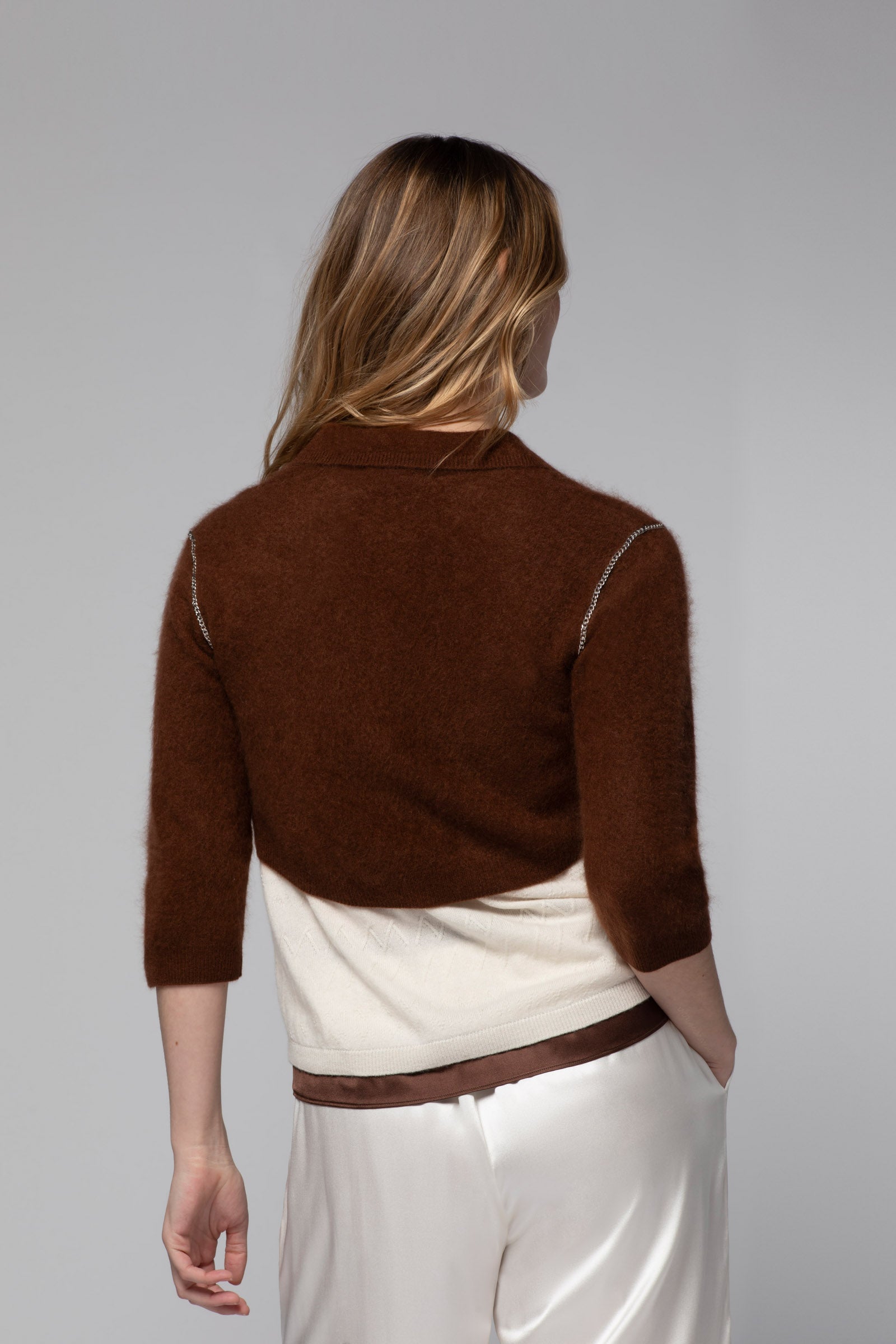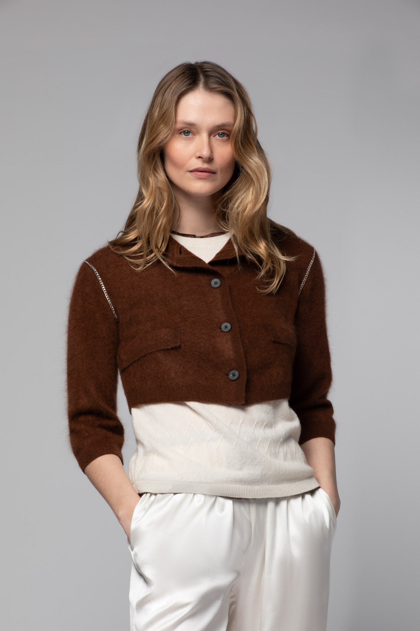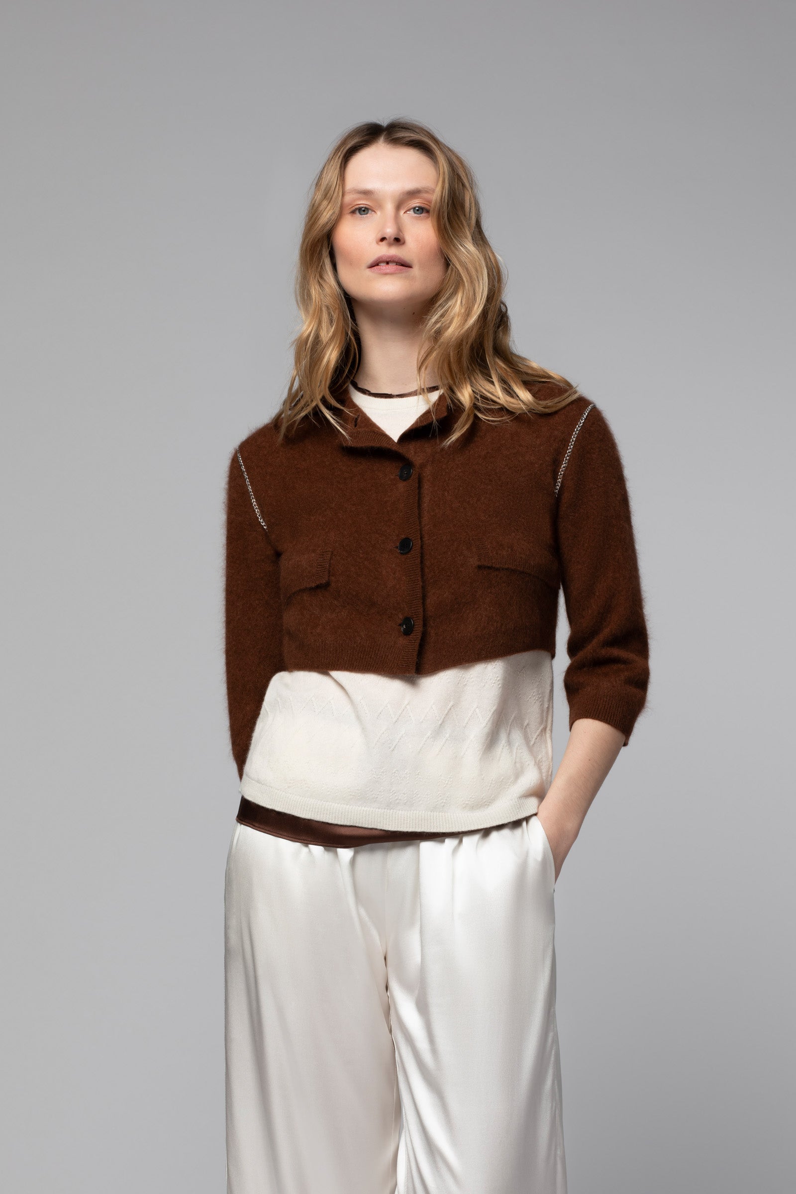 Notre gilet GISELLE séduit par son allure chic et son esprit résolument couture. Confectionné dans une maille douce et duveteuse en laine et cachemire, il se distingue par son col chemise et sa fermeture boutonnée rehaussée de jolis boutons contrastés. Ses manches trois-quarts dévoilent une chaîne bijou aux épaules, qui insuffle une féminité moderne et assumée. Deux fausses poches à rabat parachèvent son design avec raffinement.