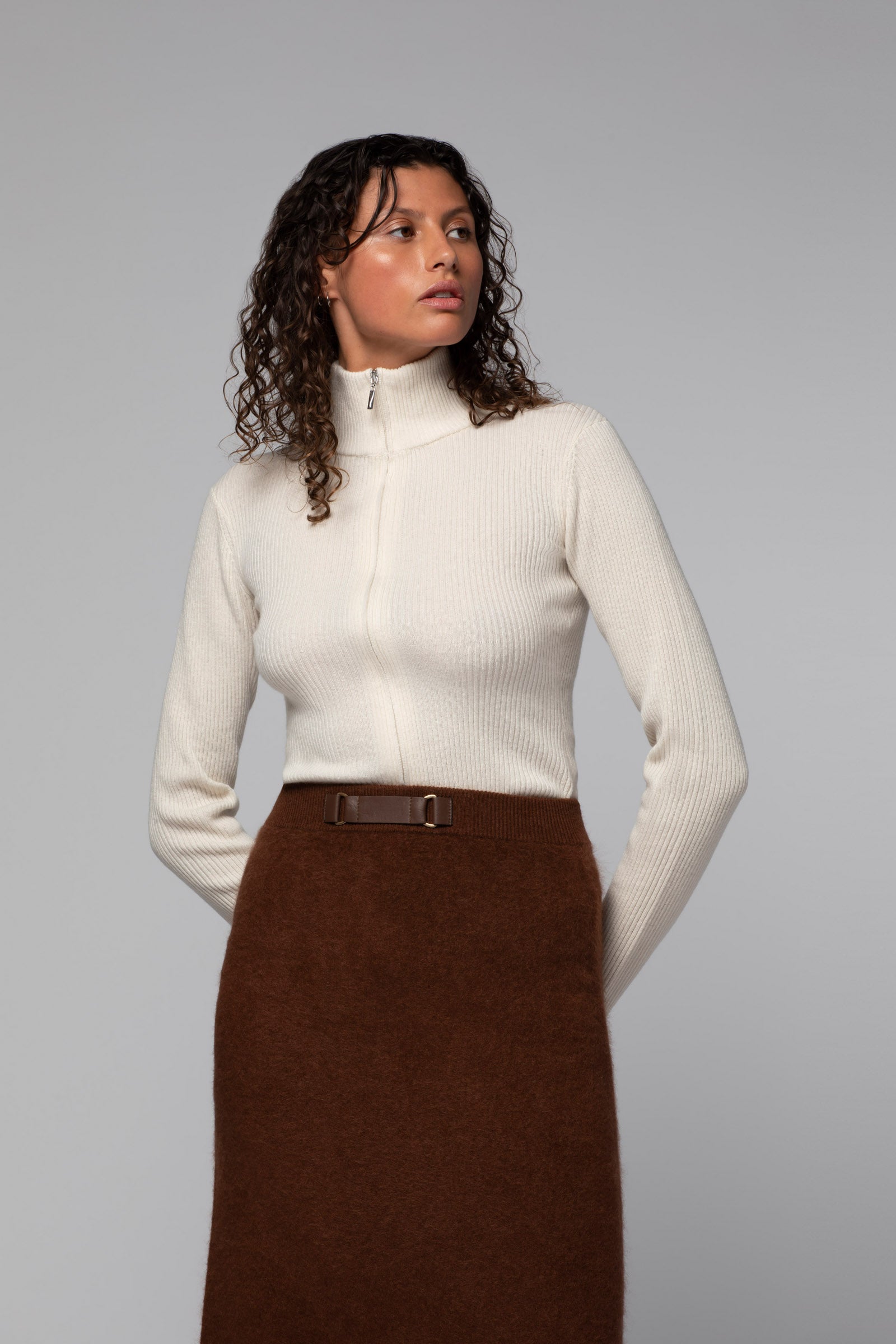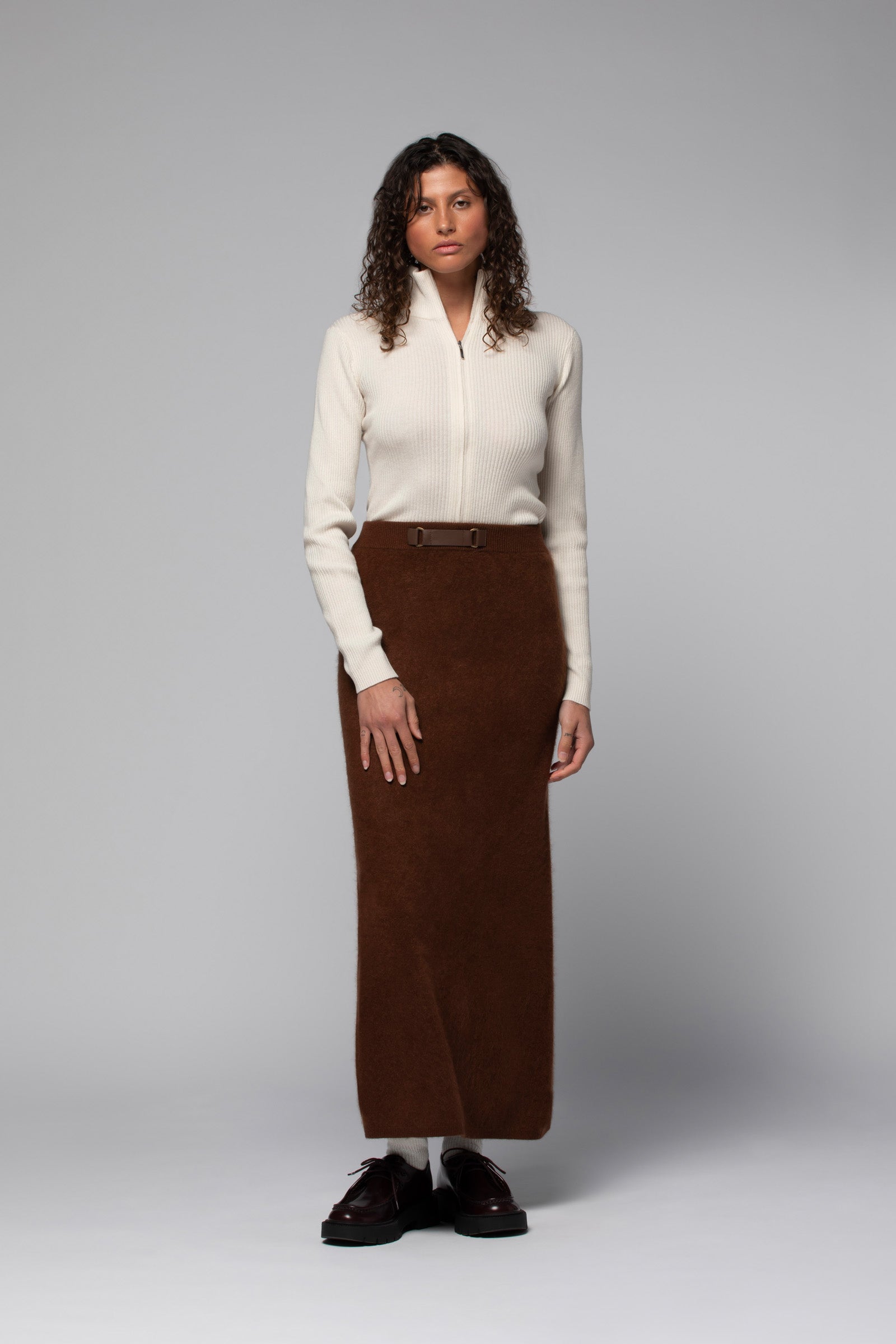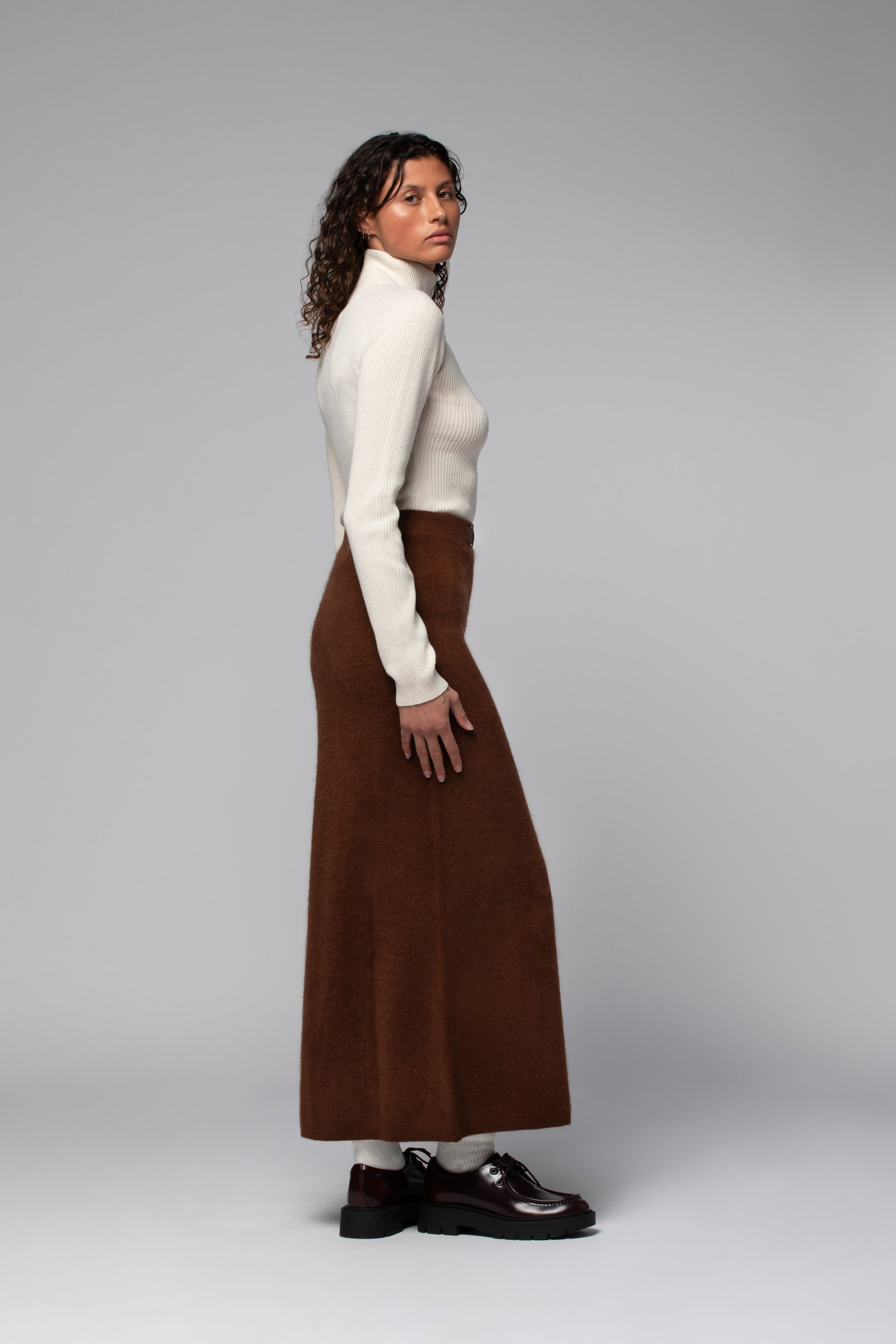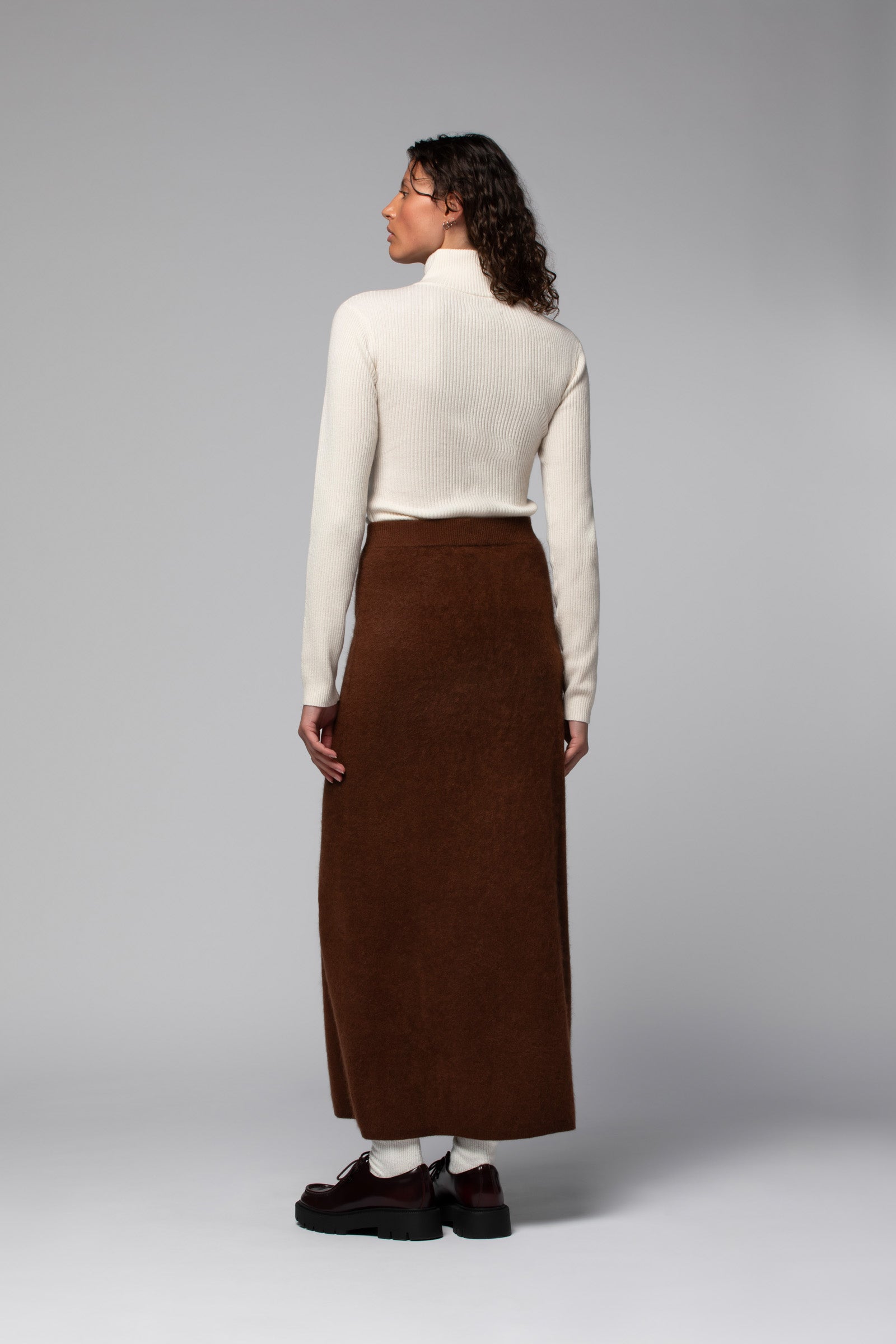 Élégante et intemporelle, notre jupe JOY séduit par sa maille brossée en laine et cachemire à la texture duveteuse, idéale pour la saison hivernale. Sa coupe longue épouse les hanches avec douceur, sans les contraindre, avant de s'épanouir dans un tombé fluide et évasé jusqu'aux chevilles, dessinant une silhouette ultra féminine. La taille élastique offre un confort absolu au quotidien, tandis qu’une patte en cuir ton sur ton, apposée à la ceinture, vient rehausser ses lignes épurées avec modernité.
