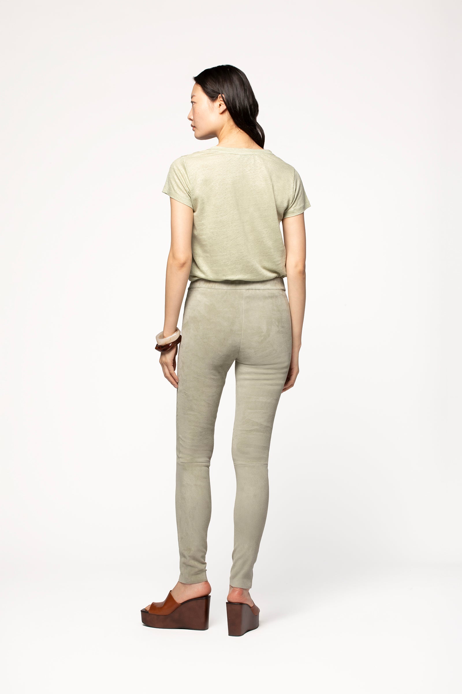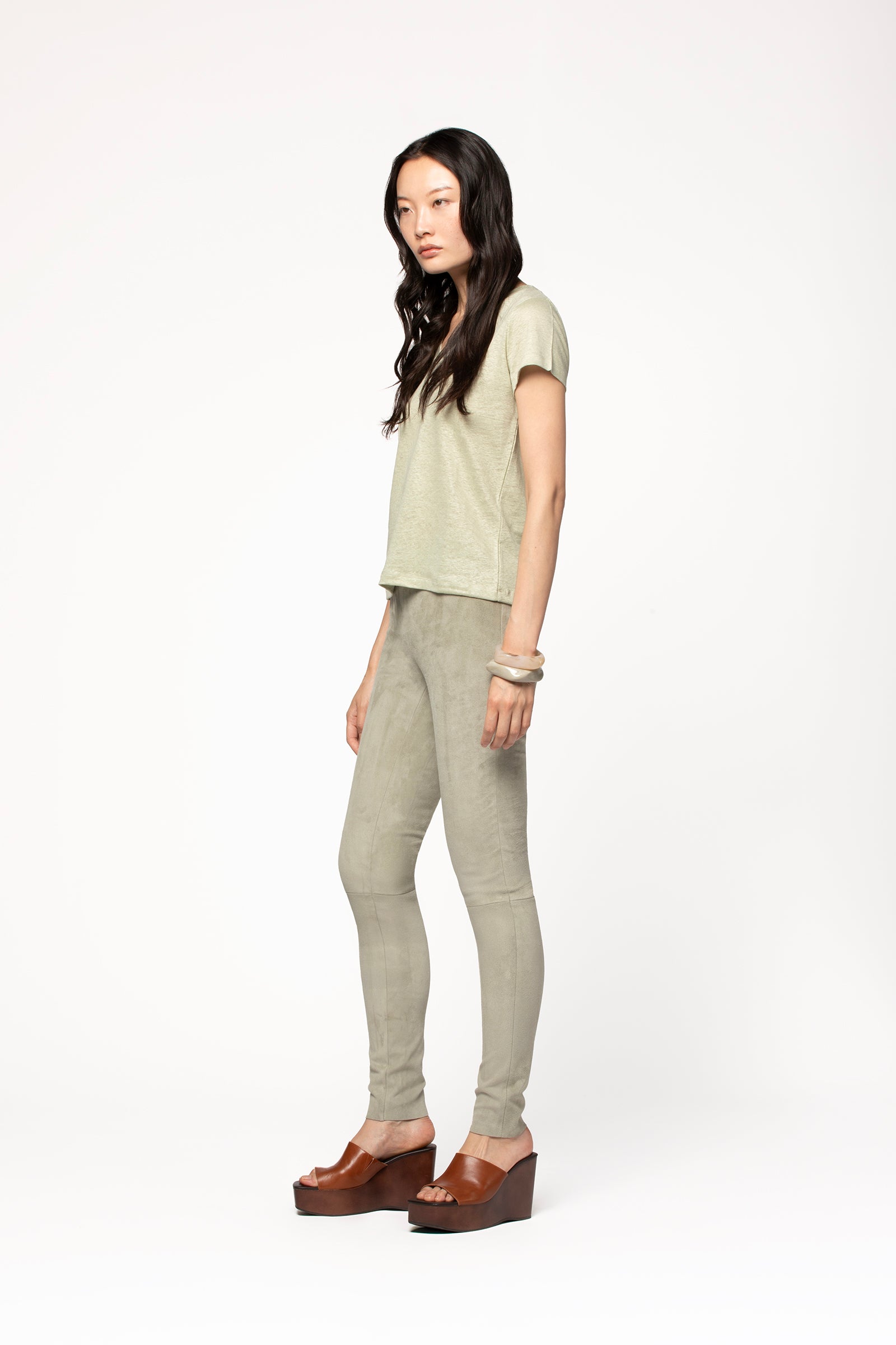 Pièce iconique du vestiaire MAX&MOI depuis 2015, notre PERLEGGING se réinvente cette saison en daim, pour une esthétique boho-chic plus flatteuse que jamais. Confectionné dans un sublime cuir velours issu des plus grands peaussiers français, ce legging en daim femme fait partie de ces essentiels du quotidien, qui vous accompagnent en toute occasion. Doté d’une taille élastique, il présente une coupe slim qui sublime chaque silhouette. Il séduit par sa texture douce et lisse ainsi que l'élégance de son cuir stretch, qui épouse les mouvements et galbe l'allure. Pensé pour allier confort et style, ce legging en cuir femme a été conçu avec une particularité technique : la découpe du genou a été légèrement abaissée afin de préserver une liberté de mouvement optimale et ne pas gêner la flexion. Versatile, ce legging en daim se prête à toutes les envies. Associez-le à une chemise en soie pour un look aux accents officewear, ou optez pour un style plus décontracté avec une maille d'été en cachemire léger ou avec un top en lin de la collection MAX&MOI. - Legging en daim stretch - Coupe slim - Taille élastique - Découpe sous le genou - Peausserie et fabrication française - Modèle permanent - PERLEGGING-E26KAKI
