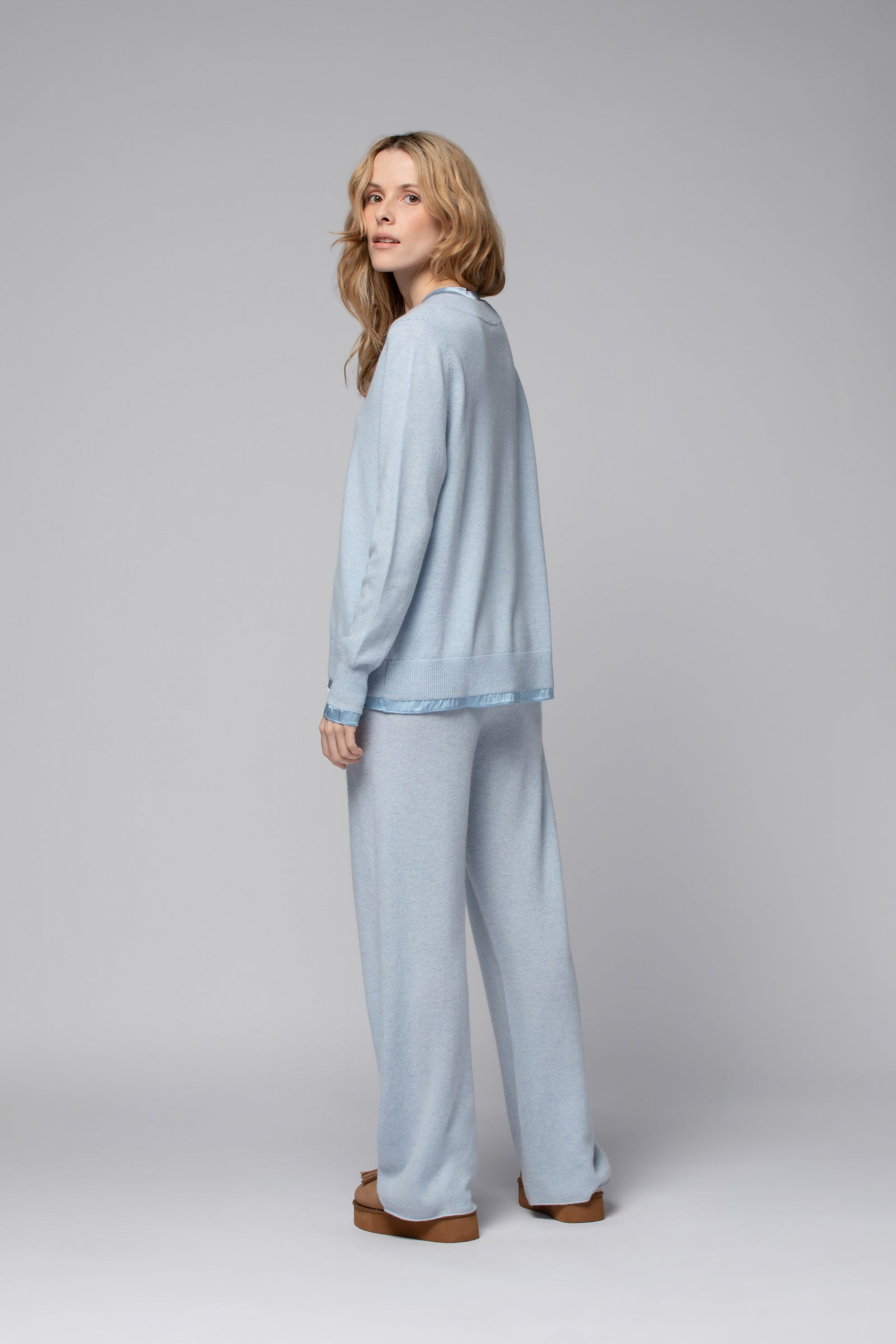 Aussi raffiné que confortable, notre pantalon BASIL s’impose comme un essentiel du vestiaire féminin. Il est confectionné dans un superbe jersey de laine et cachemire, promesse d'une douceur et d'une chaleur absolues. Ses jambes larges dessinent une allure à l'élégance décontractée, tandis que sa taille élastique garantit un ajustement parfait et s'adapte à toutes les morphologies. Il se distingue par une délicate bande froncée en soie à la taille, qui habille la silhouette d'une touche de sophistication discrète. Deux poches latérales, rehaussées d’une fine bordure en maille côtelée, viennent parfaire ce modèle.