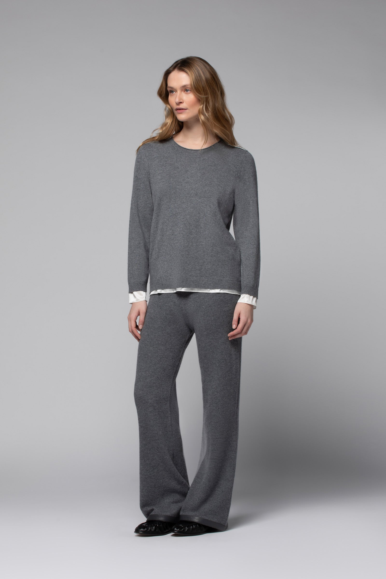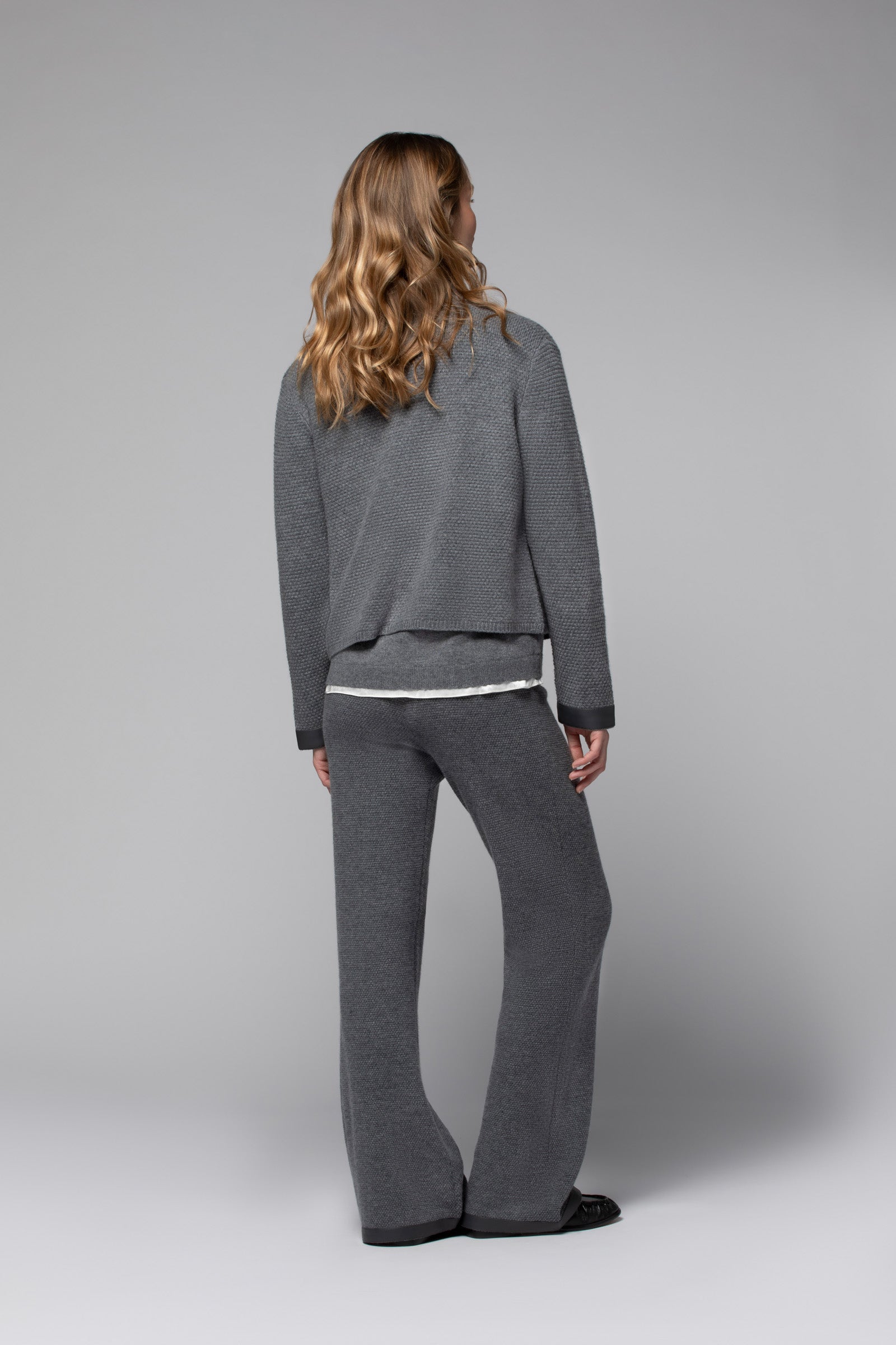 Taille haute, jambes longues et évasées : notre pantalon BOSTON réinvente l’allure emblématique des années 70 dans une version résolument contemporaine. Confectionné dans un doux mélange de laine et cachemire, il séduit par sa maille nid d’abeille et ses finitions en cuir — à la ceinture, aux poches et à l’ourlet — qui modernisent ses lignes avec raffinement. On aime particulièrement le détail des fausses poches passepoilées en cuir à l’avant, qui insufflent une note chic et un brin rétro. Pratique, une fermeture zippée sur le côté facilite l’enfilage.