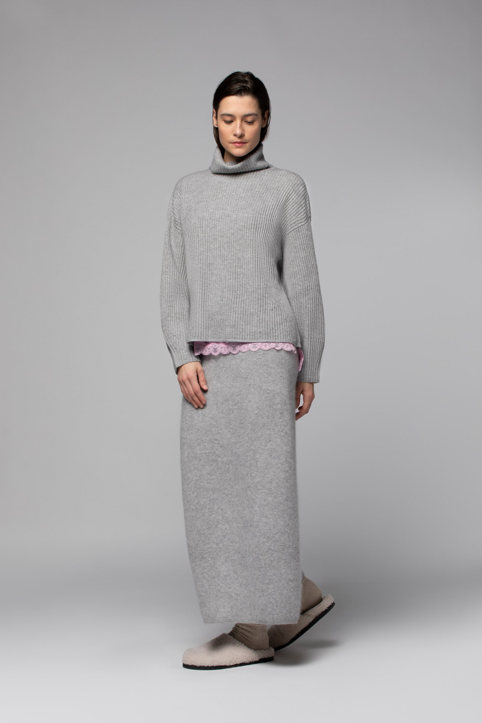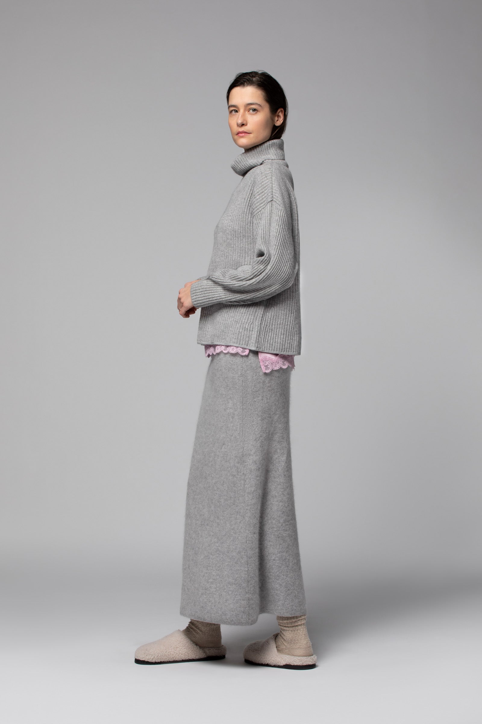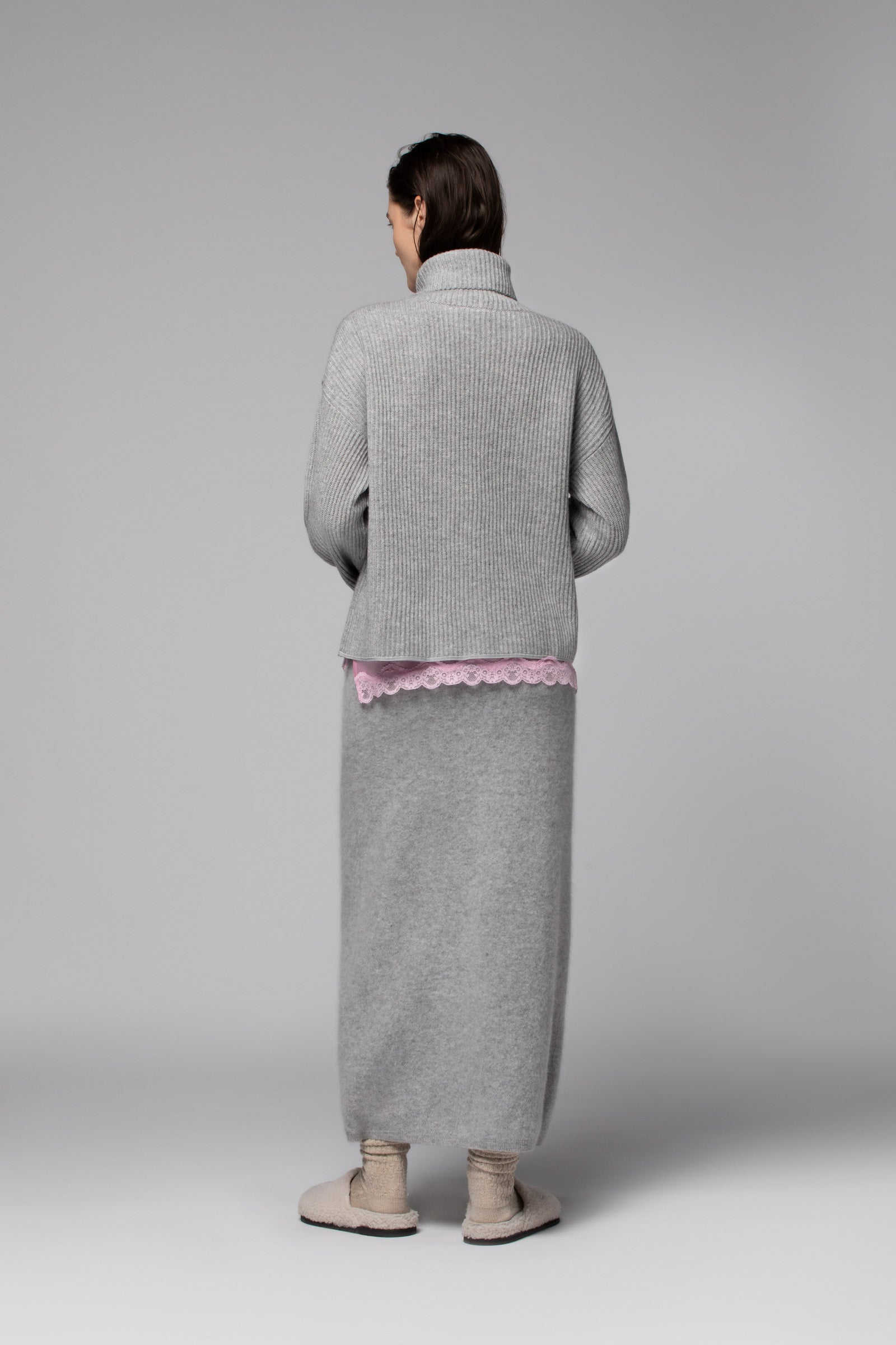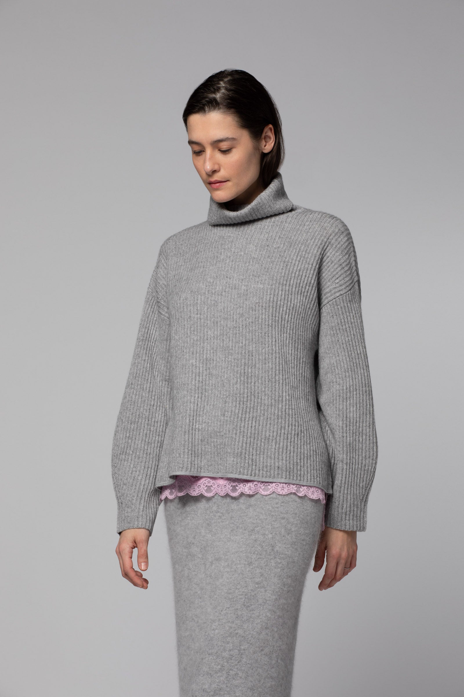 Avec notre pull en laine et cachemire POPPY, le col roulé affirme plus que jamais son statut d’icône du vestiaire féminin. Il séduit par sa coupe ample, ses manches longues légèrement bouffantes et ses épaules tombantes, qui lui confèrent une élégance décontractée, tandis que sa maille en côtes anglaises modernise ses lignes avec raffinement. Fidèle à l’ADN de la Maison, il se pare d'une fine bande en cuir ton sur ton à l'ourlet, qui apporte une touche de sophistication discrète.