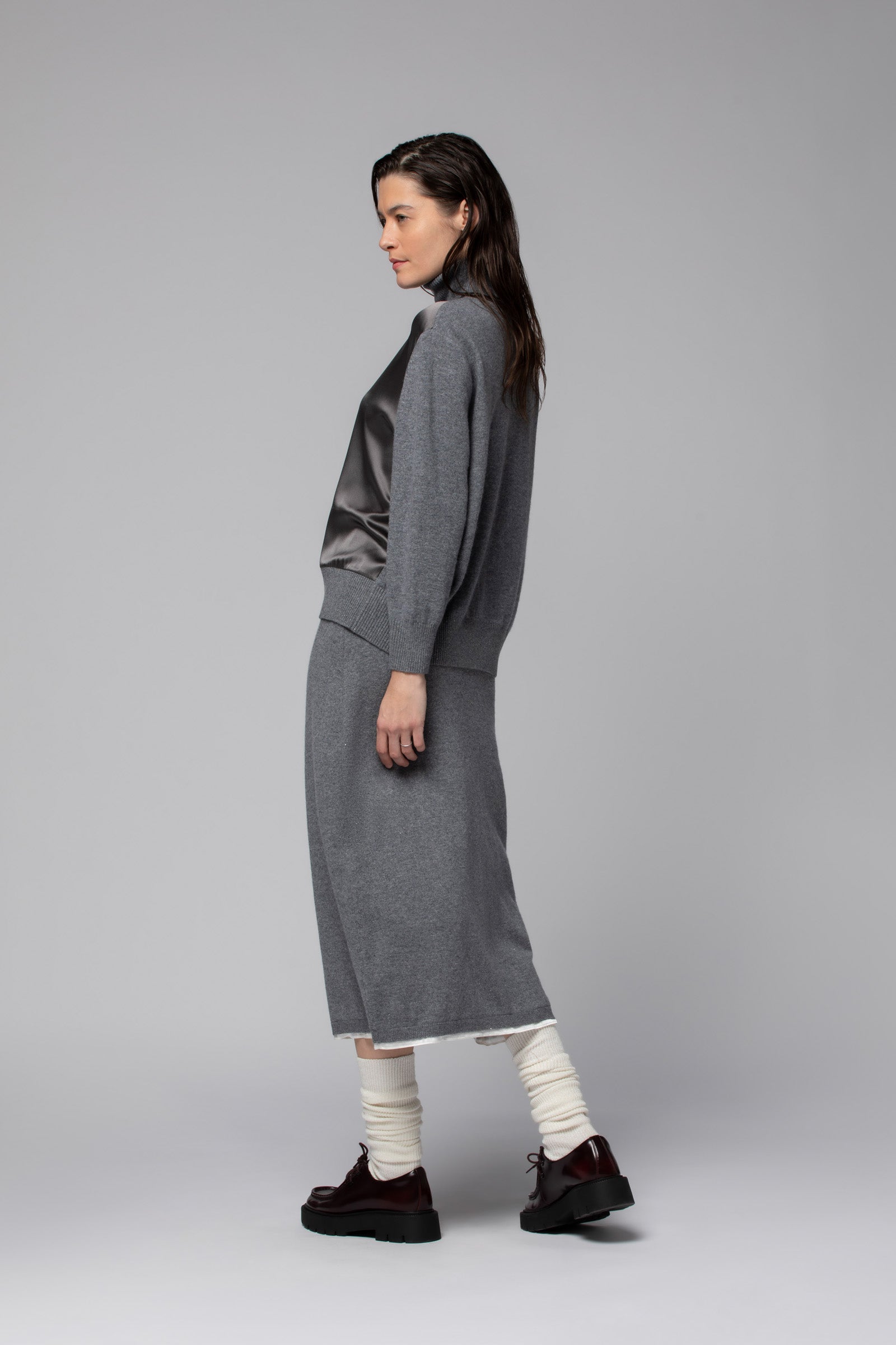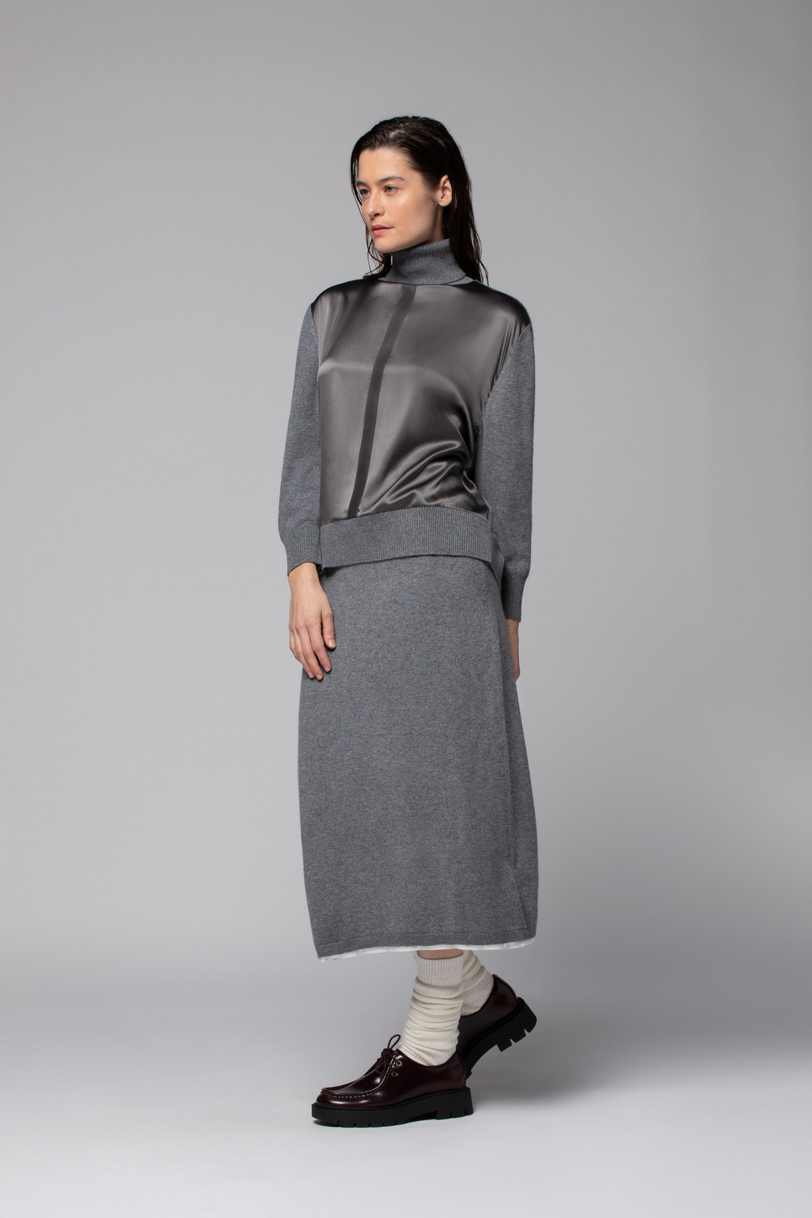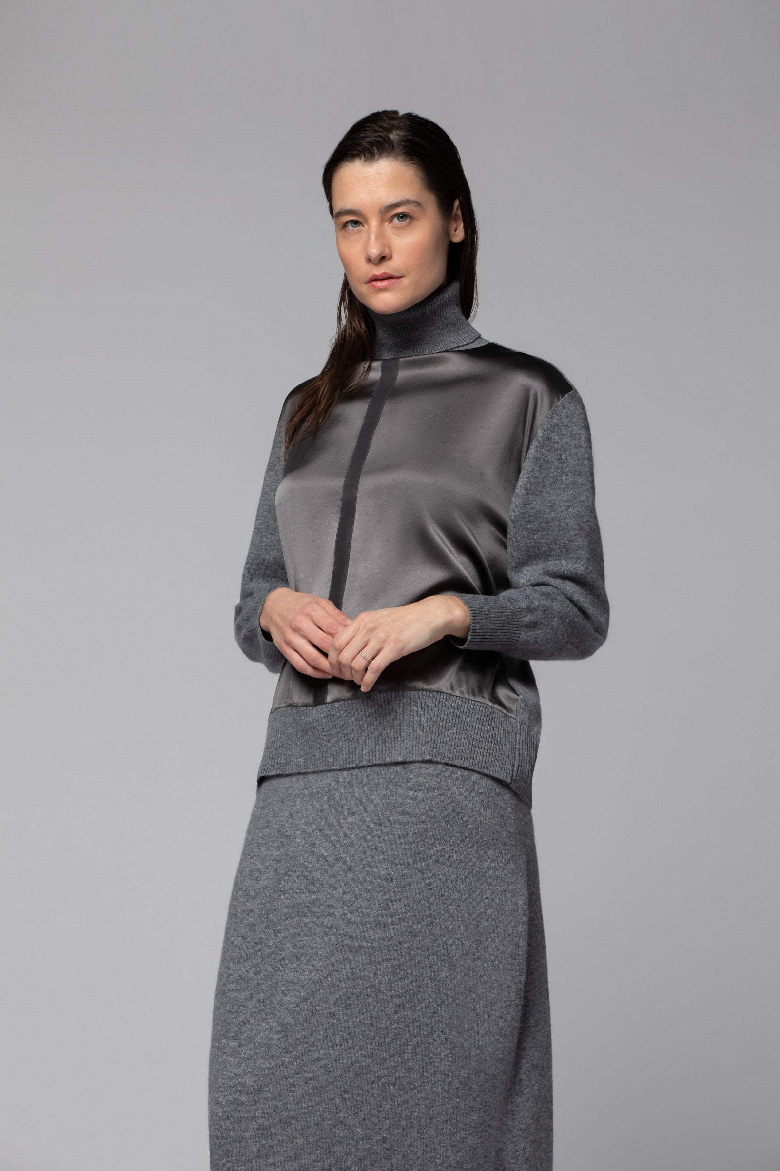 On craque pour l’allure chic et décontractée de notre pull PUMPKY. Confectionné dans une luxueuse maille en laine et cachemire, il se joue des contrastes avec un empiècement en soie sur le devant. Sa coupe droite, légèrement amplifiée, offre une allure facile à vivre au quotidien, tandis que son col roulé réchauffe l'allure avec douceur. Ses finitions en maille côtelée, rehaussées de fils lurex irisés et de sequins discrets, illuminent le col, les poignets et l'ourlet avec une touche d’éclat subtile. Une bande en cuir d'agneau, détail signature de la Maison, habille le buste et structure l'allure avec raffinement.