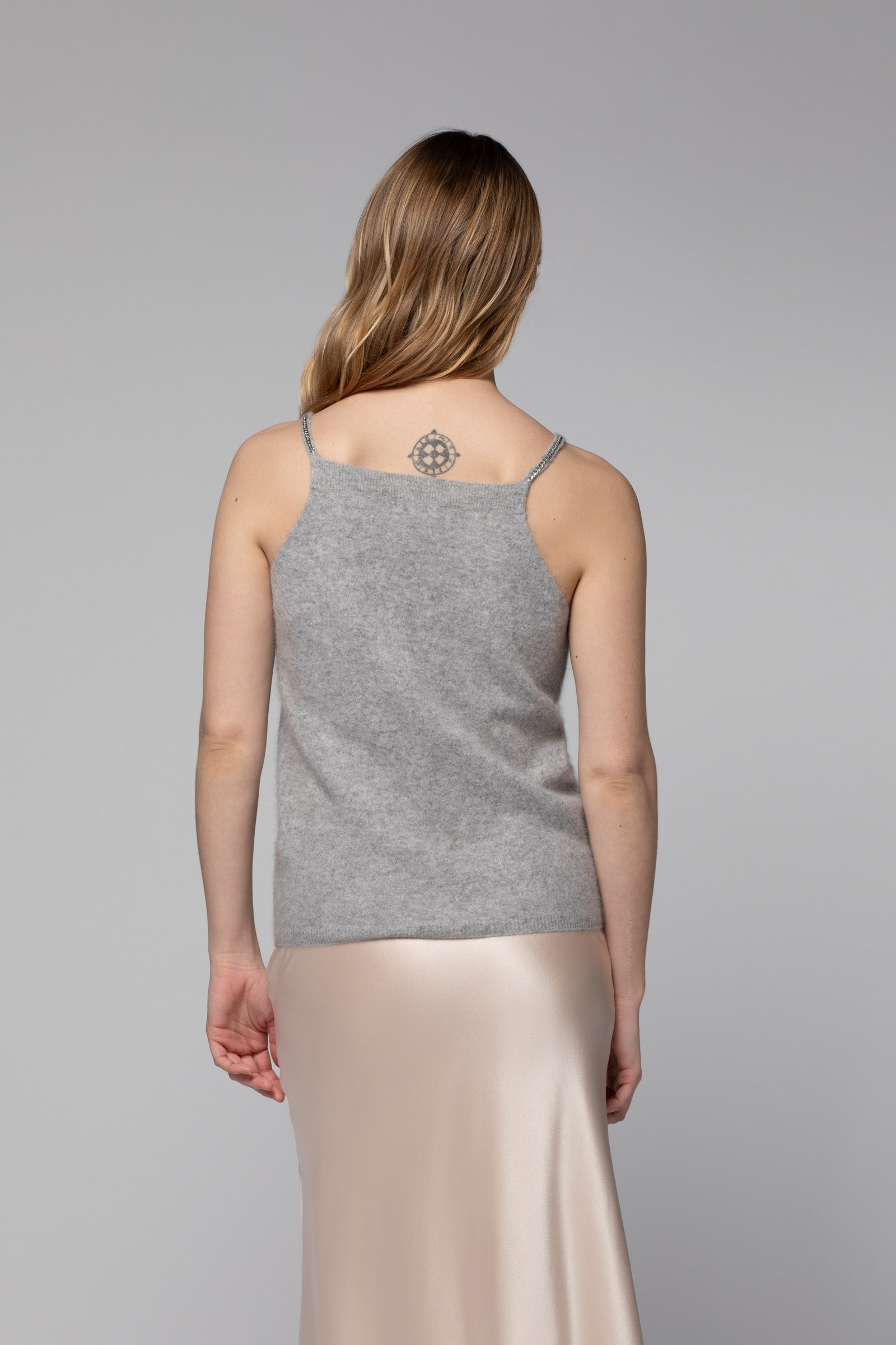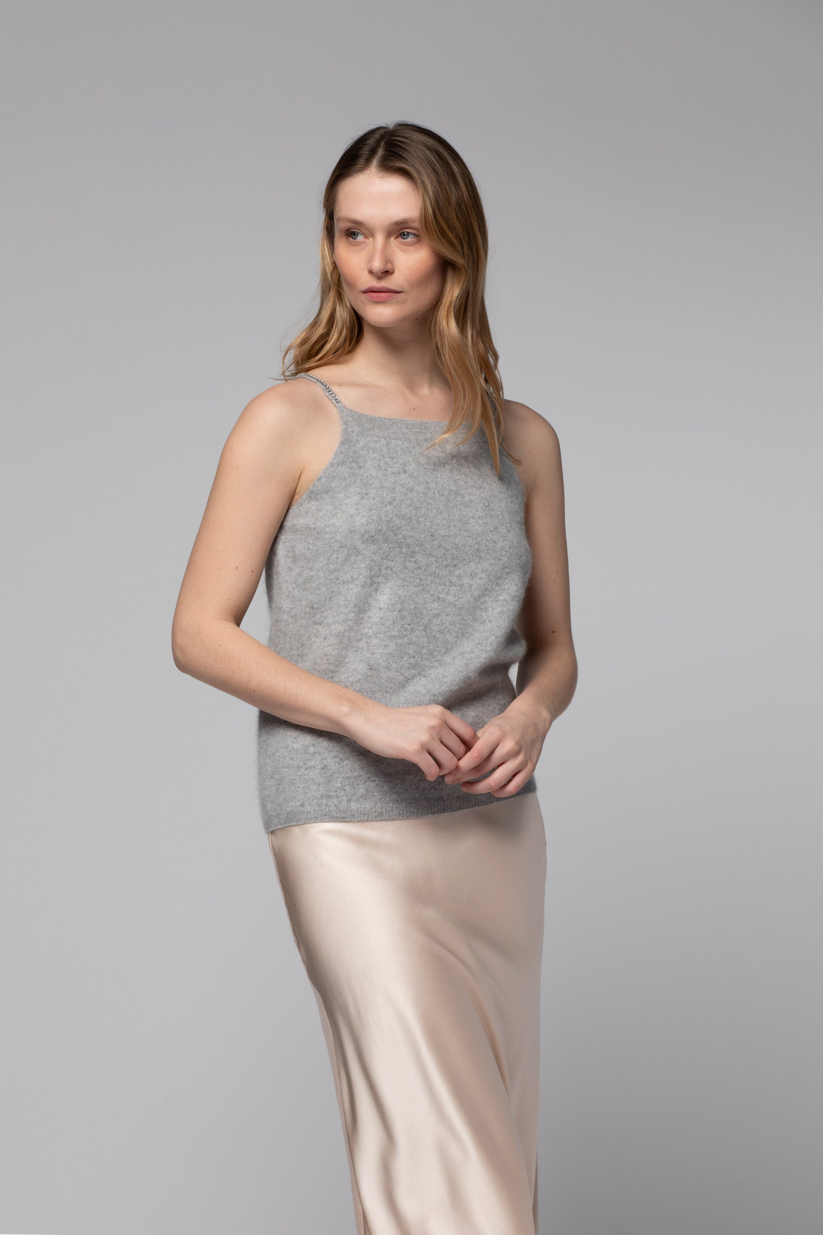 Confectionné dans une maille chaude et duveteuse en laine et cachemire, notre top sans manches TWIGGY épouse la silhouette avec douceur. Son design minimaliste dévoile une encolure carrée, rehaussée d'une finition côtelée, ainsi que de fines bretelles ornées de chaînes bijou, qui mettent en valeur les épaules et insufflent une touche résolument contemporaine. À porter seul ou sous une veste, il se glisse facilement dans un look de jour comme de soir. Un essentiel chic et moderne à ajouter à votre vestiaire hivernal.