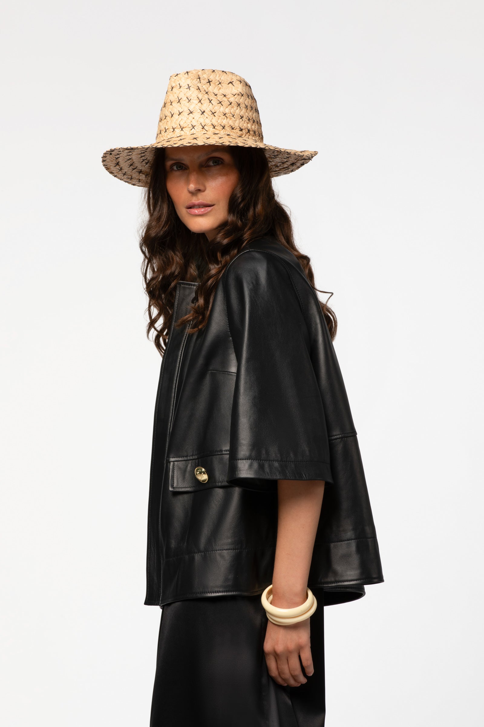 Polyvalente et facile à associer, notre veste en cuir pour femme VENGA se porte aussi bien avec un pantalon en soie, un jean blanc, ou une jupe longue et fluide, accompagnée de sandales compensées pour une silhouette audacieuse et raffinée.