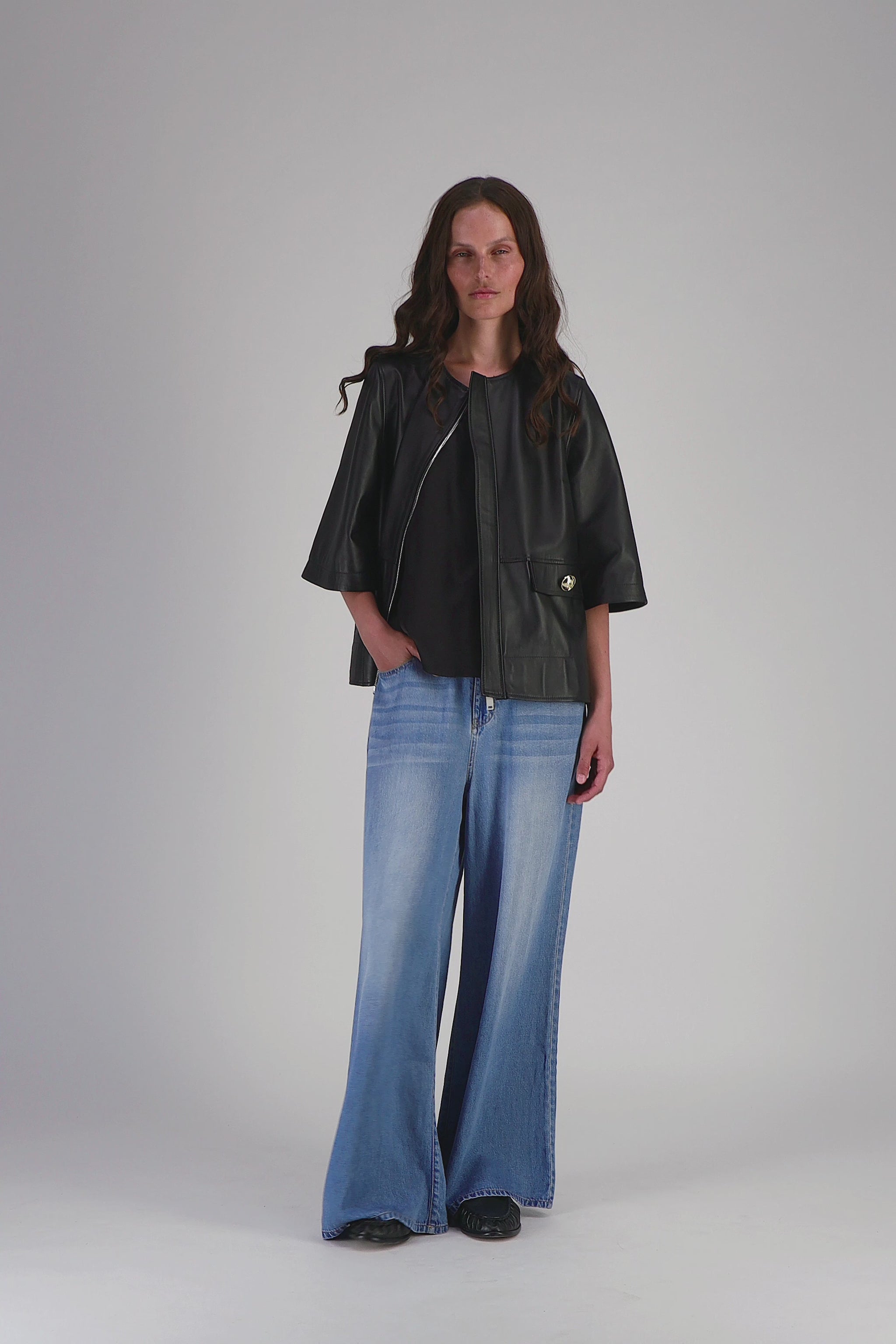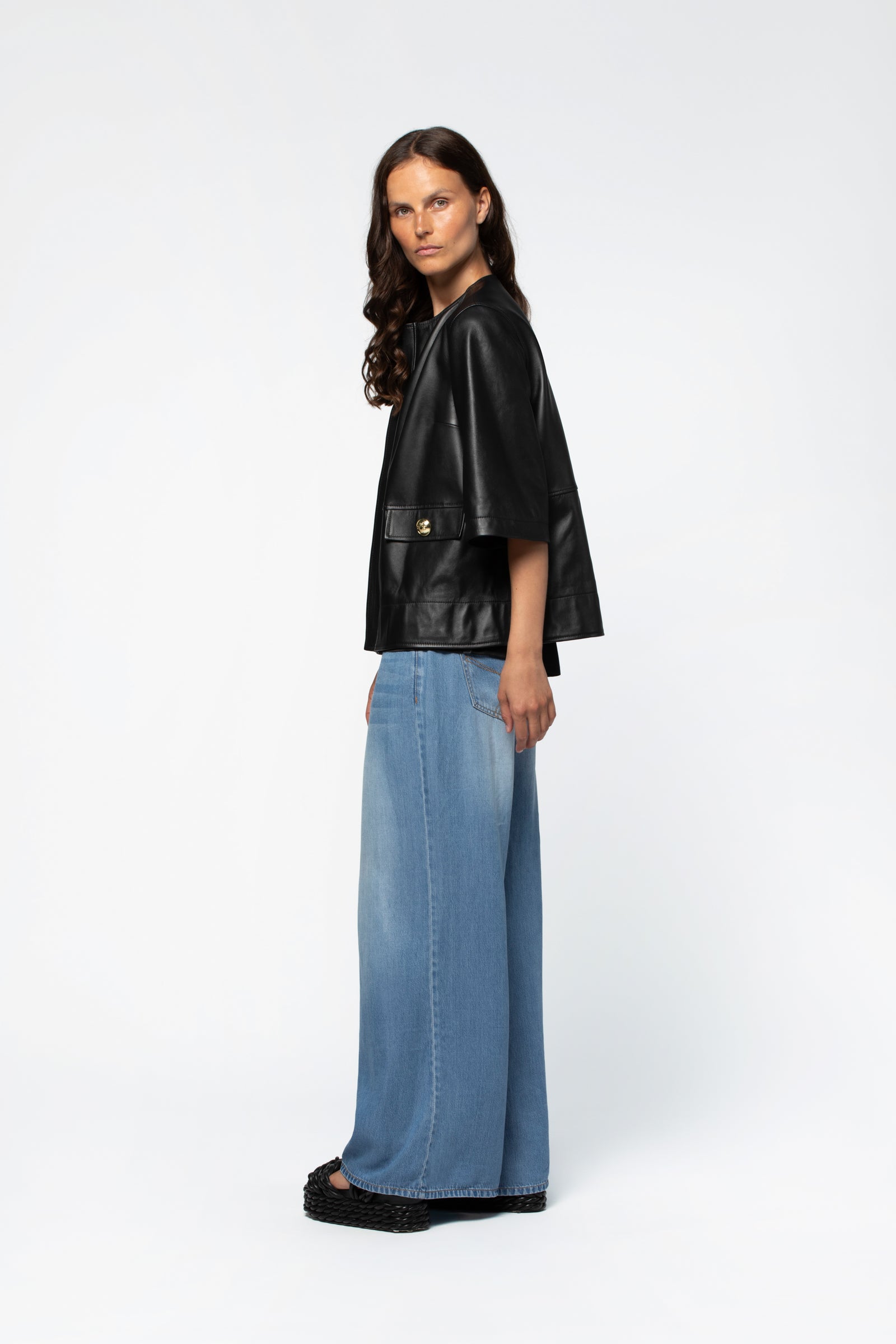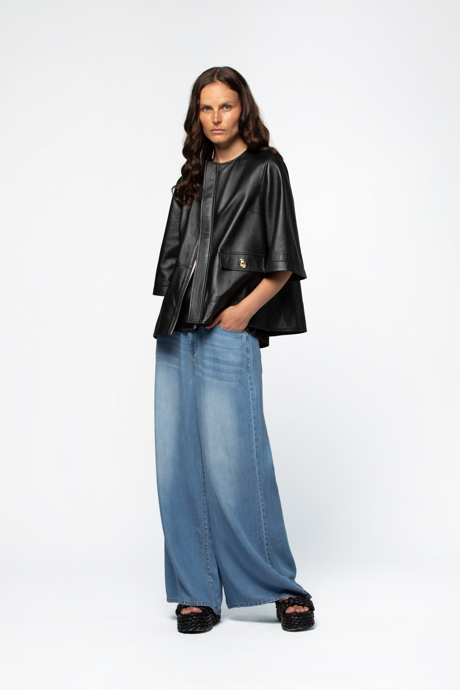 La veste VENGA en cuir d’agneau lisse affirme une allure contemporaine, à la croisée de l’élégance parisienne et d’un esprit office glam revisité. Sa coupe ample et structurée apporte modernité et confort, tout en mettant en valeur la noblesse du cuir. Équilibrant la souplesse naturelle du cuir d’agneau avec une ligne épurée, VENGA se distingue par son col rond élégant et ses manches courtes légèrement évasées, qui allègent la silhouette. La fermeture zippée est discrètement dissimulée sous une patte, pour un rendu net et minimaliste. Les fausses poches à rabat, soulignées par deux gros boutons dorés ornés du monogramme MAX&MOI, apportent une touche précieuse et affirment le caractère de la pièce. Les empiècements structurants, positionnés à partir des revers de poches, ainsi que les surpiqûres soignées, témoignent du savoir-faire exigeant de la Maison.