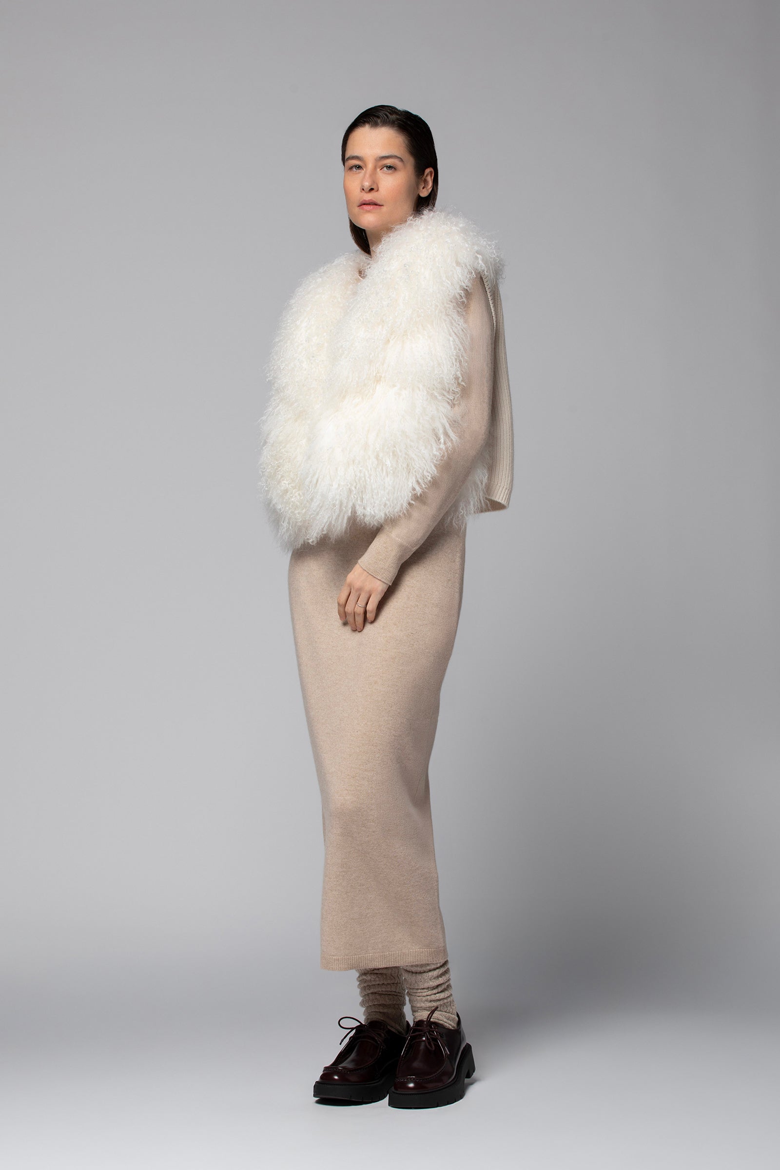 Notre veste sans manches VERENA séduit par son design bi-matière au caractère affirmé. Sur le devant, une somptueuse fourrure de chèvre cachemire attire tous les regards. À l’arrière, une maille en côtes anglaises, tricoté en laine et cachemire, épouse les lignes du dos avec souplesse et assure un tombé impeccable. Son large col structure la silhouette et habille instantanément l'allure. Avec son volume généreux, sa coupe enveloppante et sa texture irrésistible, cette veste sans manches insufflera une note résolument chic à votre vestiaire.