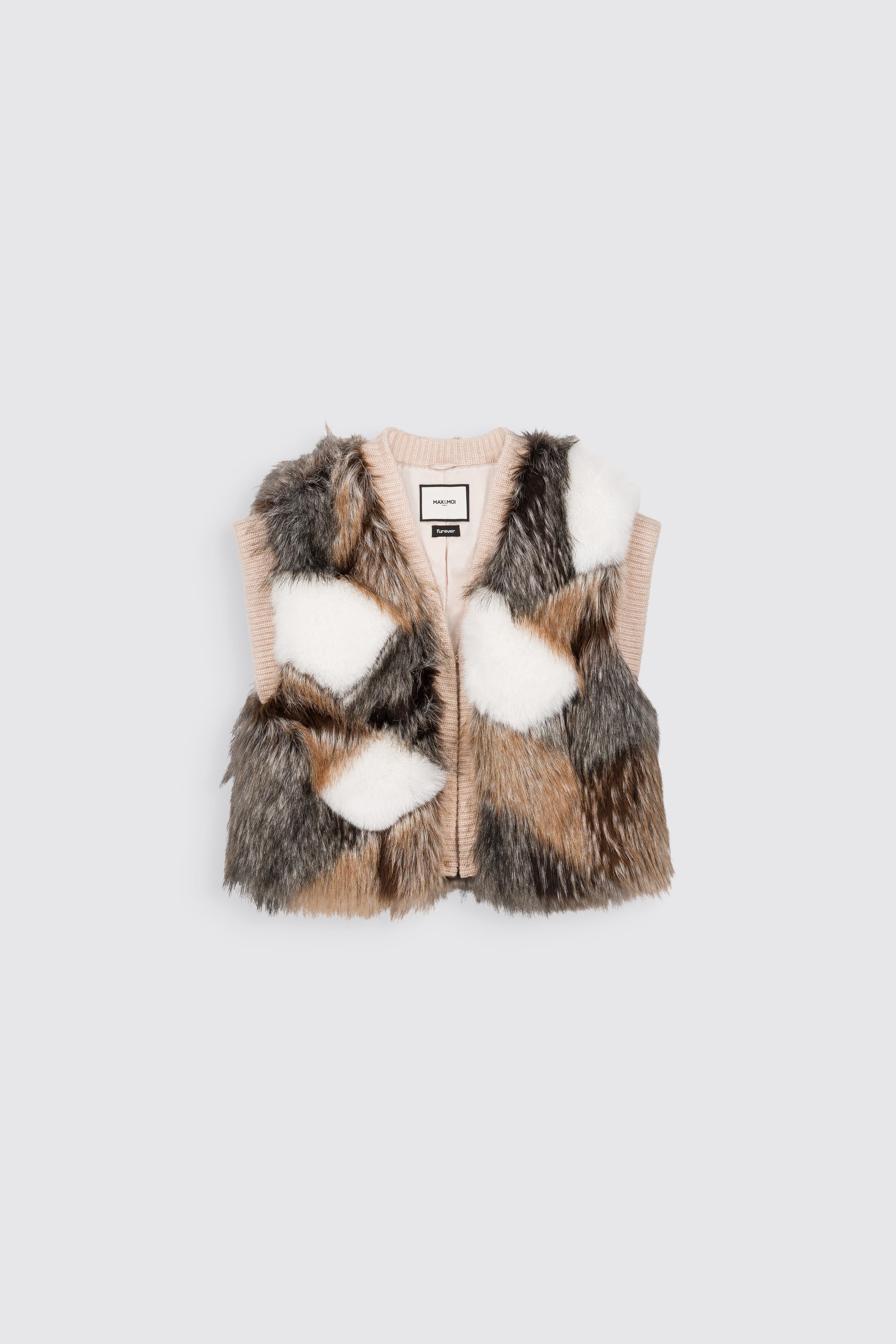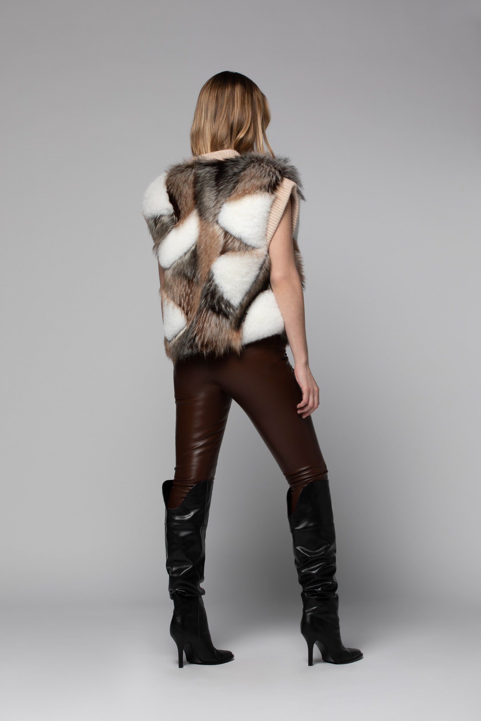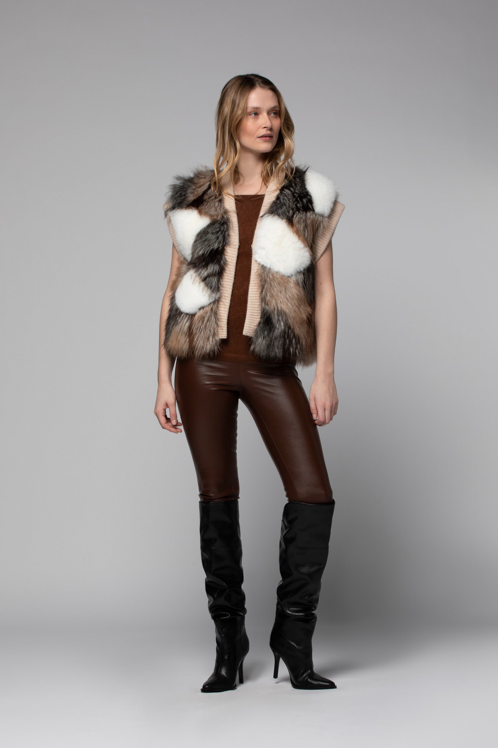 Notre veste VILMA signe un vestiaire chic et affirmé. Confectionnée dans une fausse fourrure à la texture duveteuse, cette veste sans manches séduit par son jeu de contrastes graphique et raffiné : un patchwork de teintes naturelles — blanc, brun, noir et gris. Sa coupe droite, légèrement amplifiée, se superpose aisément à une maille fine ou un col roulé. Elle se porte ouverte ou fermée grâce à un crochet discret, pour une silhouette plus ajustée. Ses finitions côtelée beige, confectionnée dans une maille en laine et cachemire, adoucissent ses lignes avec modernité.