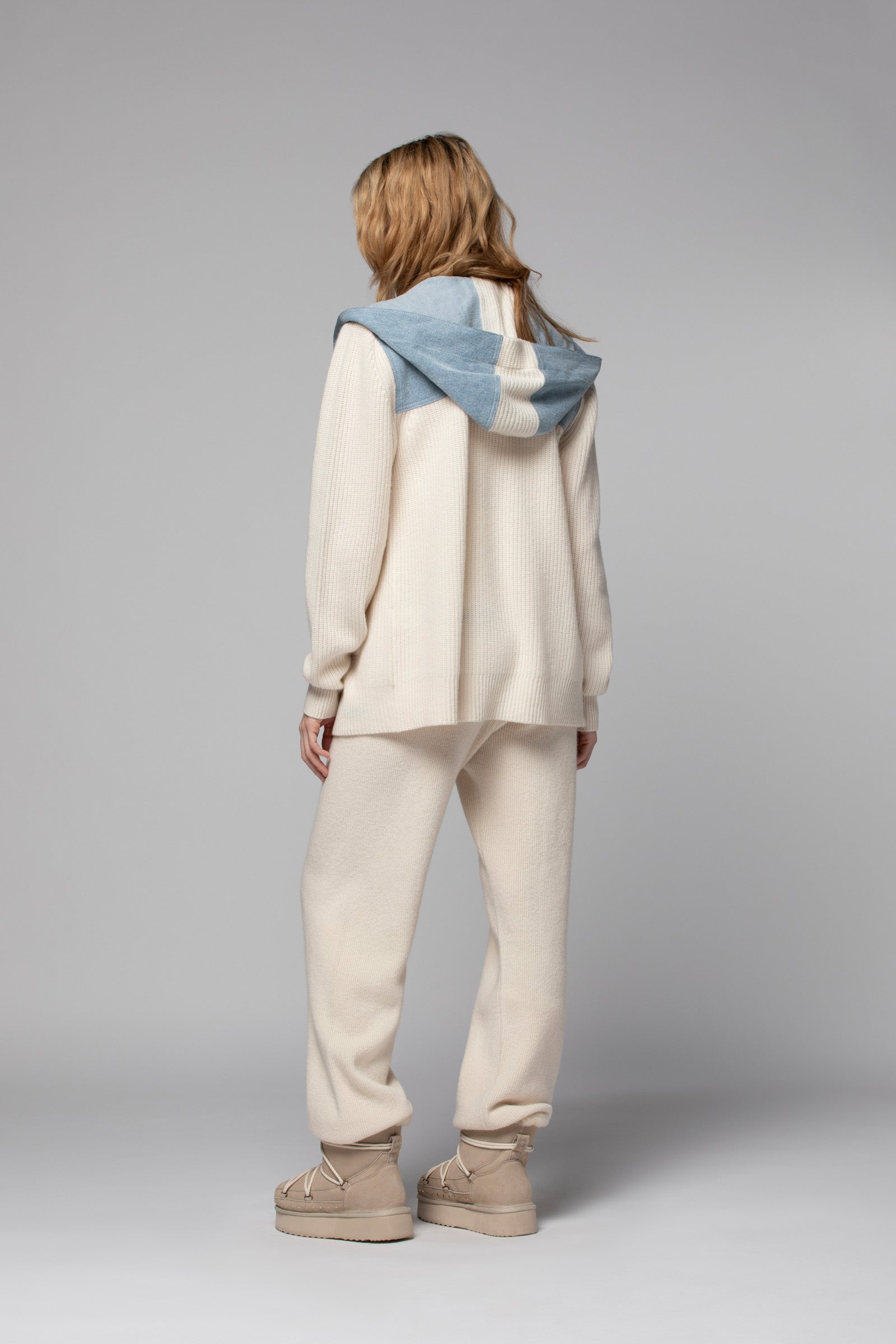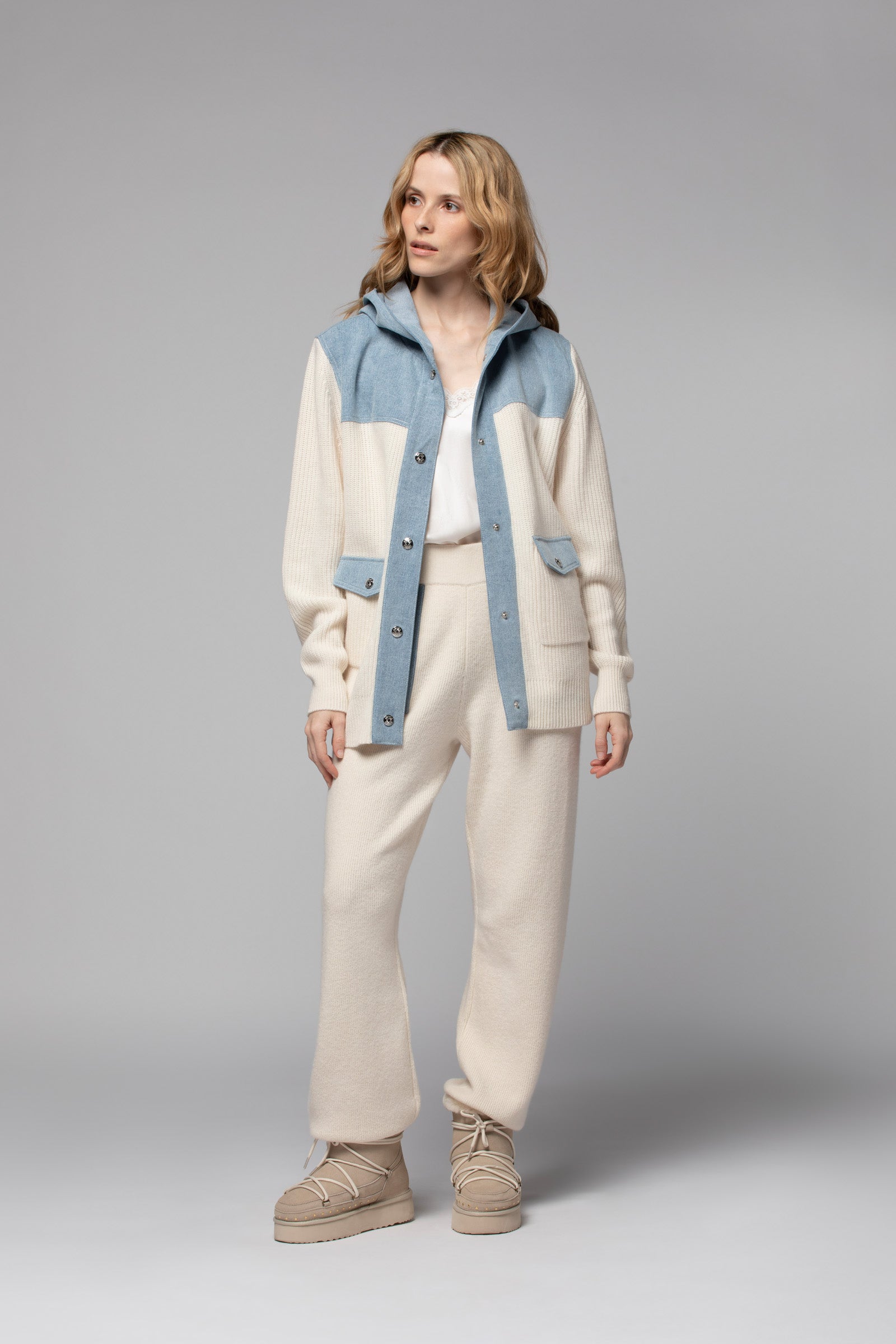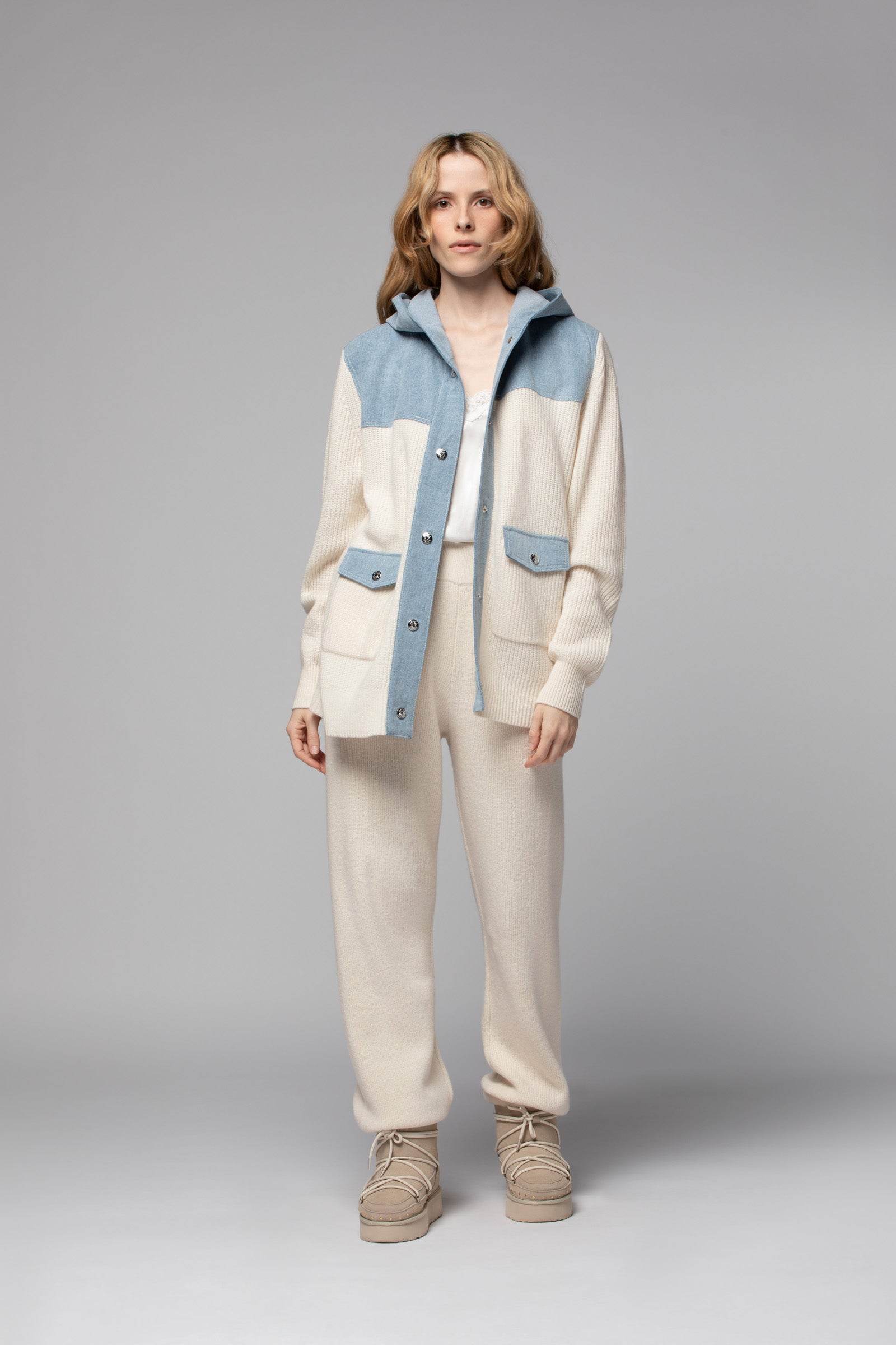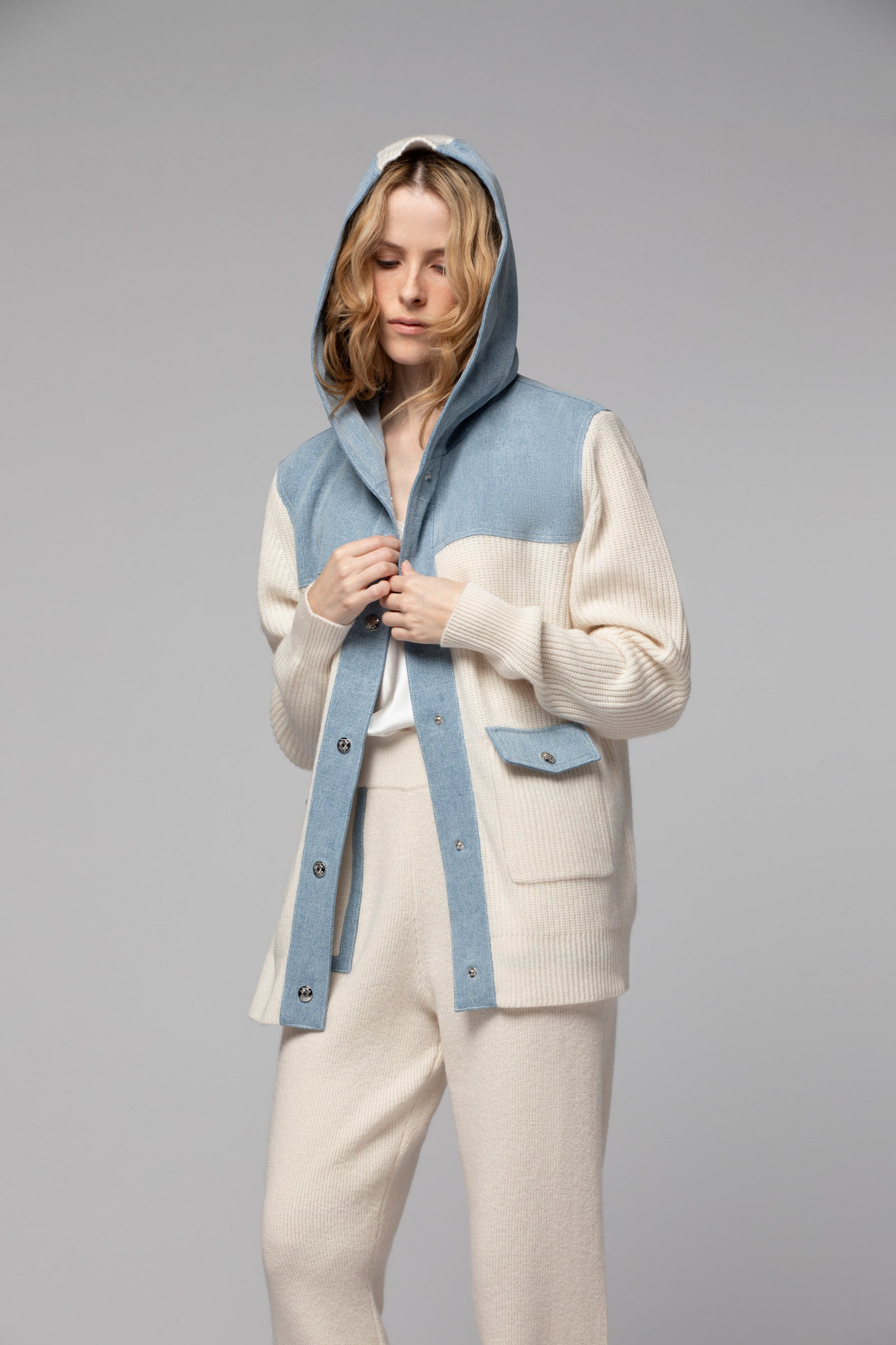 Coupe surchemise, détails contrastés, esprit effortless : notre veste VIXY s’impose comme une pièce phare du vestiaire citadin. Tricotée dans un doux mélange de laine et cachemire, elle séduit par sa maille en côte anglaise raffinée, tandis que des empiècements en denim modernisent ses lignes et affirment toute sa singularité. Deux poches plaquées sur le devant et une capuche en denim, habillée en rappel d’une bande en maille graphique, viennent parfaire le modèle.